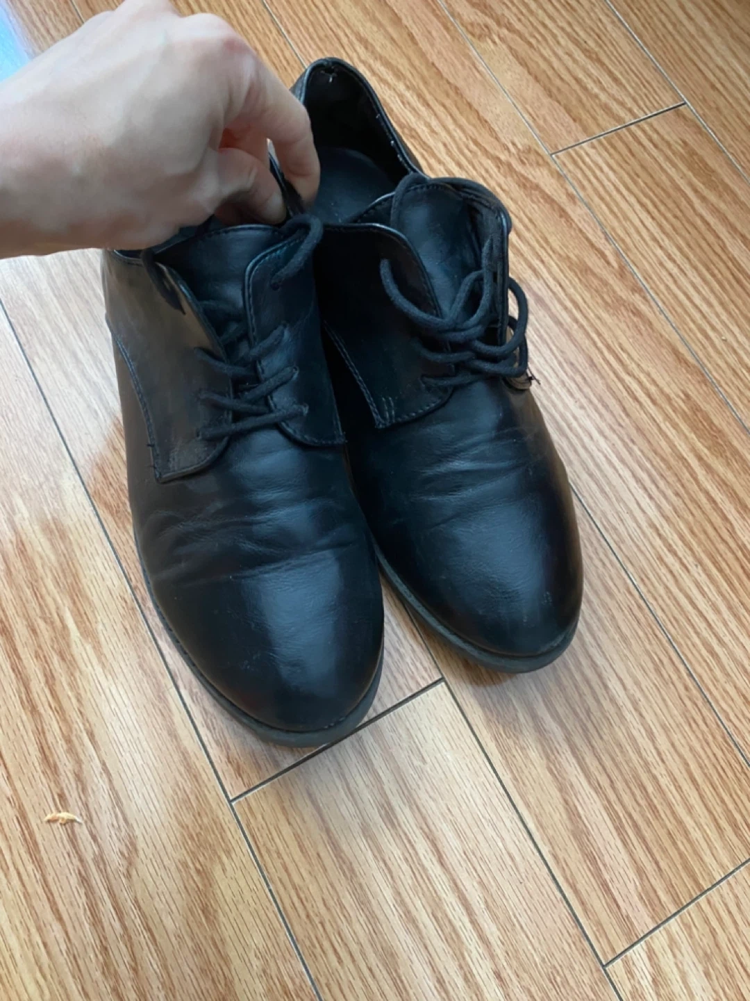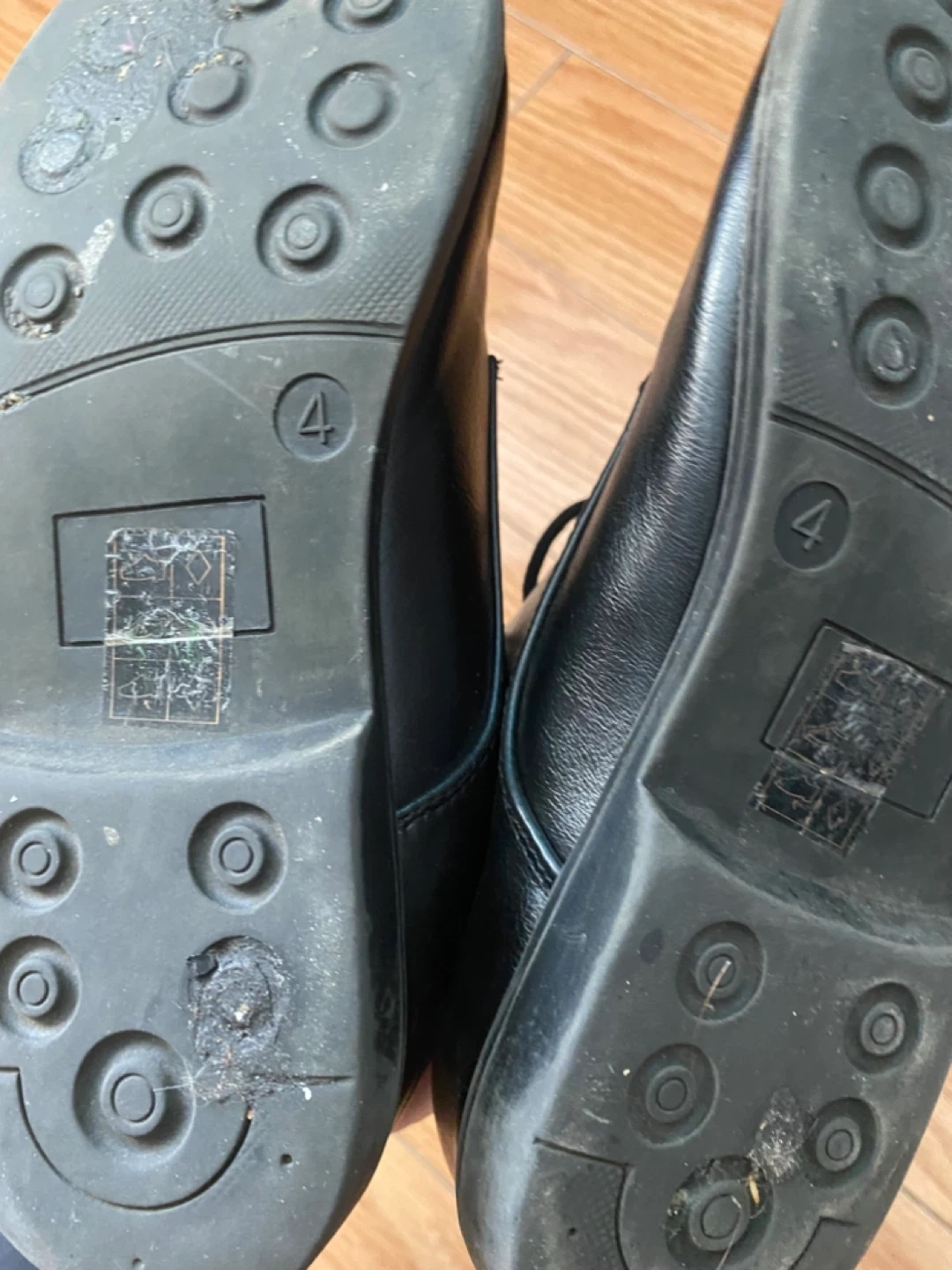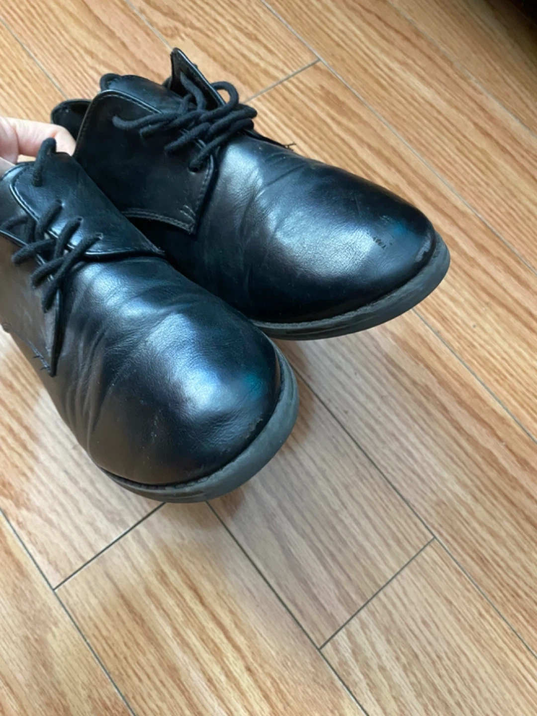 Selling a pair of black leather dress shoes. They are a size 4 and show some signs of wear, as seen in the photos. Still lots of life left in them!