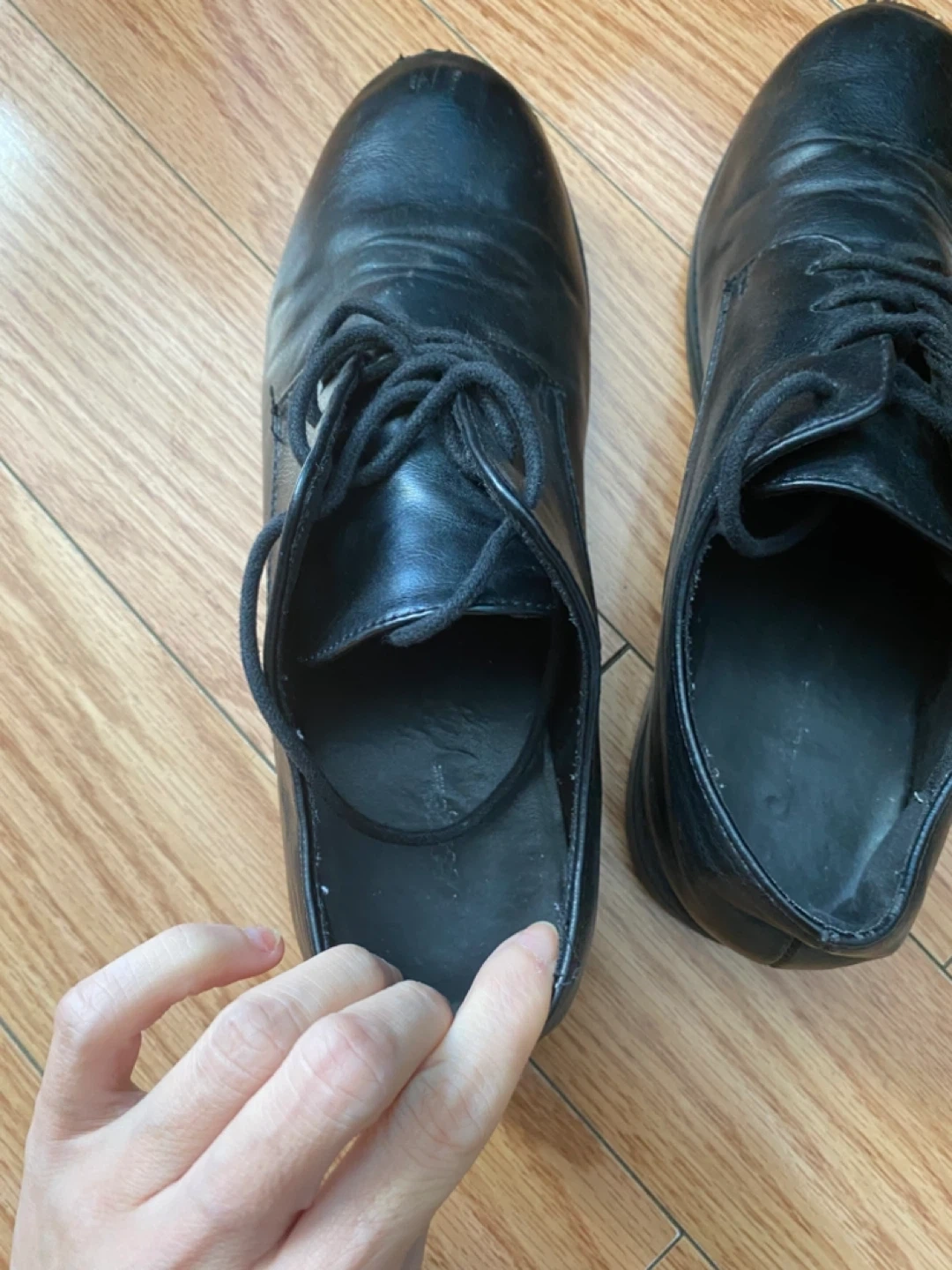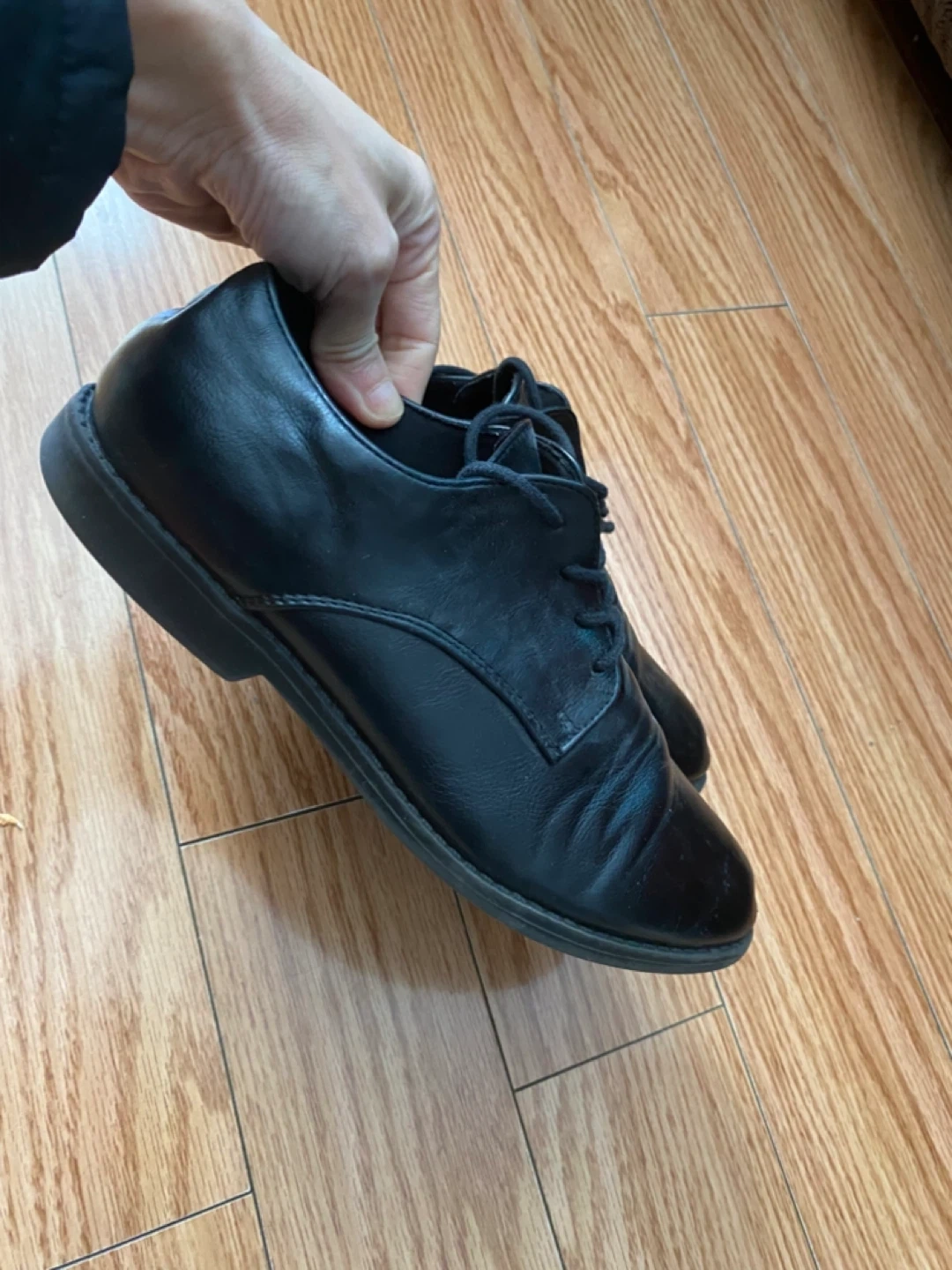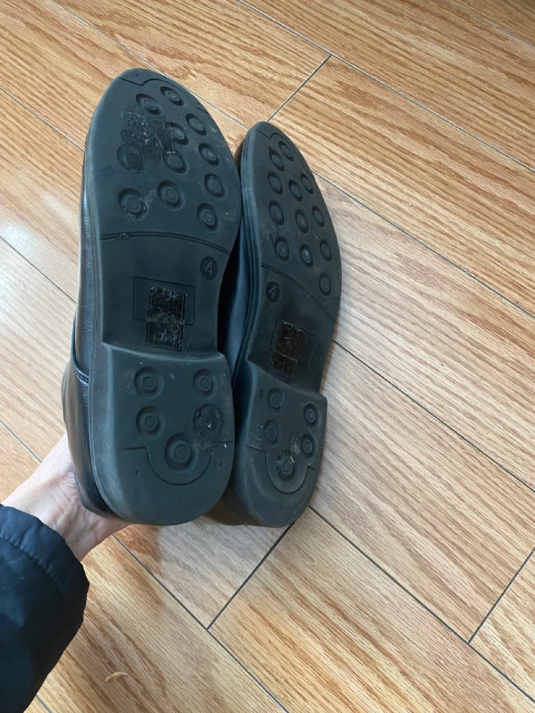 Selling a pair of black leather dress shoes. They are a size 4 and show some signs of wear, as seen in the photos. Still lots of life left in them!