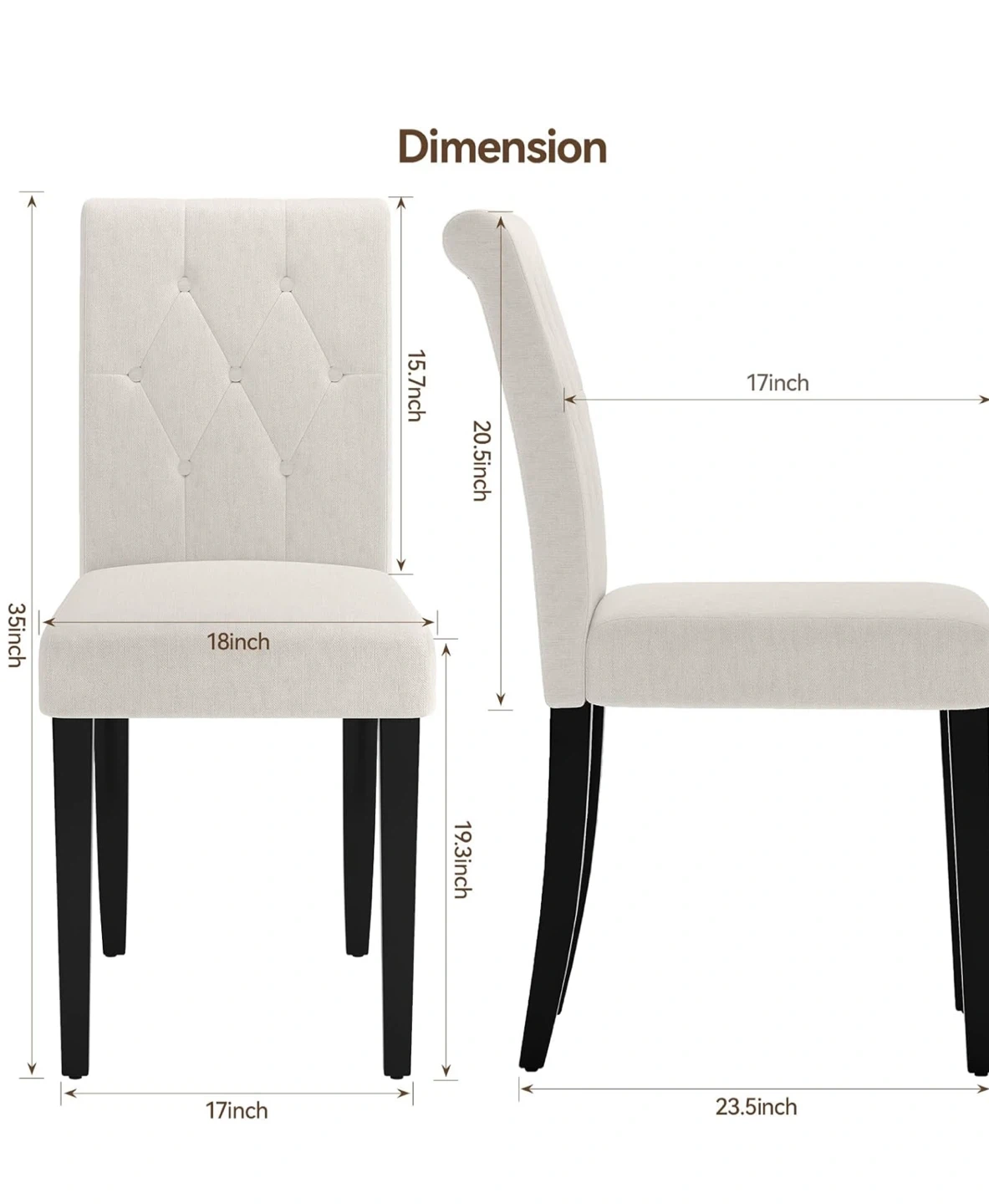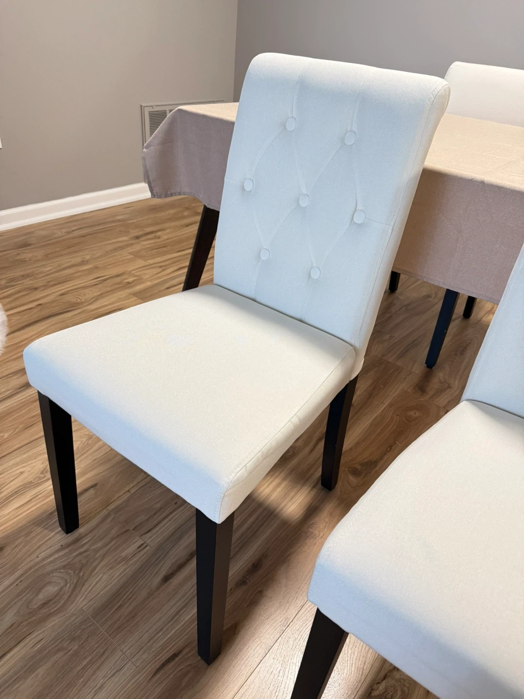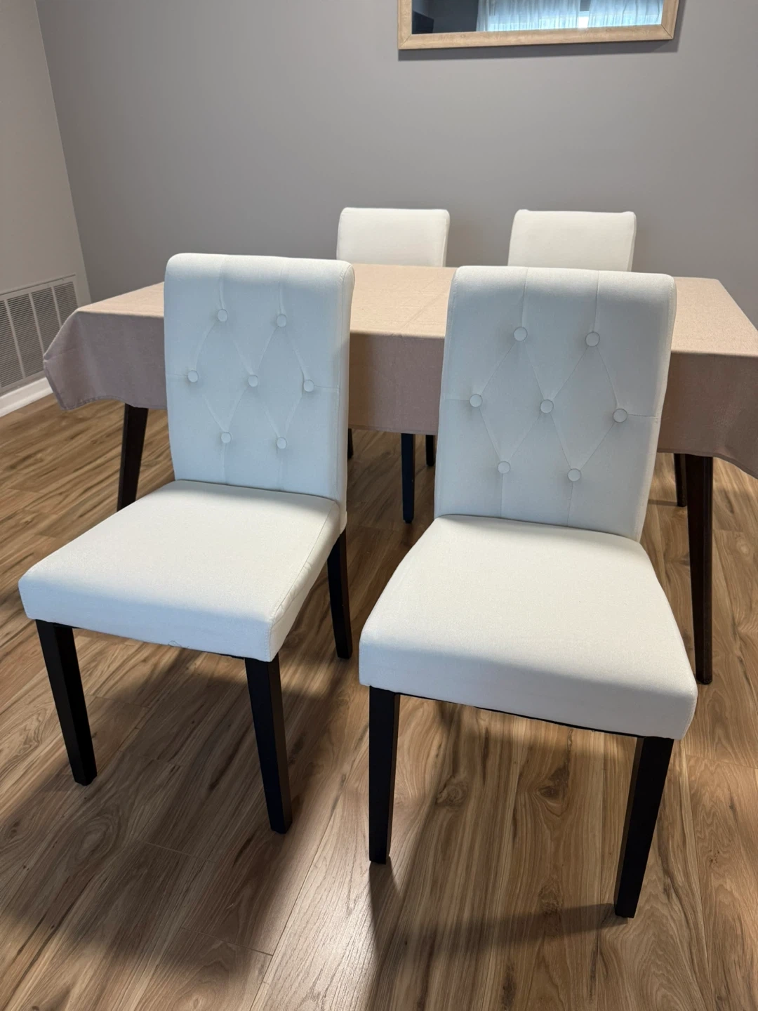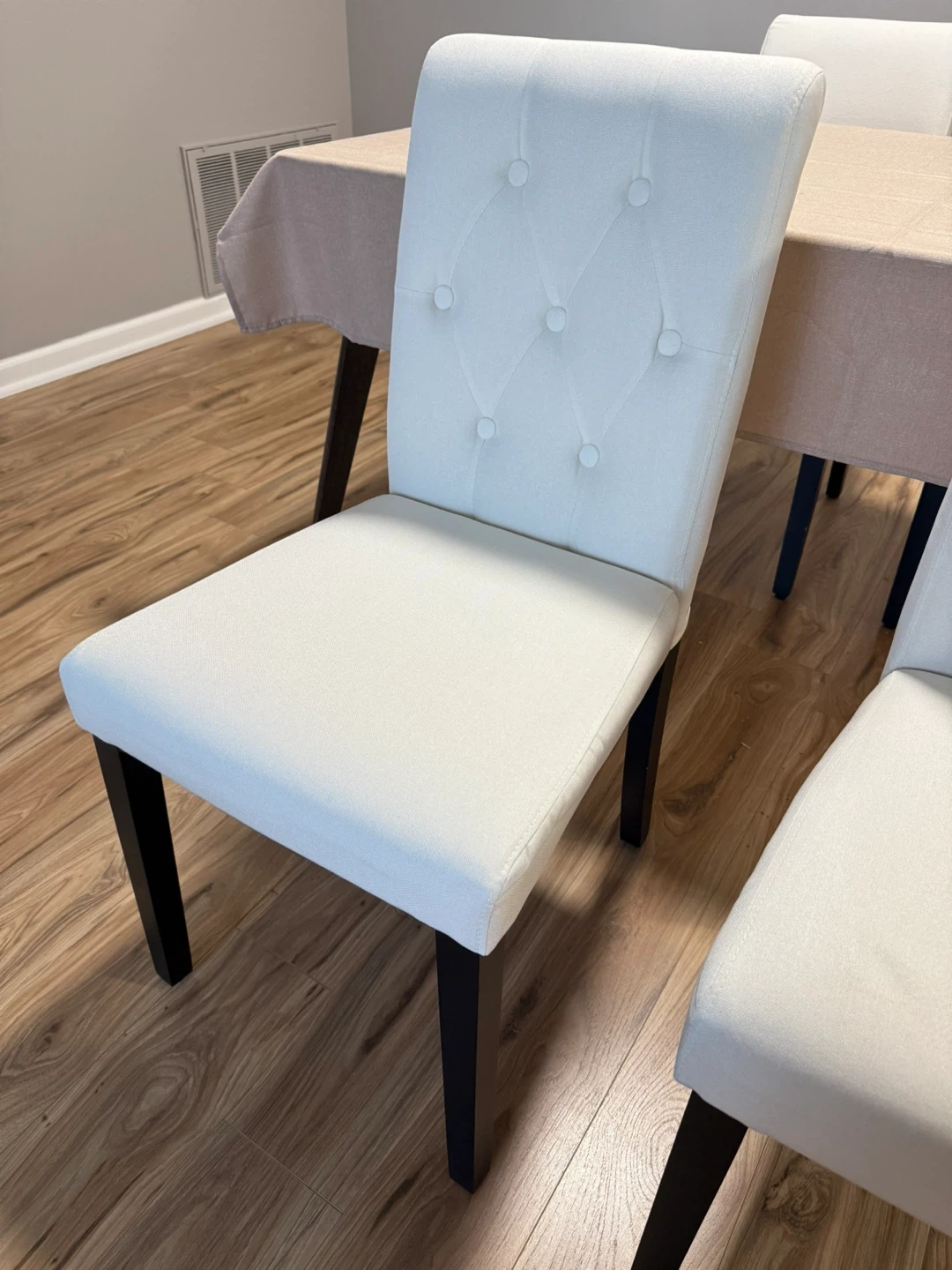 Selling comfortable dining chairs with tufted backrests. Features dark wooden legs for stability. Seat dimensions are 17"x18". Backrest height is 15.7".