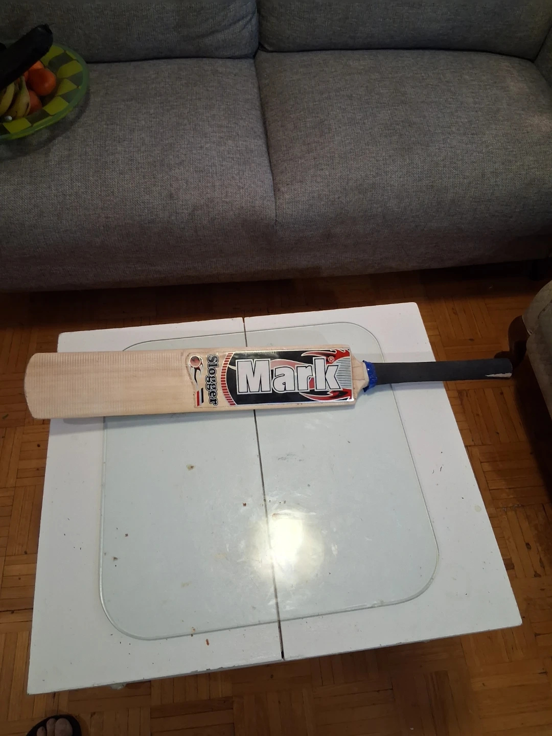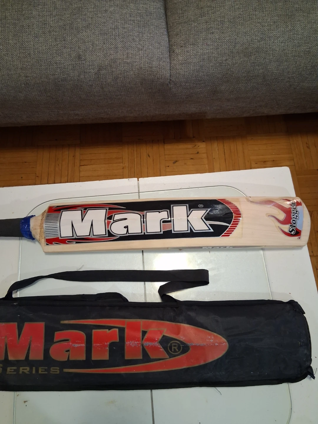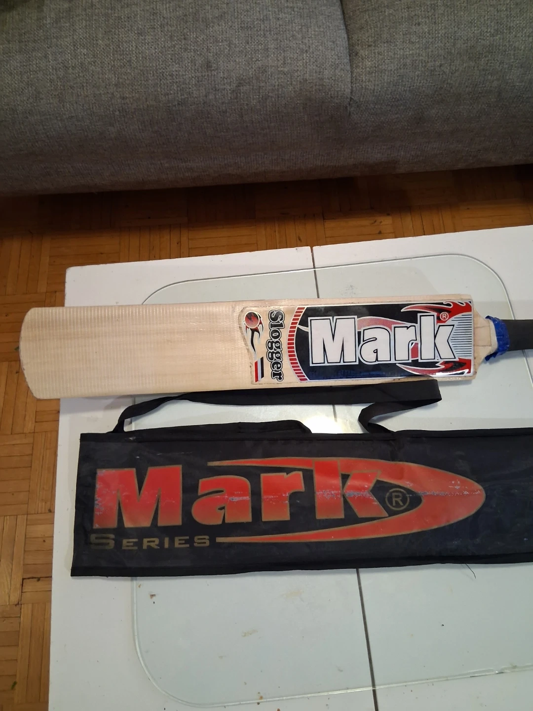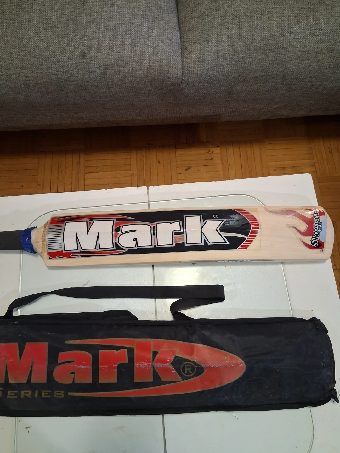 This is a "Slugger" model cricket bat by Mark. It includes a padded "Mark Series" cover. The bat is made of wood.