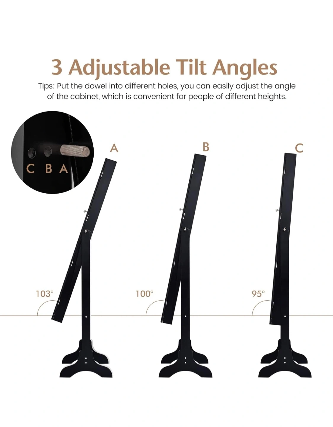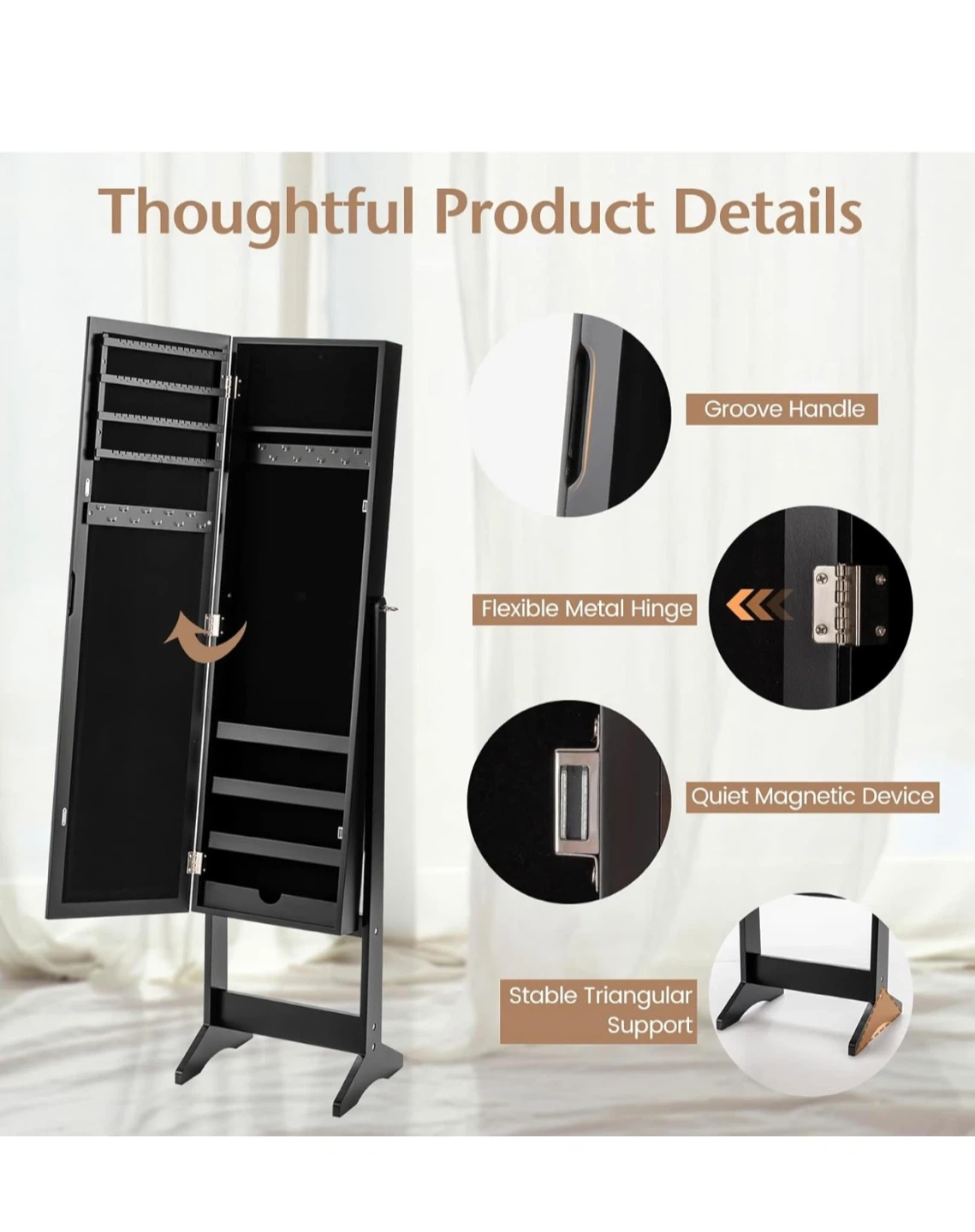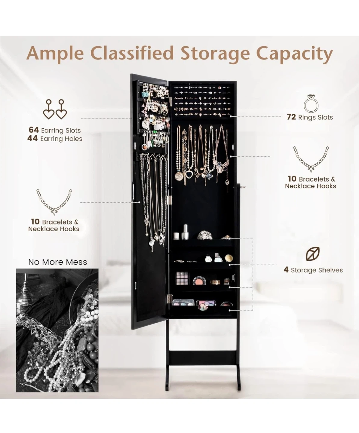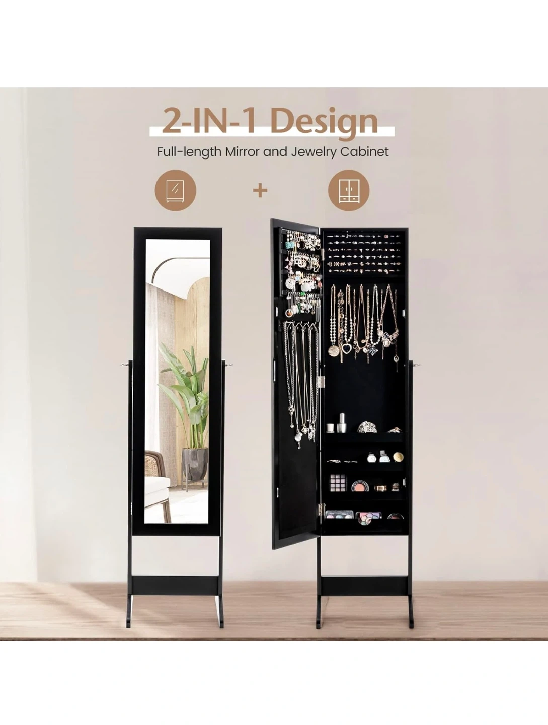 This 2-in-1 design features a full-length mirror and a spacious jewelry cabinet. It offers ample storage for your accessories with adjustable tilt angles for convenient viewing. The cabinet is designed with a groove handle, flexible metal hinge, and a quiet magnetic device for secure closure.