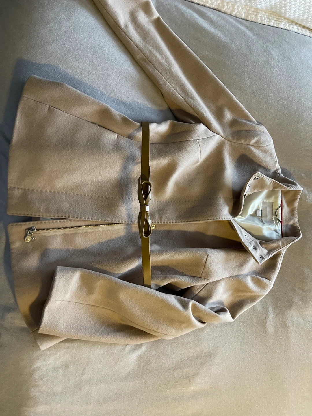 Stylish beige jacket (size Large) with a matching belt. It's made from a soft material (wool/polyester blend) and features a zip-up front with snaps. Perfect for layering over outfits.