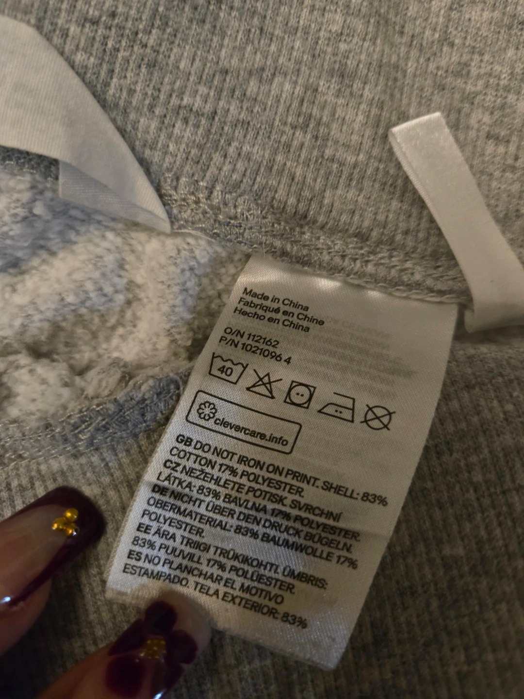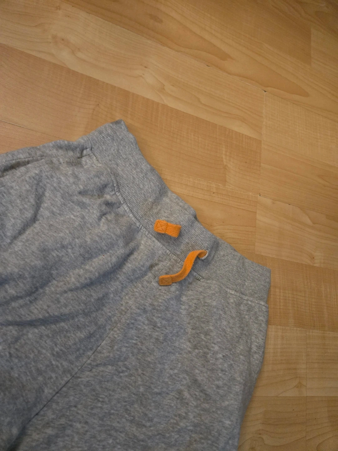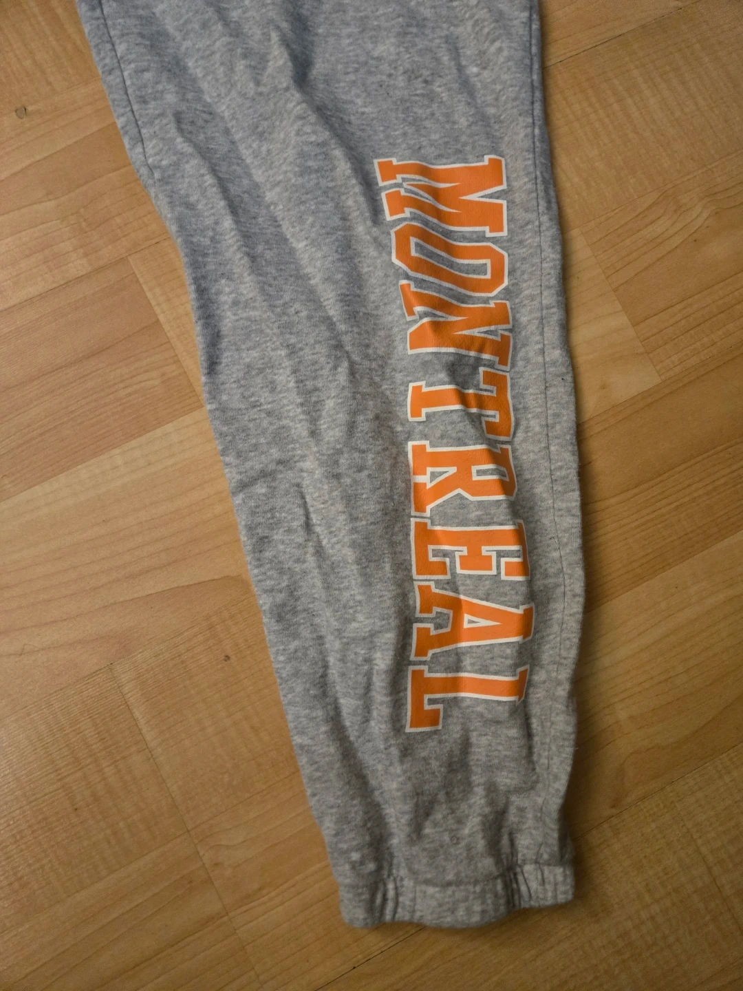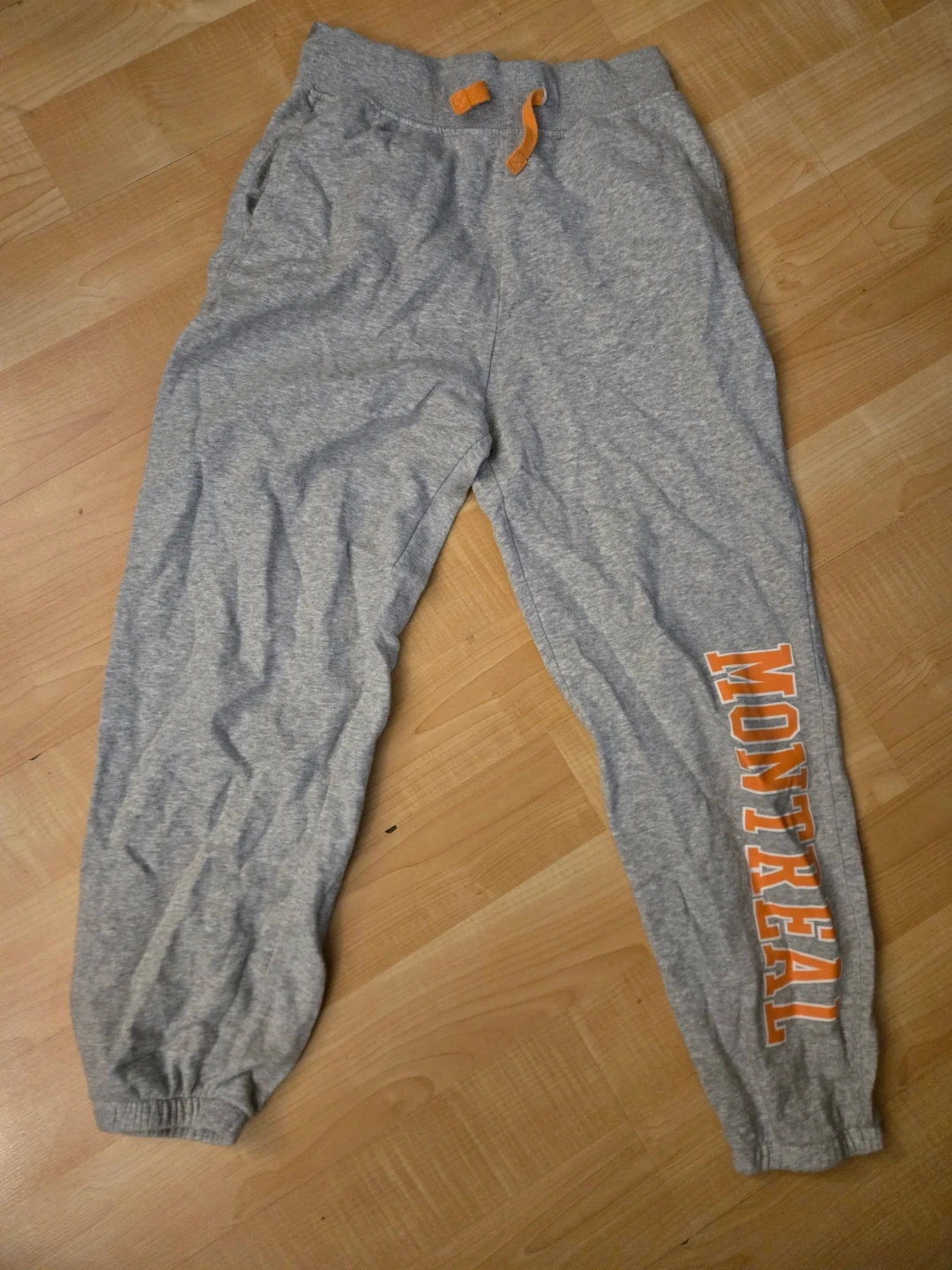 Gray H&M joggers with 'Montreal' printed on the leg. Cotton and polyester blend. Elastic waistband with drawstring. Ribbed cuffs.
