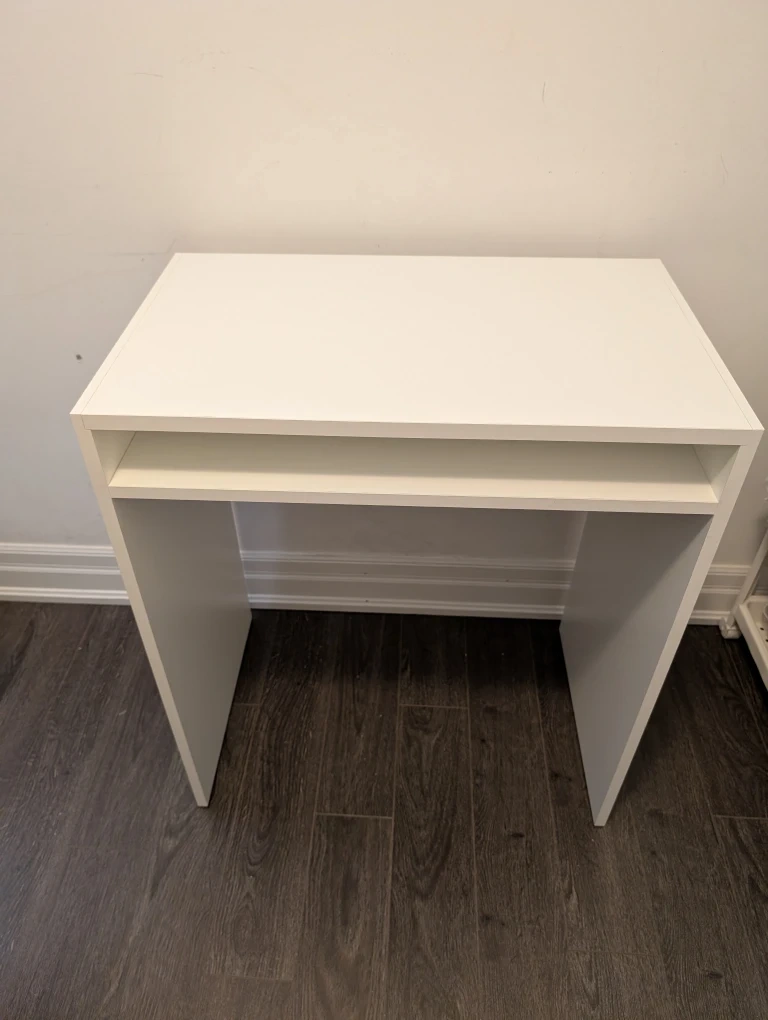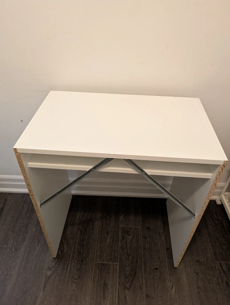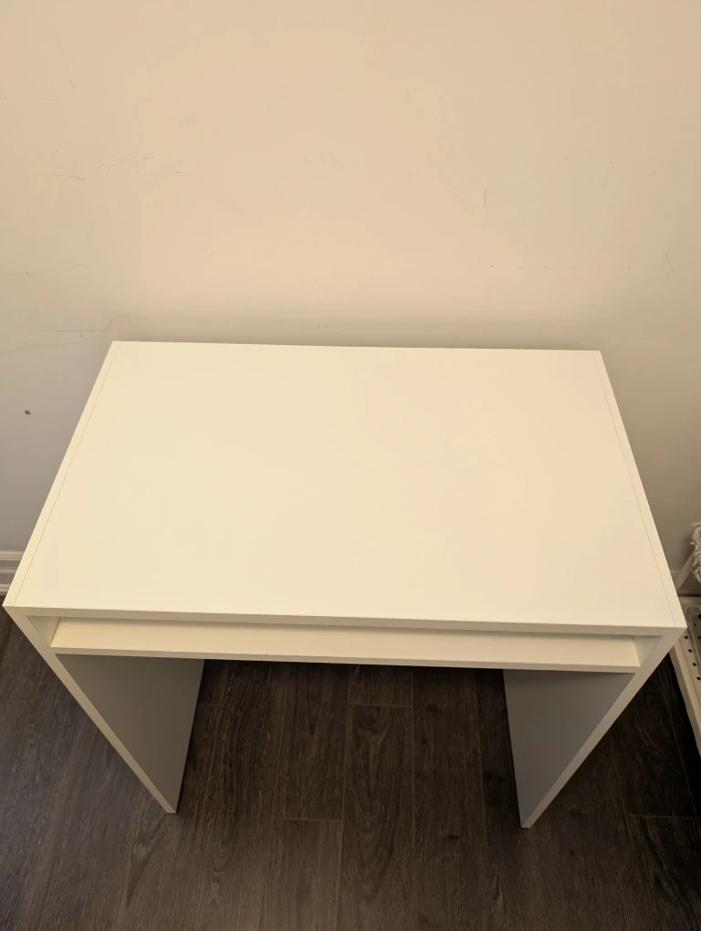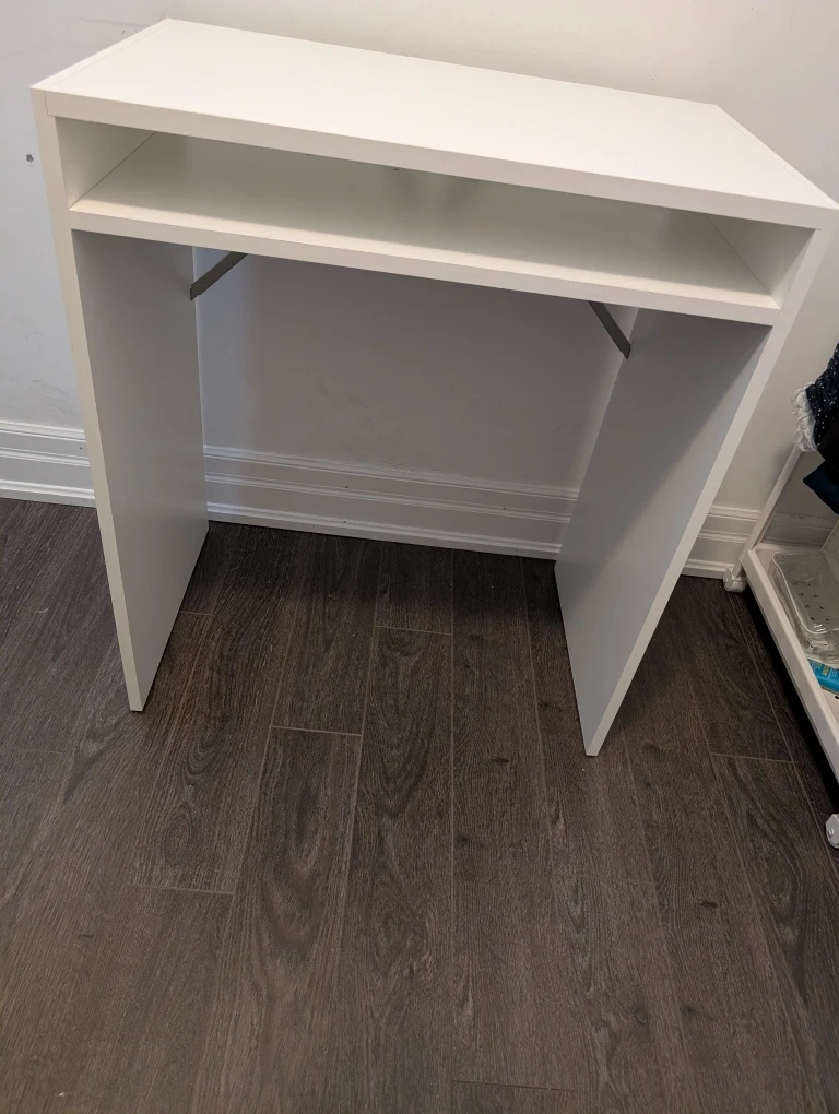 Selling a simple white desk! It's in great shape and ready for a new home. Perfect for a small workspace or student. Can be used has work table.