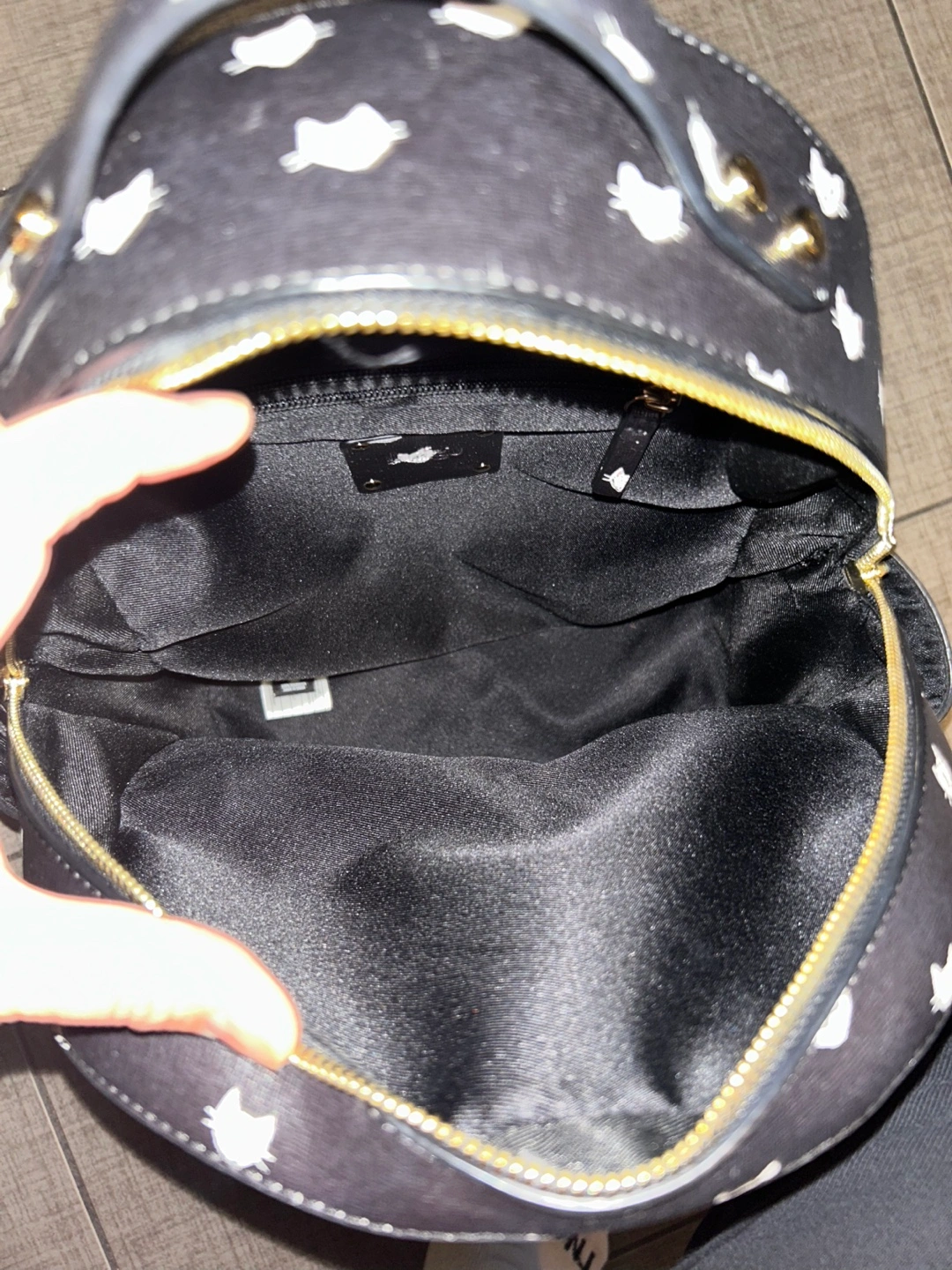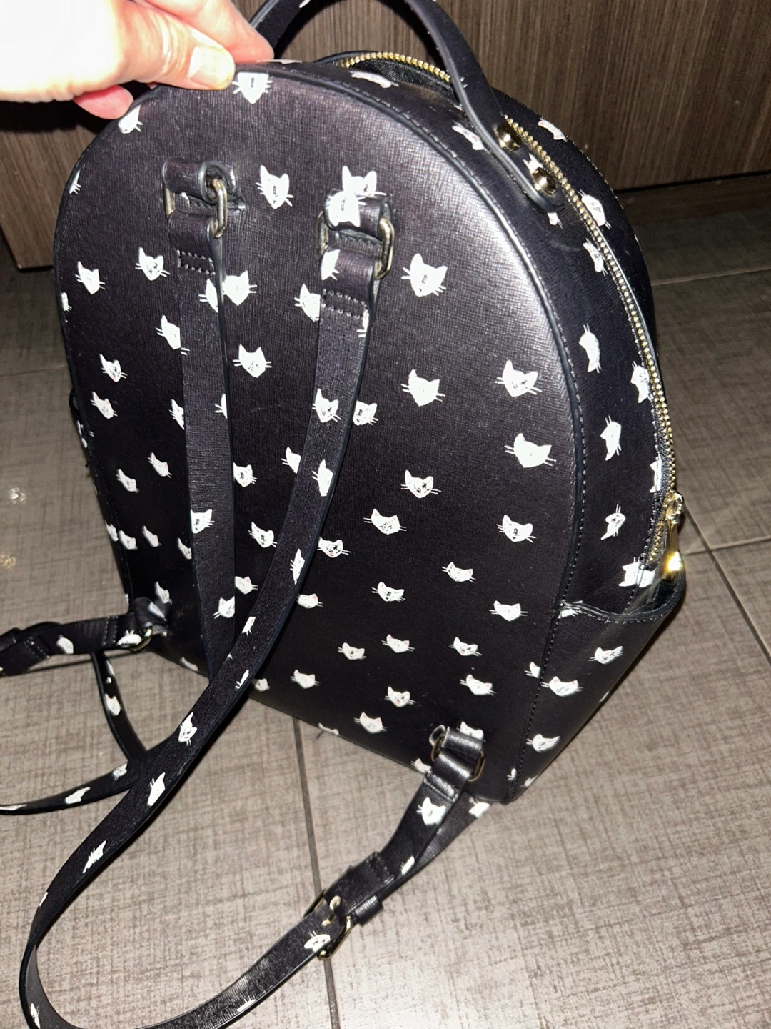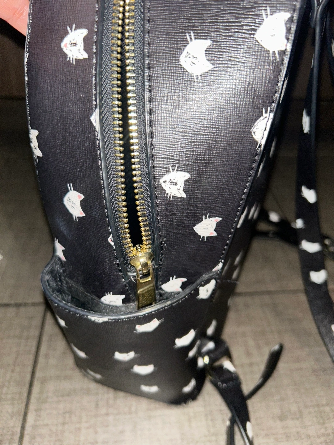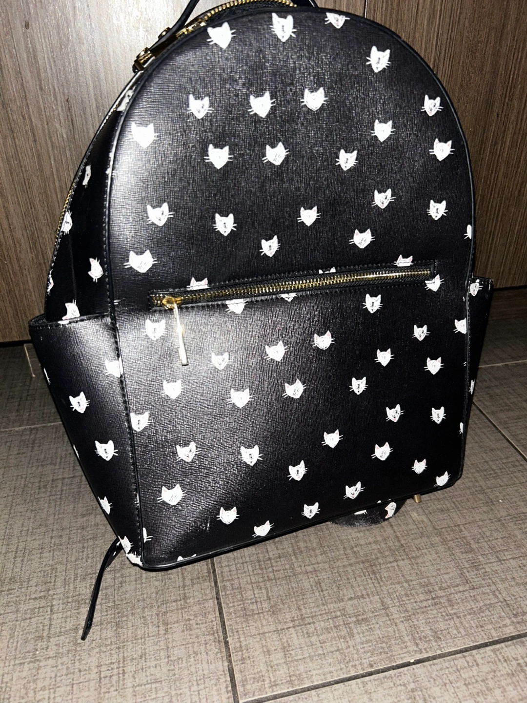Cute black backpack. Features a cat print and. Adjustable straps. Small front pocket and 2 side pockets. Spacious main compartment with small pocket inside.