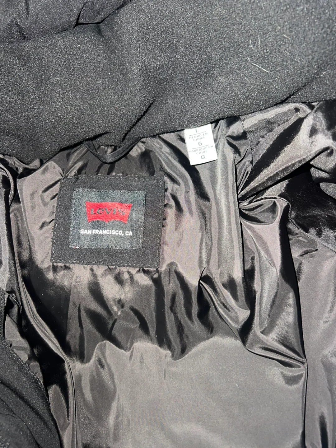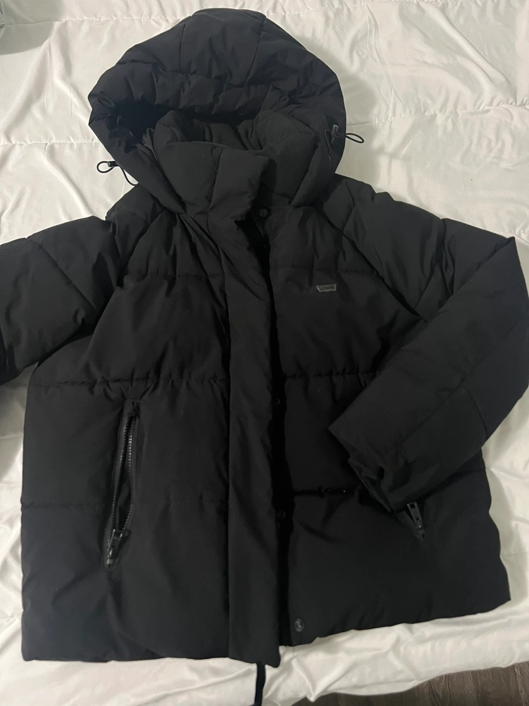 Black puffer winter jacket from Levi's. Hooded design with zipper closure and multiple pockets. Size large. Unisex