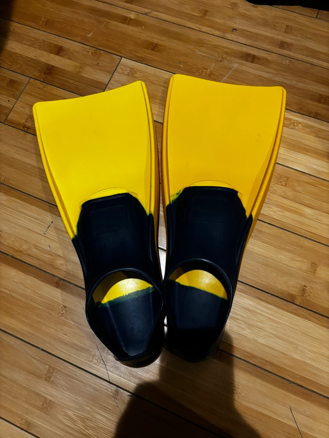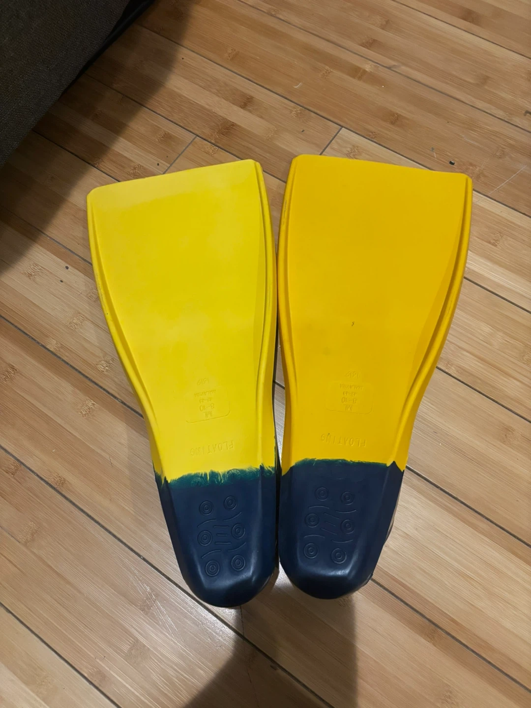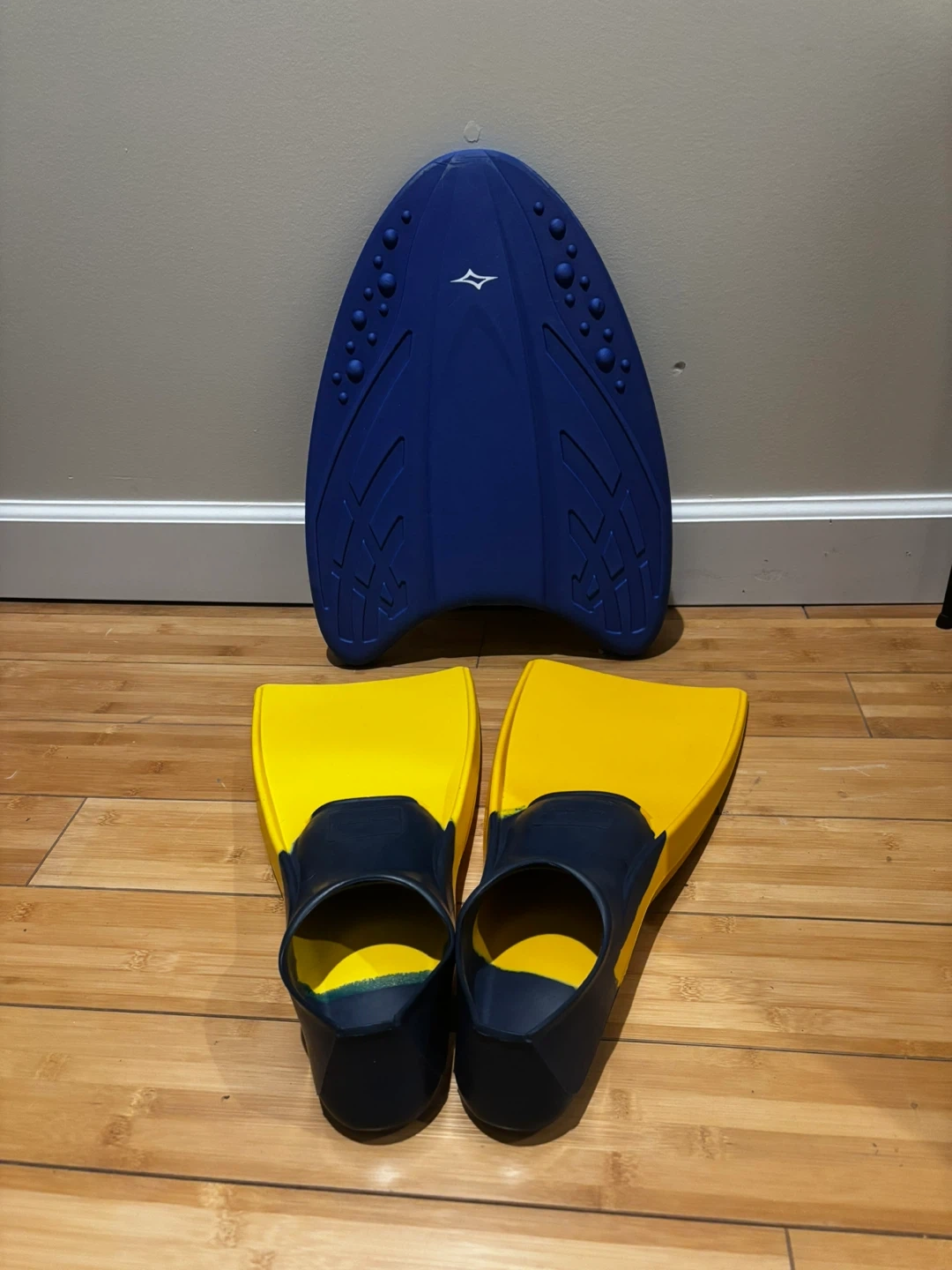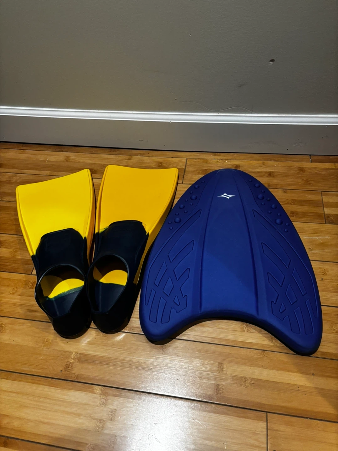 Blue Speedo kickboard and yellow swim fins. Fins are size ML (US Men's 8-10, US Women's 9.5-11.5, EU 42-43). Designed for swimming practice.