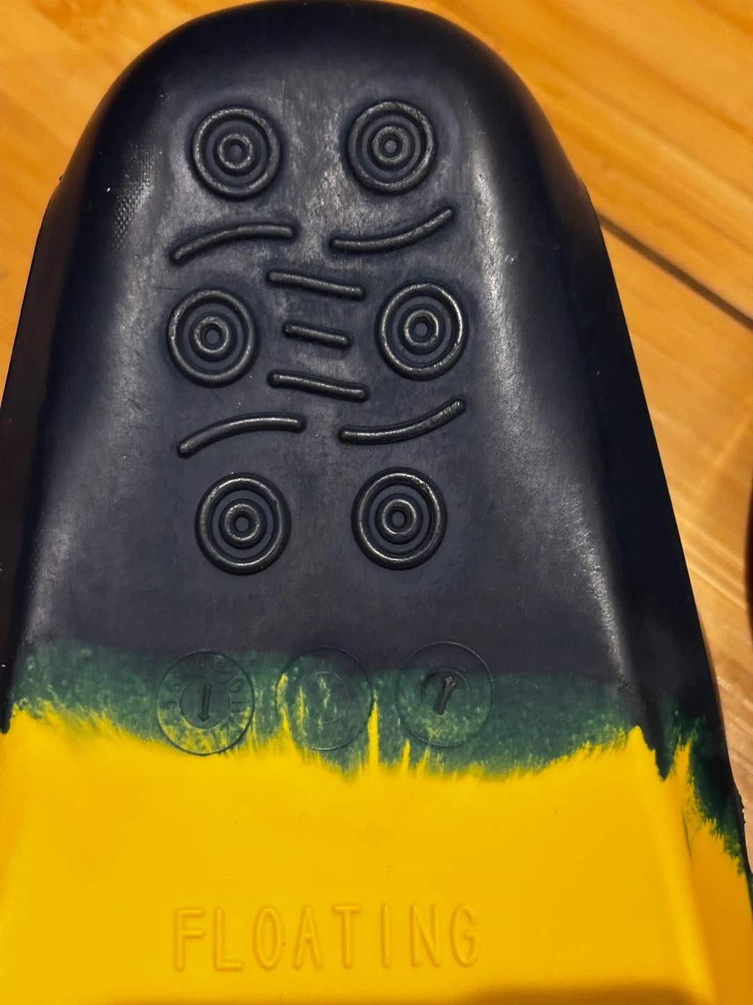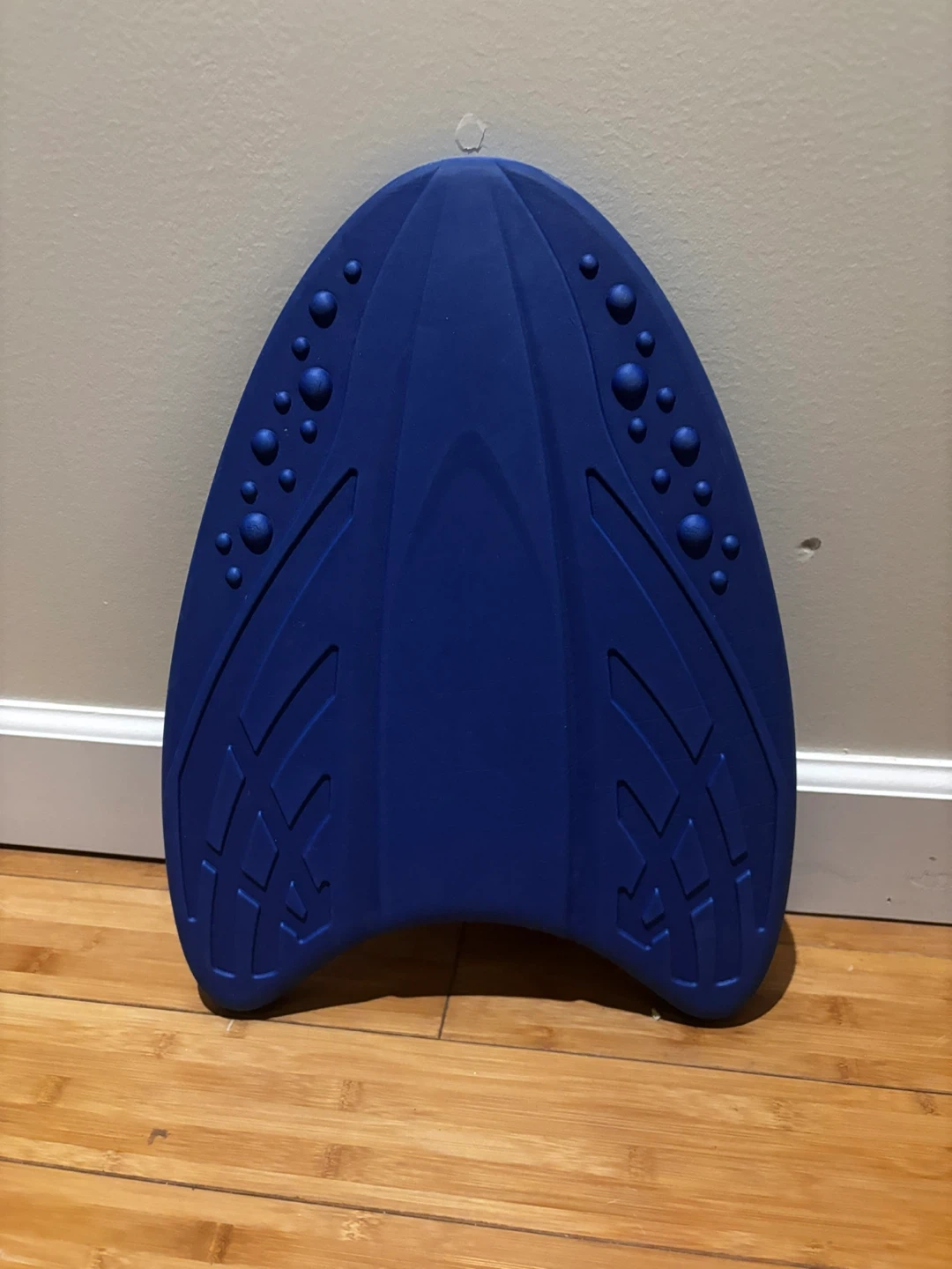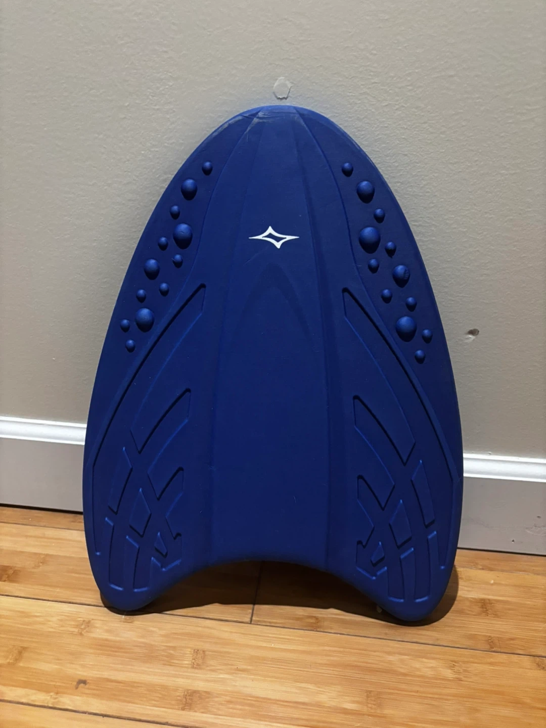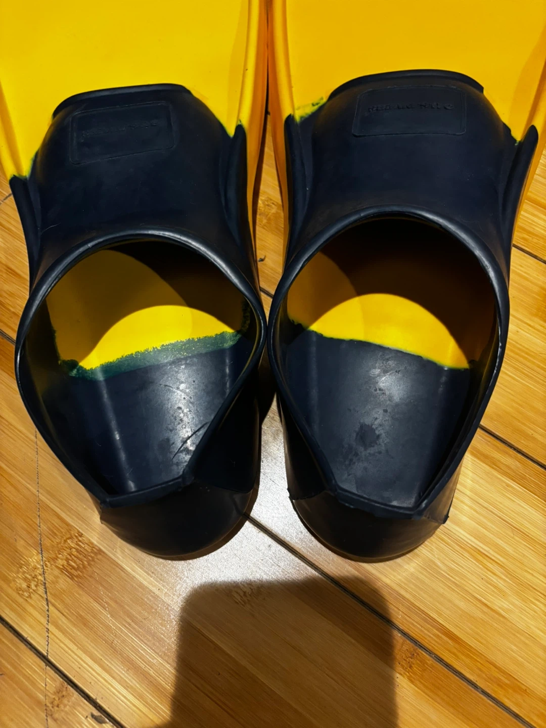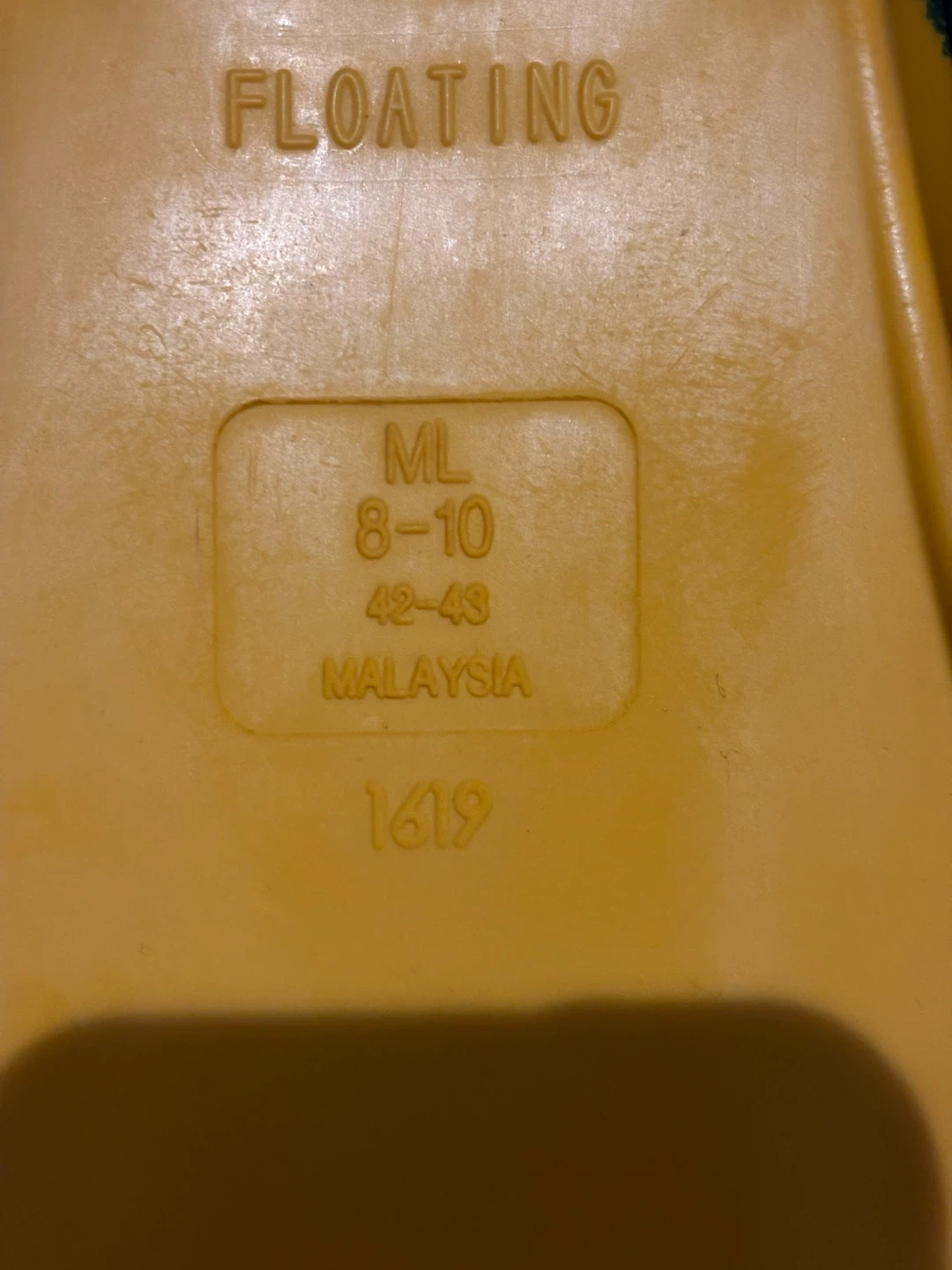 Blue Speedo kickboard and yellow swim fins. Fins are size ML (US Men's 8-10, US Women's 9.5-11.5, EU 42-43). Designed for swimming practice.
