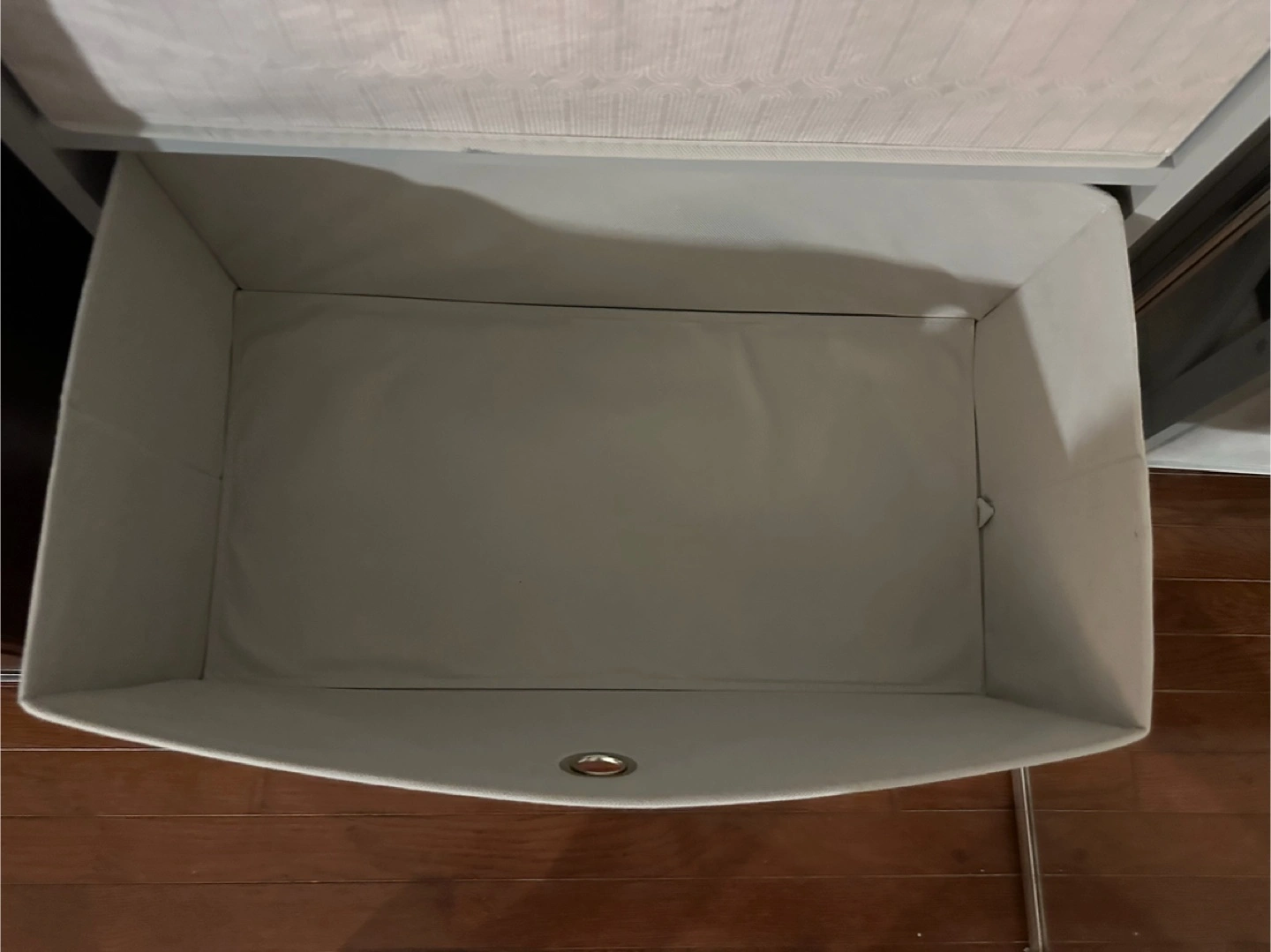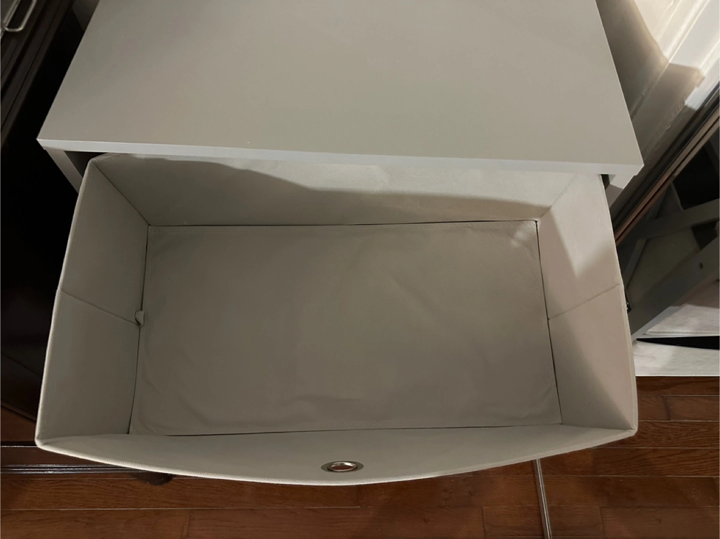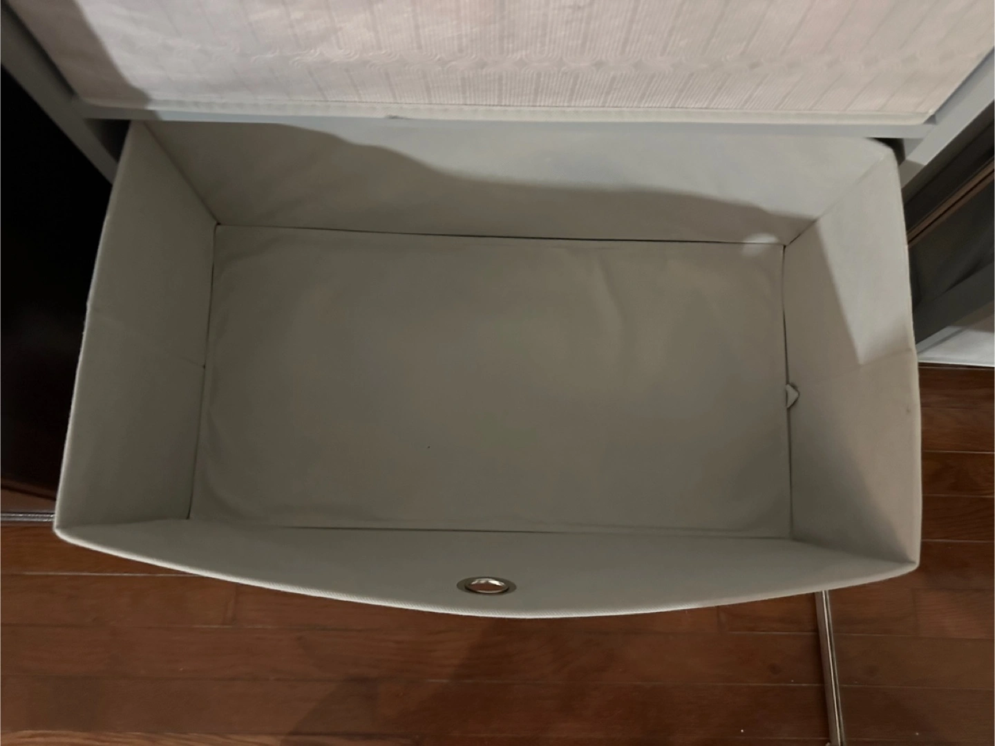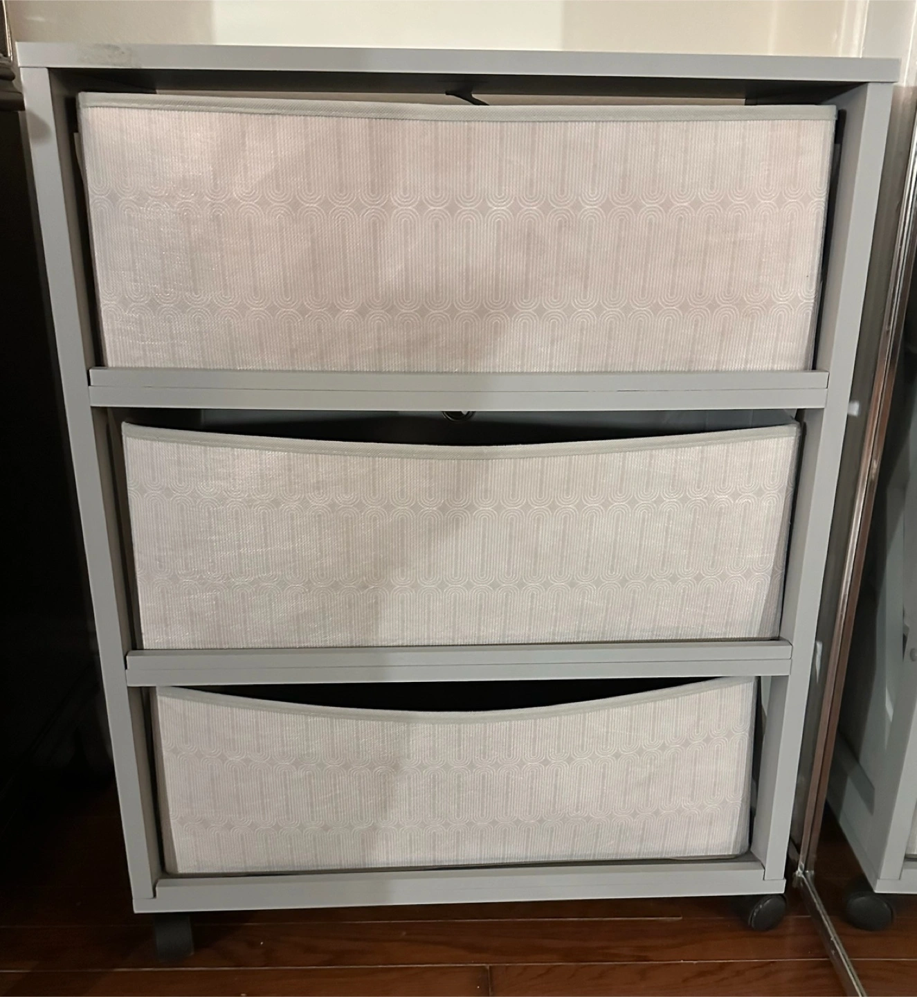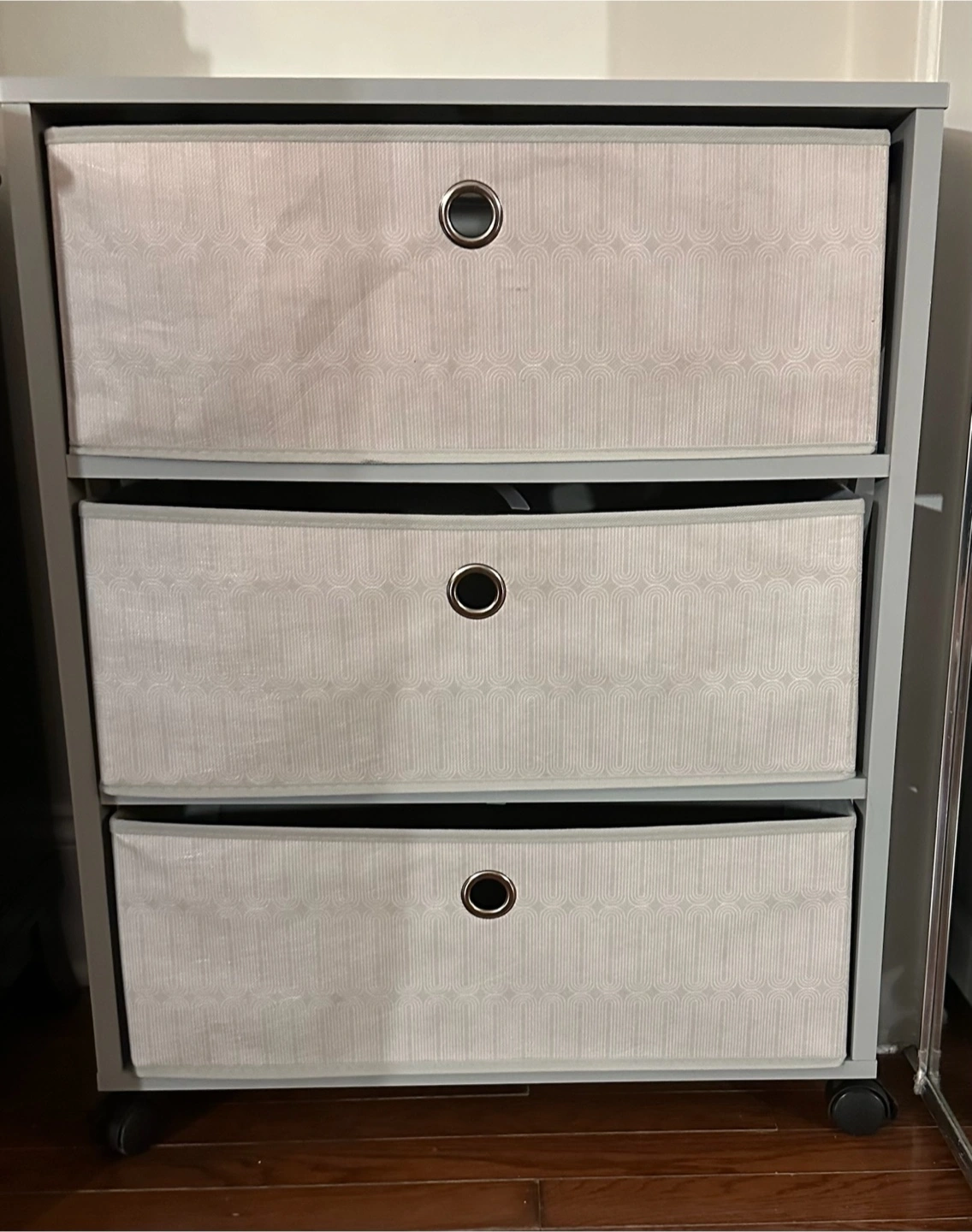 A gray storage cart. Three drawers with fabric fronts. Silver metal pulls on the drawers. Great for extra storage, maybe in a bedroom or office. You can put it in your space and relax.