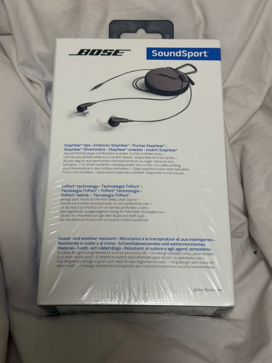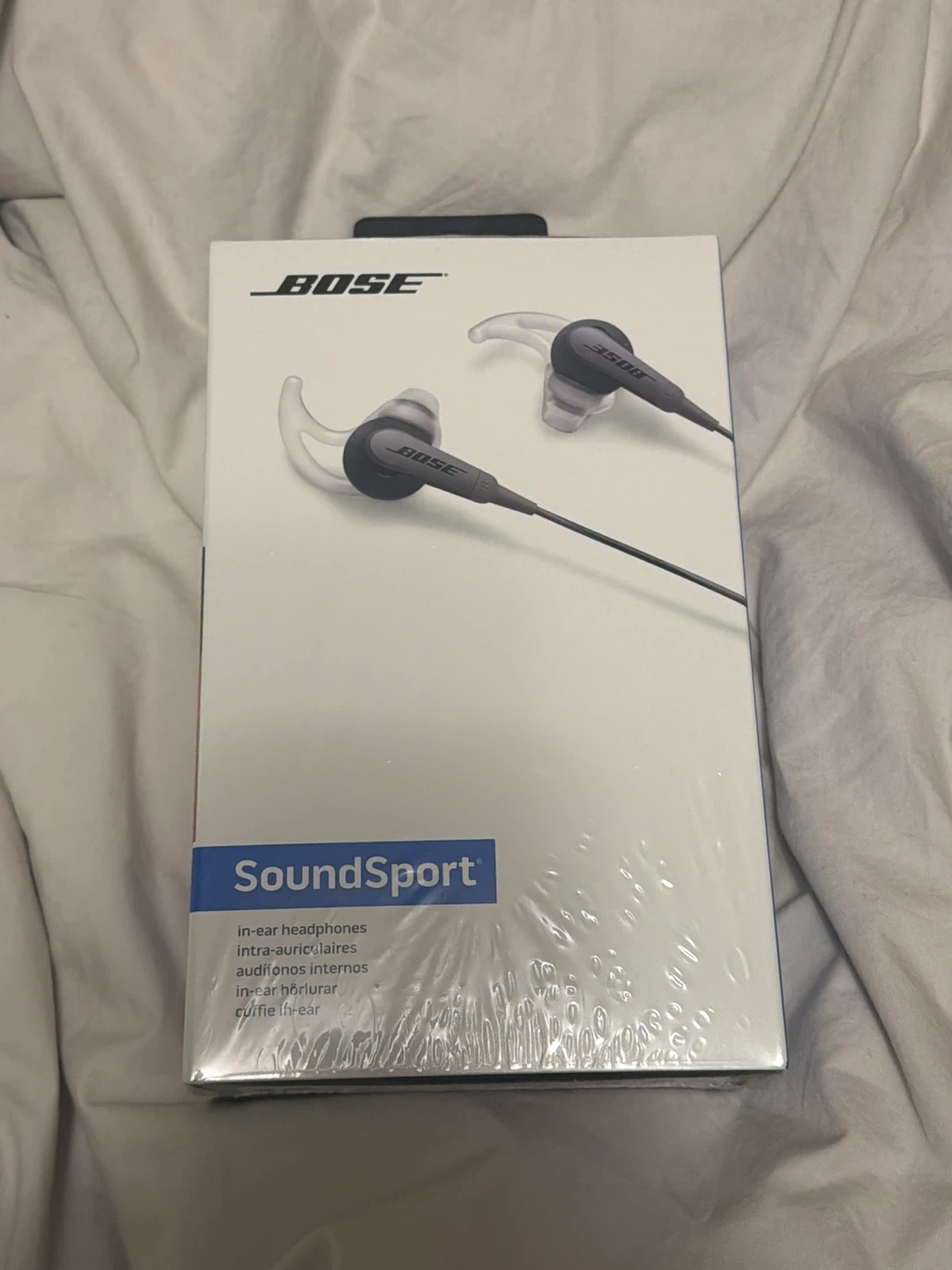 These Bose SoundSport in-ear headphones deliver clear, deep sound. They're sweat and water-resistant for busy lives. The design ensures a comfortable and stable fit. Includes original case and three sizes of StayHear tips.