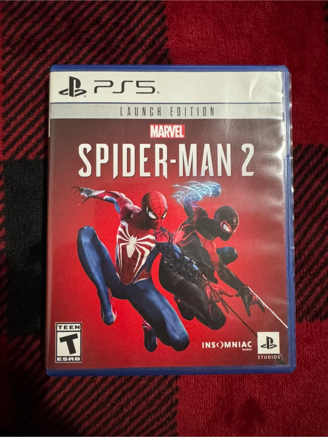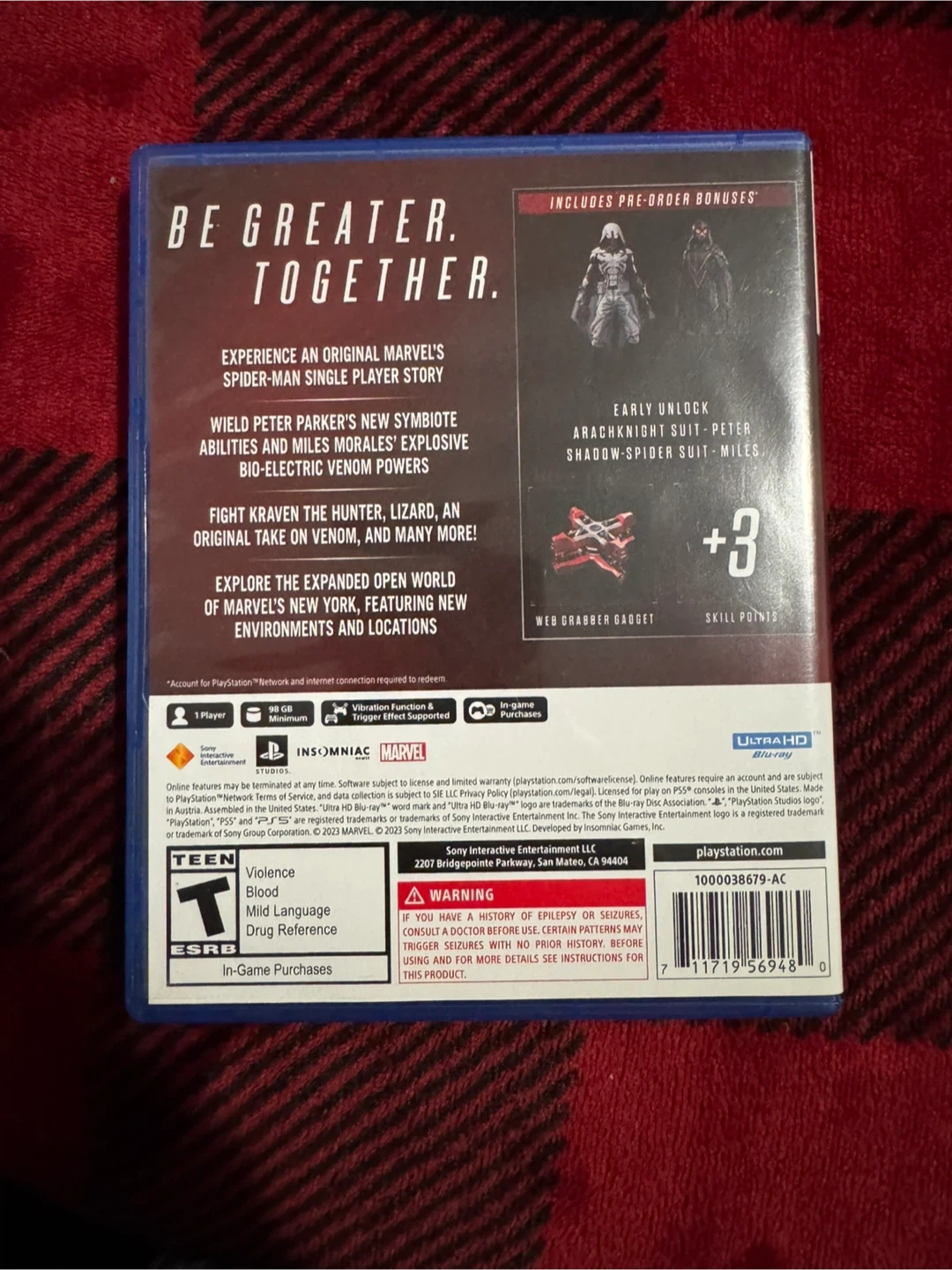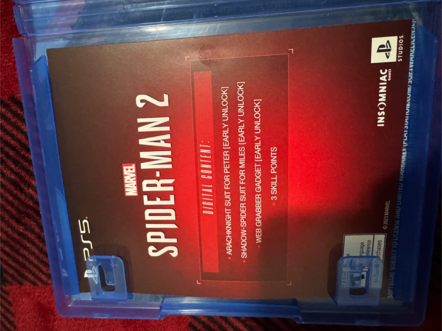 Selling Marvel's Spider-Man 2 for the PS5! Includes pre-order bonuses such as early unlock of the Arachknight Suit for Peter, Shadow-Spider Suit for Miles, Web Grabber Gadget, and +3 Skill Points