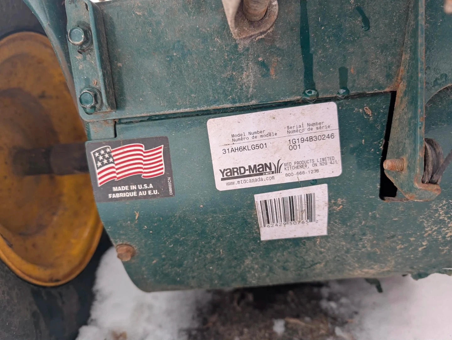Yard-Man snow blower with a Tecumseh engine. Model 31AH6KL0501. Made in U.S.A. Ready for winter snow removal!