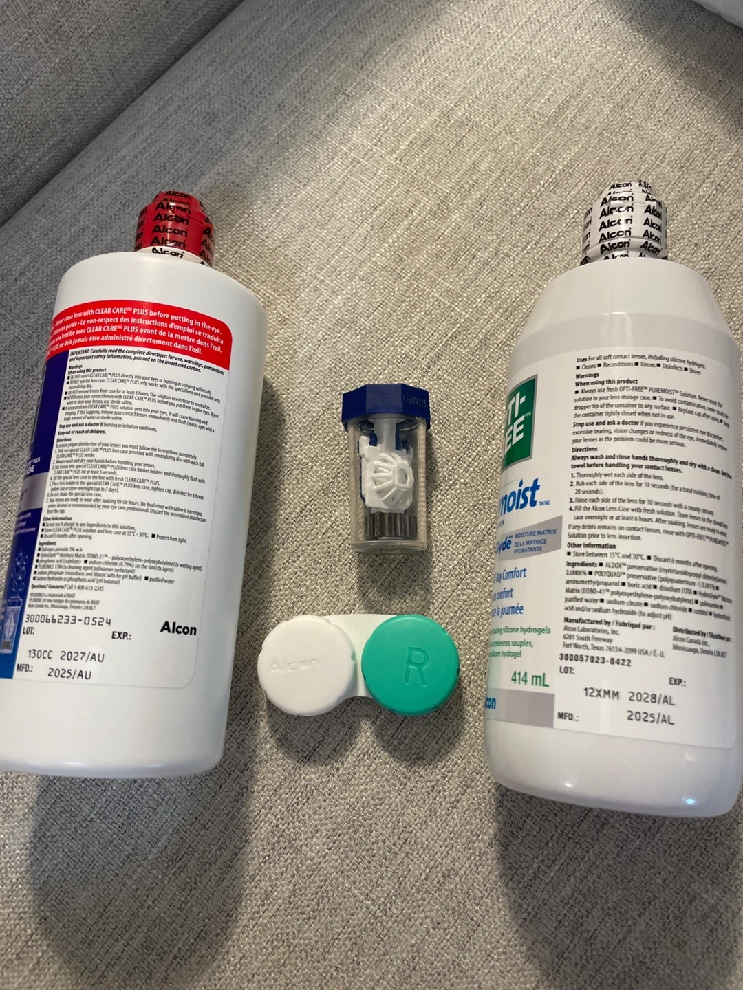 This bundle includes Alcon CLEAR CARE PLUS Hydraglyde solution (480 mL) with an expiry date of 2027/AUG, and OPTI-FREE puremoist solution (414 mL) with an expiry date of 2028/AL. A contact lens case and a rinsing cup are also included. Keep your lenses clean and comfortable with this convenient set! They both are bigger bottle than regular size and unopened.