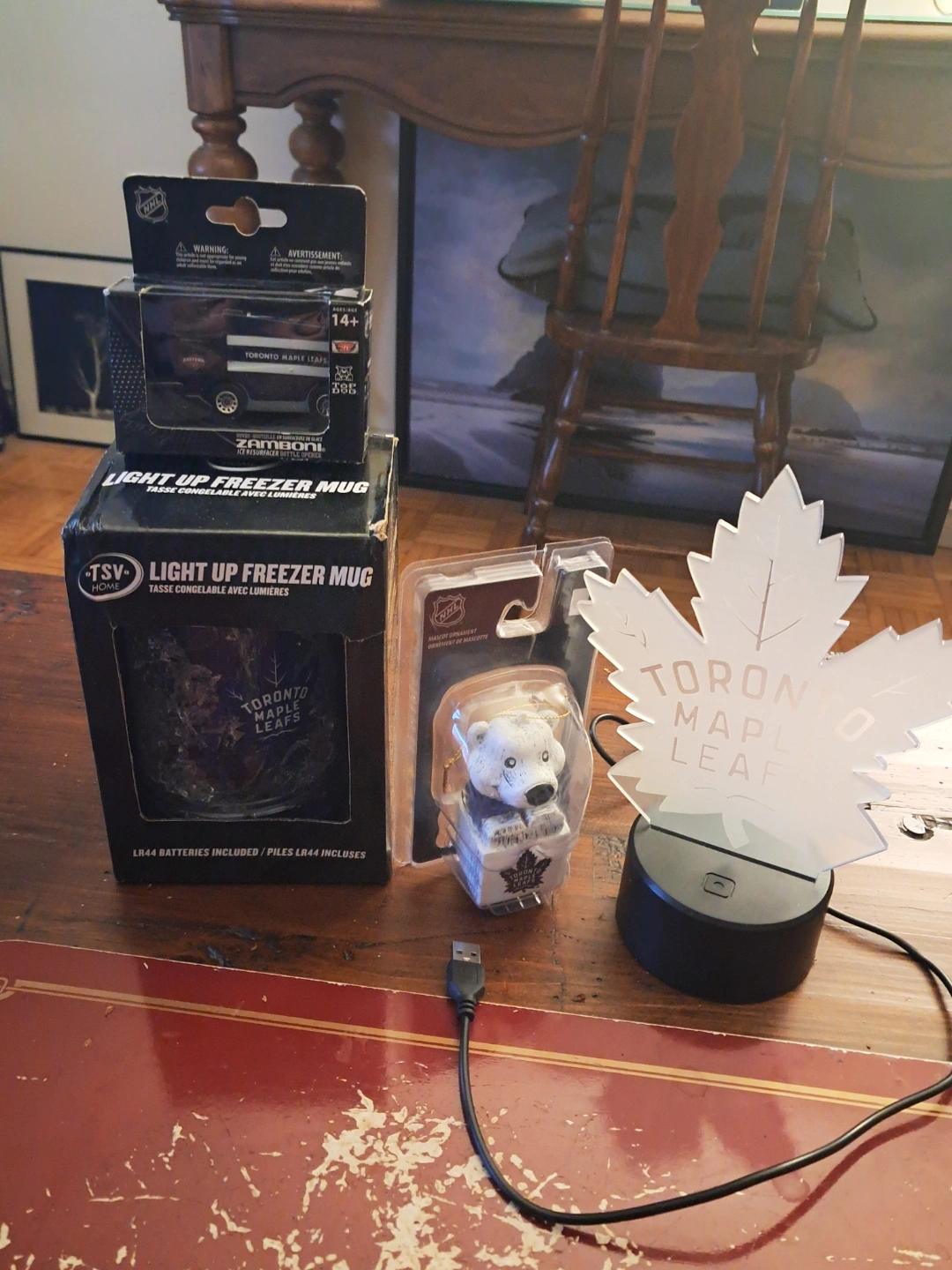 NHL Toronto Maple Leafs bundle includes light-up freezer mug, USB light-up mascot ornament, and Zamboni bottle opener. Batteries included for mug....the only way to break the curse is for you to buy these items.