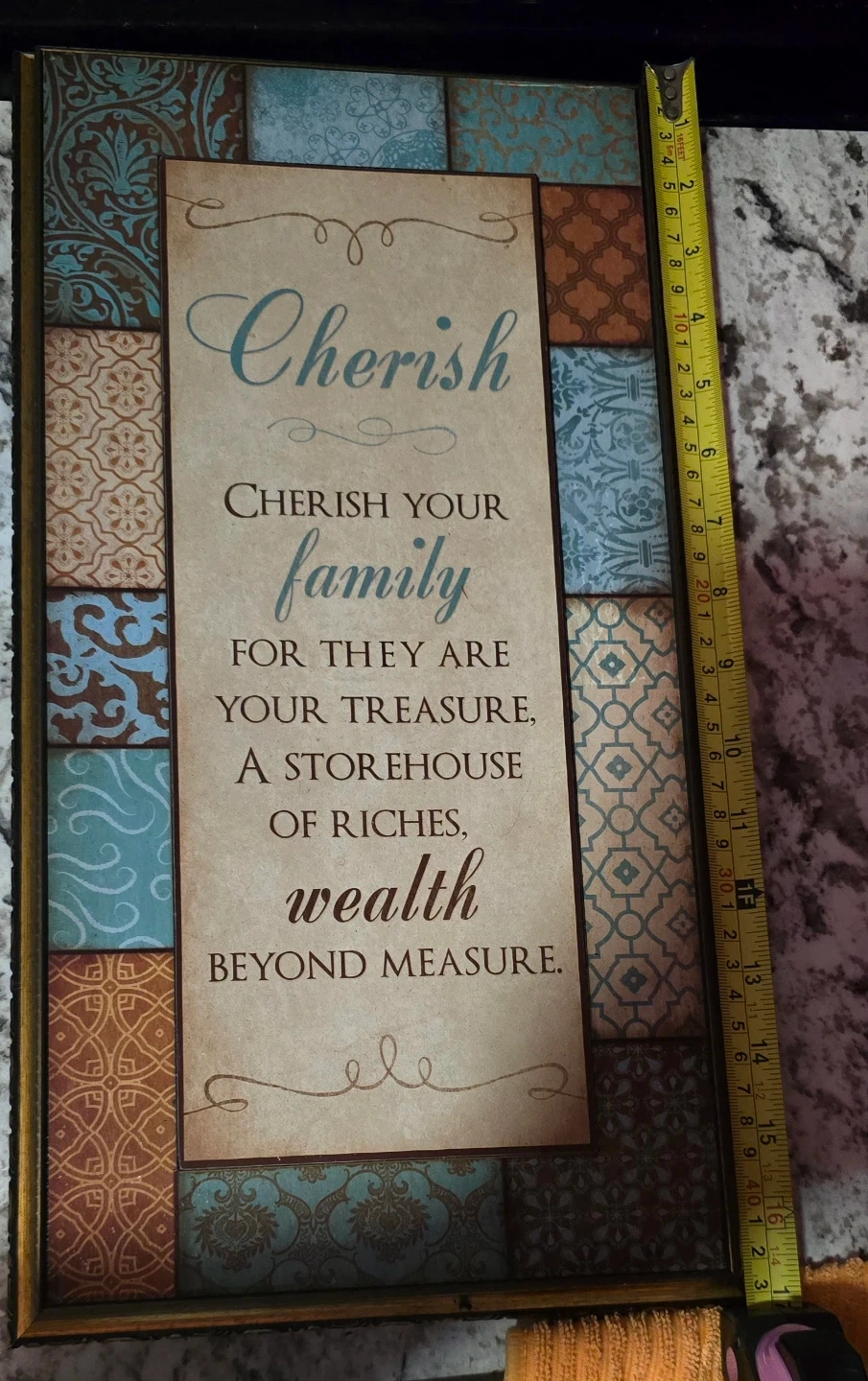 This decorative wall plaque features the inspirational quote, "Cherish your family for they are your treasure, a storehouse of riches, wealth beyond measure." It's framed with a distressed wood-look border and decorative tile accents. Dimensions are approximately 16 inches tall by 10 inches wide.