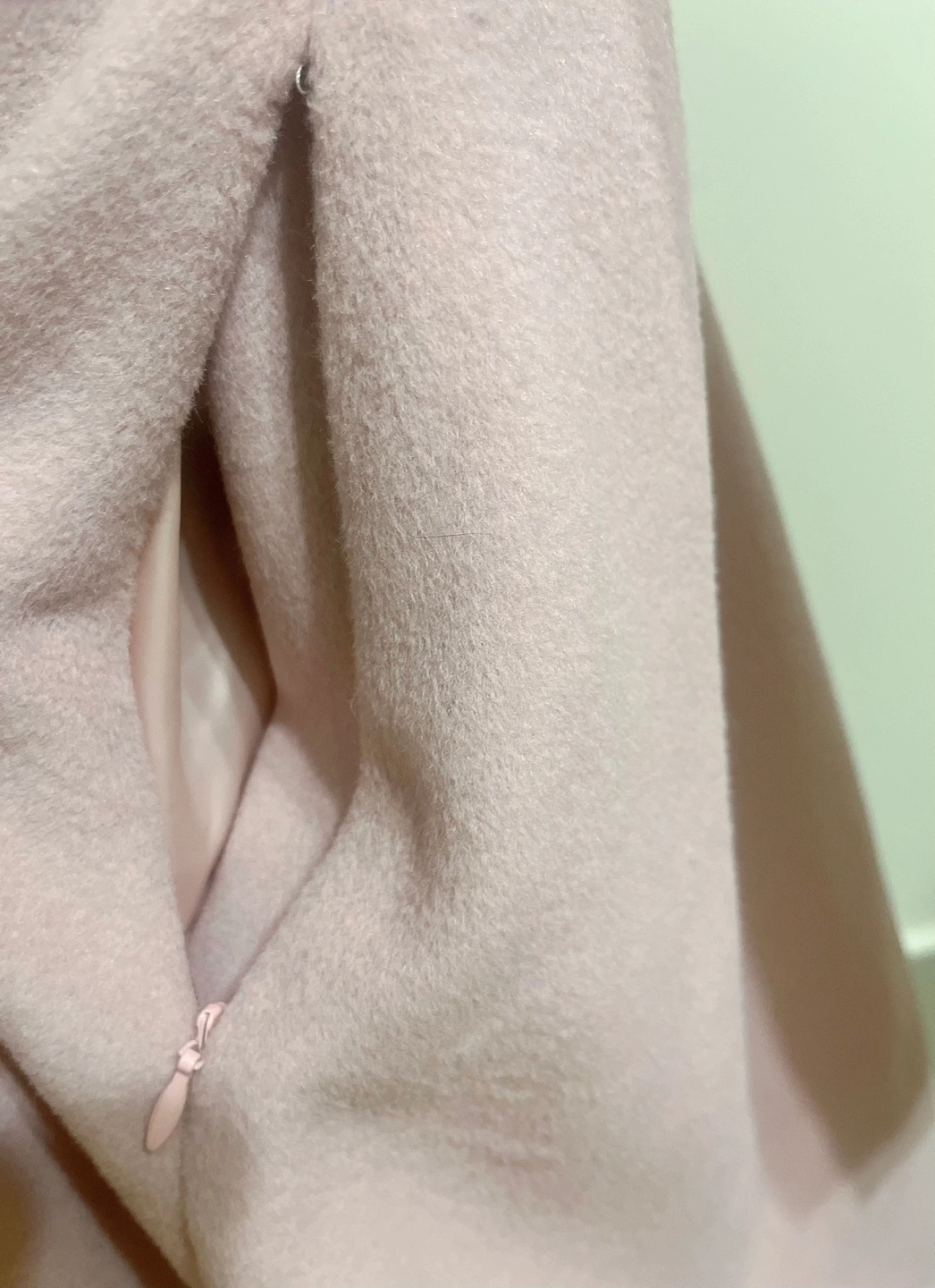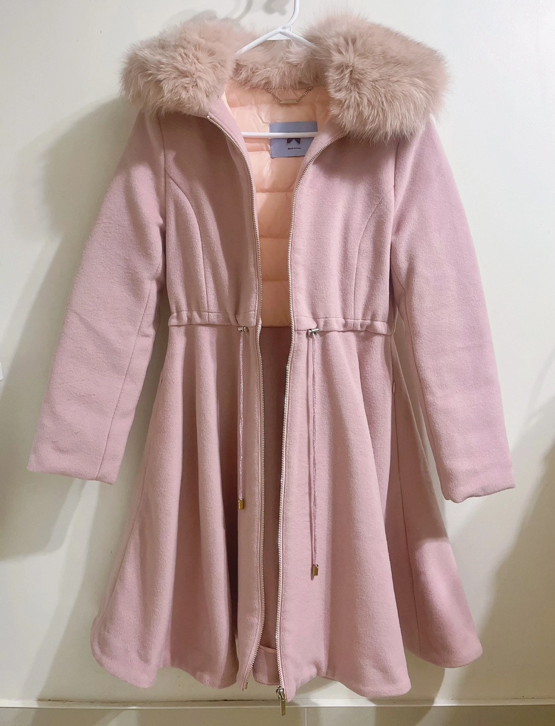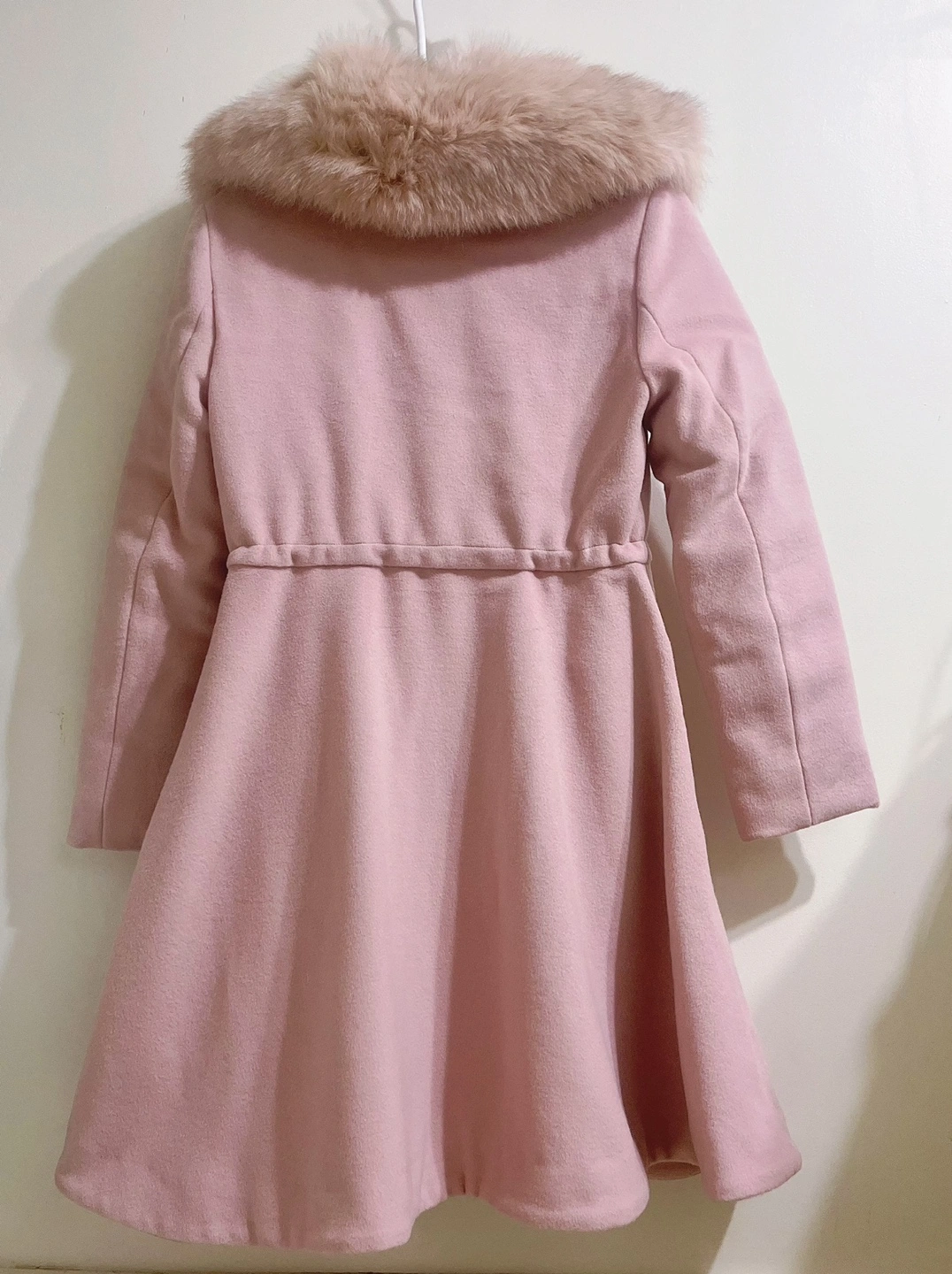 A-line coat, lotus root pink. Small size.The upper body and sleeves are lined with down feathers. Golden zipper and drawstring waist. The fur collar is detachable. There are pockets on the side.Cash only