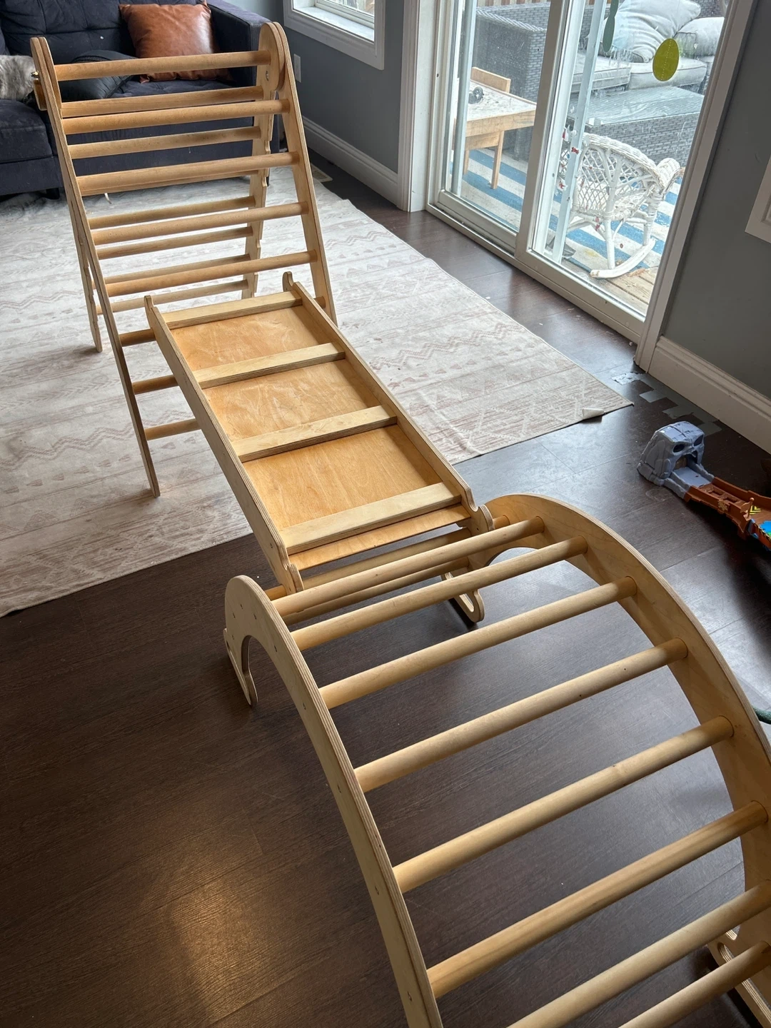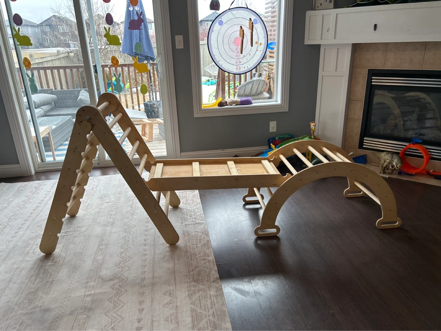 Selling our wooden Montessori climbing set featuring a Pikler triangle and arch climber — perfect for burning toddler energy while you sip coffee and question your life choices.