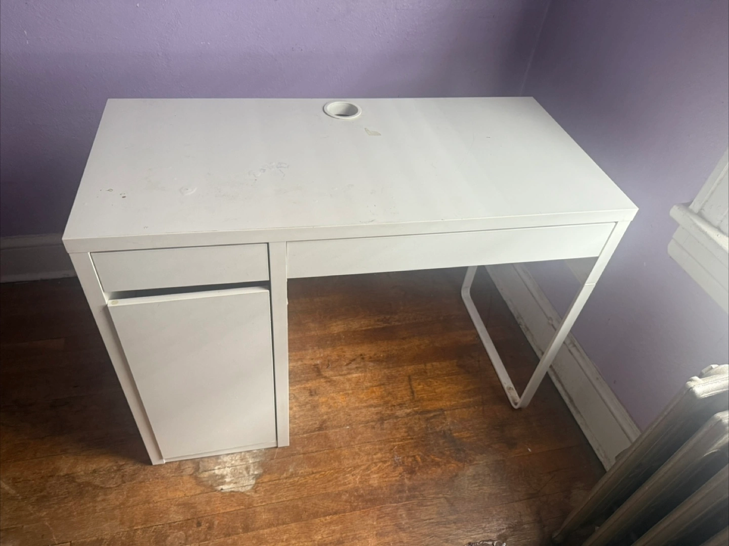 Small white desk. One drawer and cable hole. Metal legs. Some minor wear.