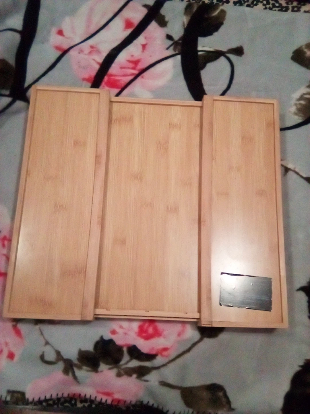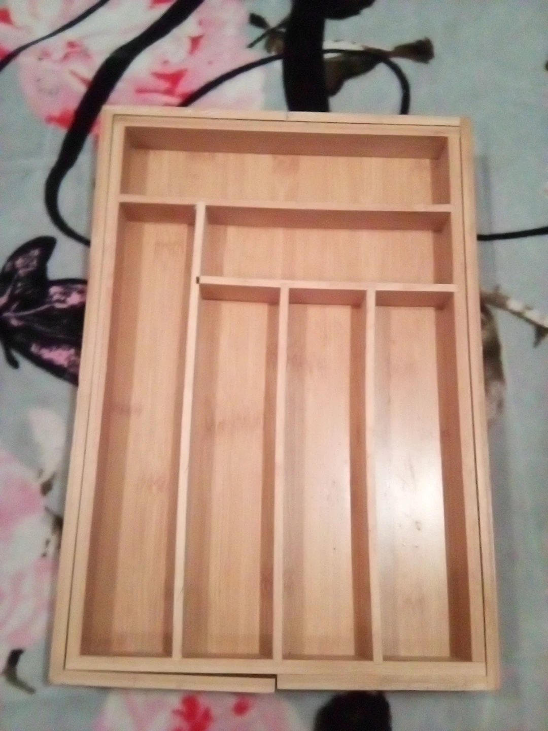 This is a bamboo expandable drawer organizer. It's perfect for keeping your drawers neat and tidy. The organizer is made of bamboo and has an expandable design, so it can fit a variety of drawer sizes. It's in good condition and ready for a new home