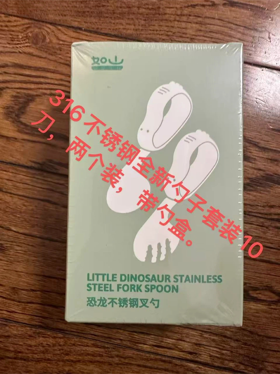 This is a new stainless steel fork and spoon set for kids, featuring a little dinosaur design. It comes with two sets and a spoon case. Made from 316 stainless steel.