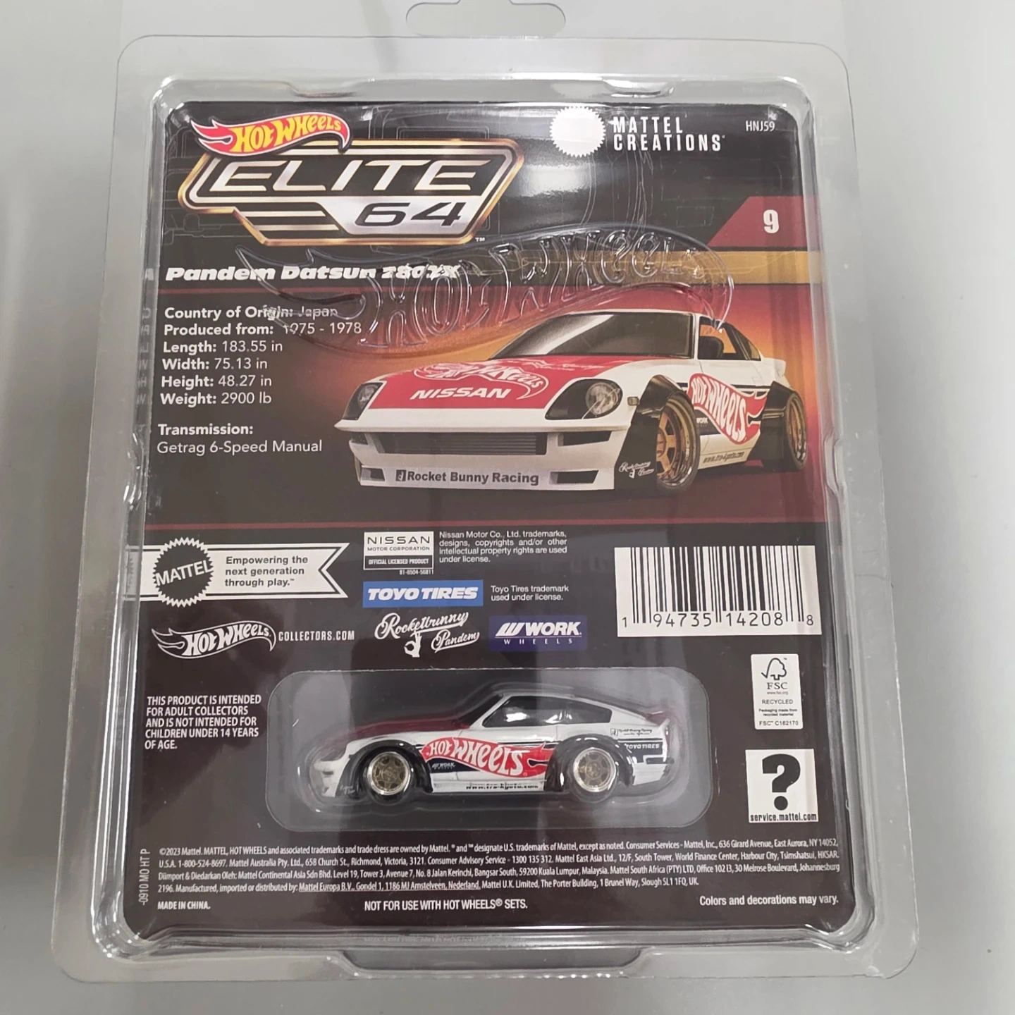 This is a Hot Wheels Elite 64 die-cast model of the Pandem Datsun 280ZX. Produced from 1975-1978, it's a 1:64 scale replica. Features a Getrag 6-Speed Manual transmission detail. This collectible is sealed in its original packaging.