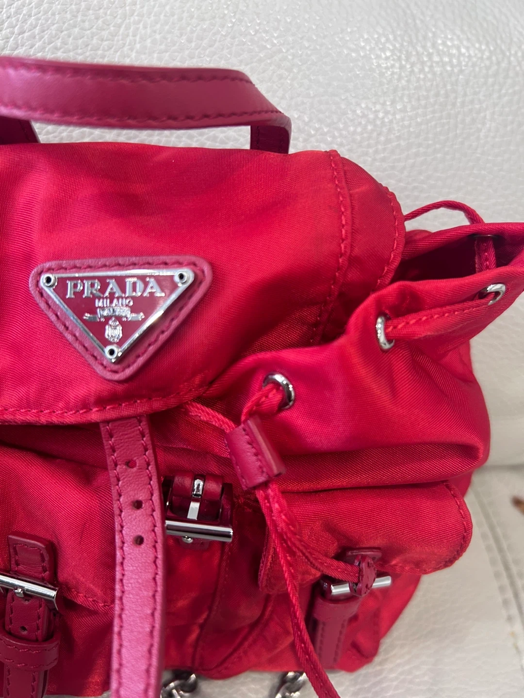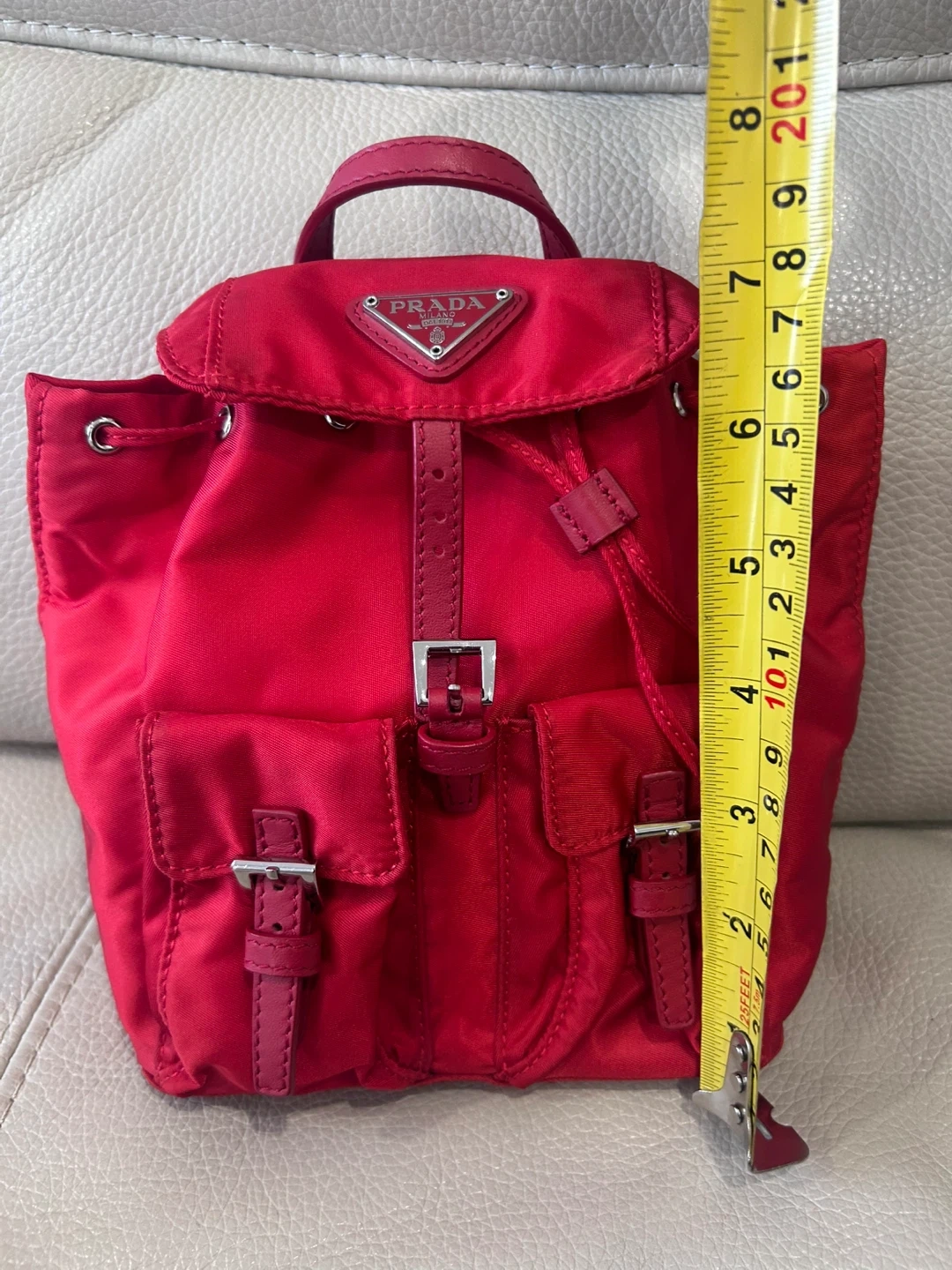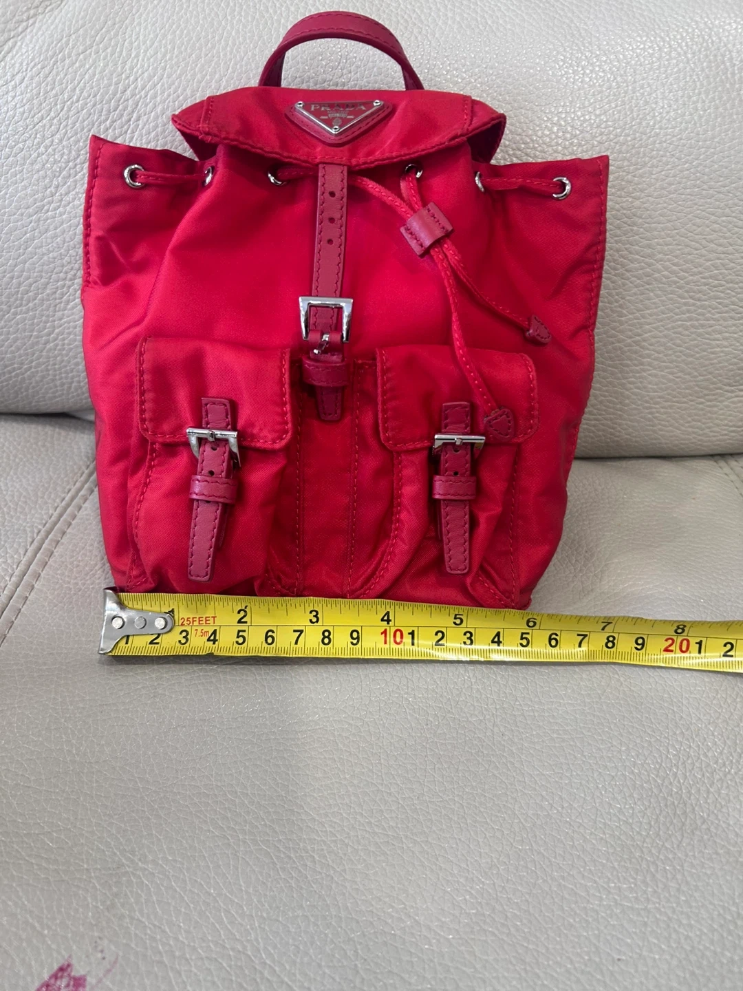 This is a cute red Prada mini backpack. It's in great condition and perfect for everyday use. The size is approximately 8 inches tall.