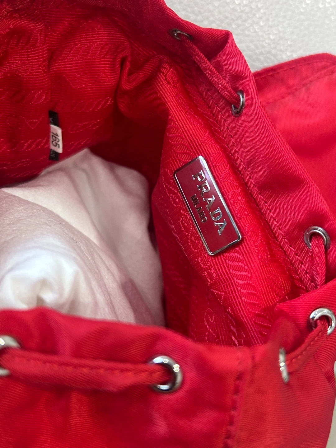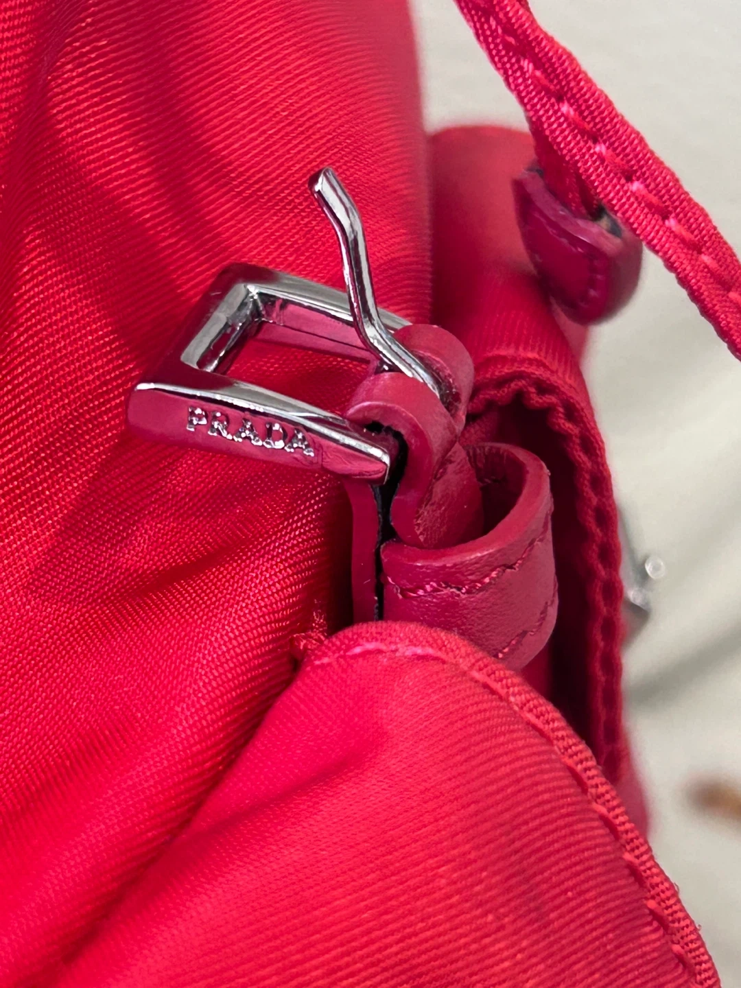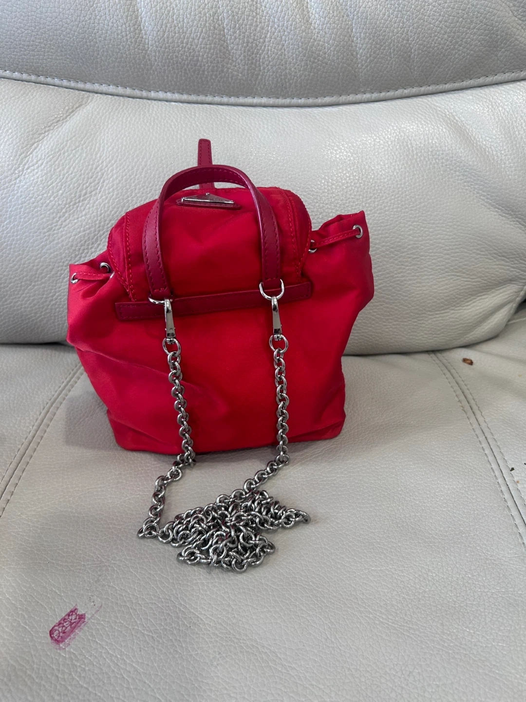 This is a cute red Prada mini backpack. It's in great condition and perfect for everyday use. The size is approximately 8 inches tall.