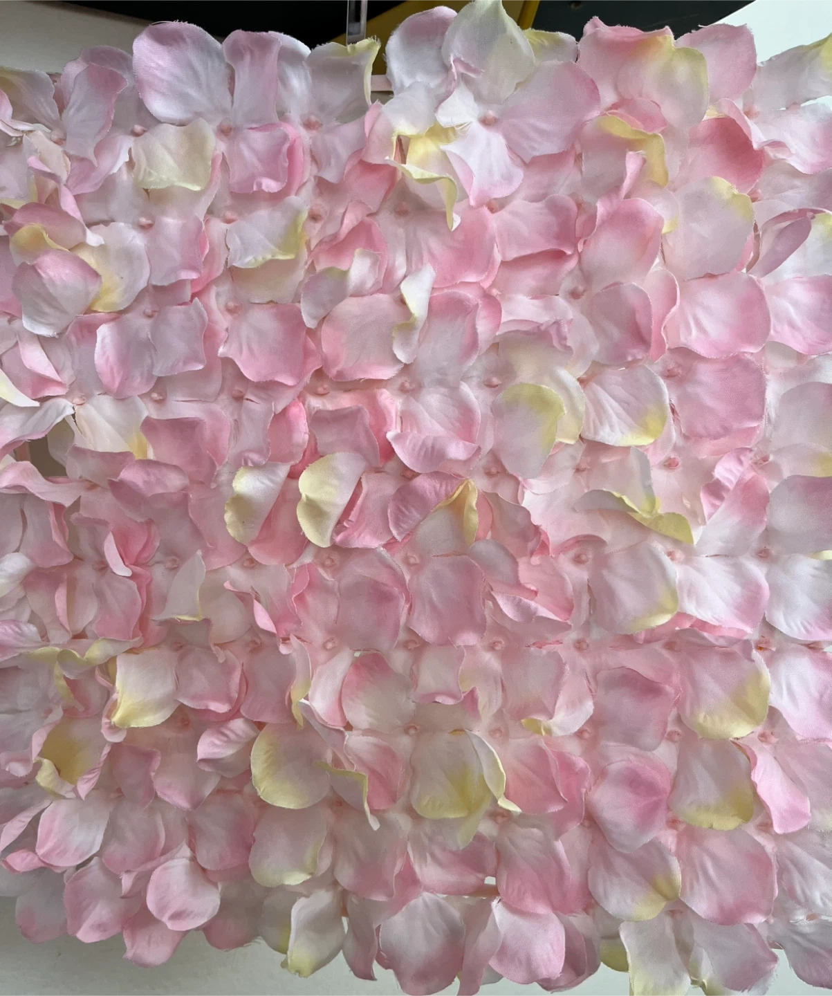 These are artificial flower petals in shades of pink and yellow. They're made of fabric. These petals are useful for decorating events or crafts.