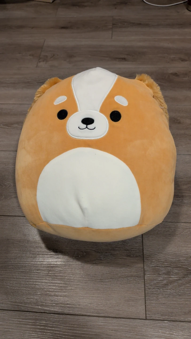 This is a soft, huggable Squishmallow plush toy. It's shaped like a cute dog with orange and white fur. It's a great companion for snuggles! 12" "x 13".