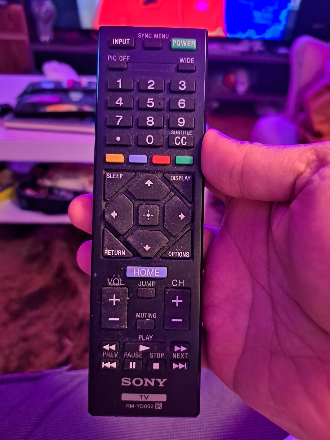 Sony TV remote control, model RM-YD092. It has buttons for power, input, menu, channel selection, volume, playback controls, and subtitle/CC functions. Power is supplied by batteries, not included.
