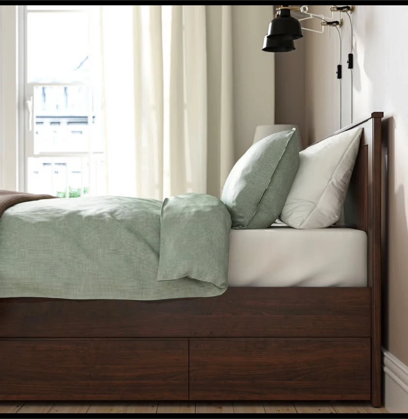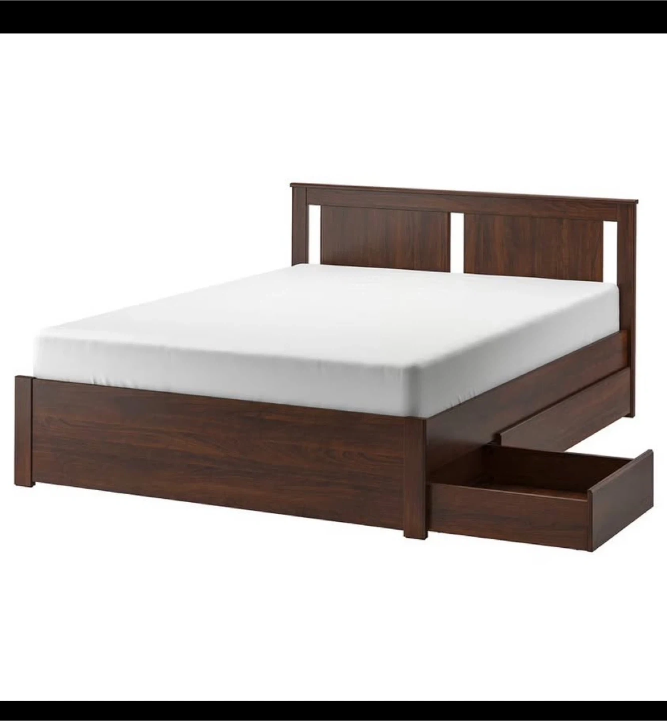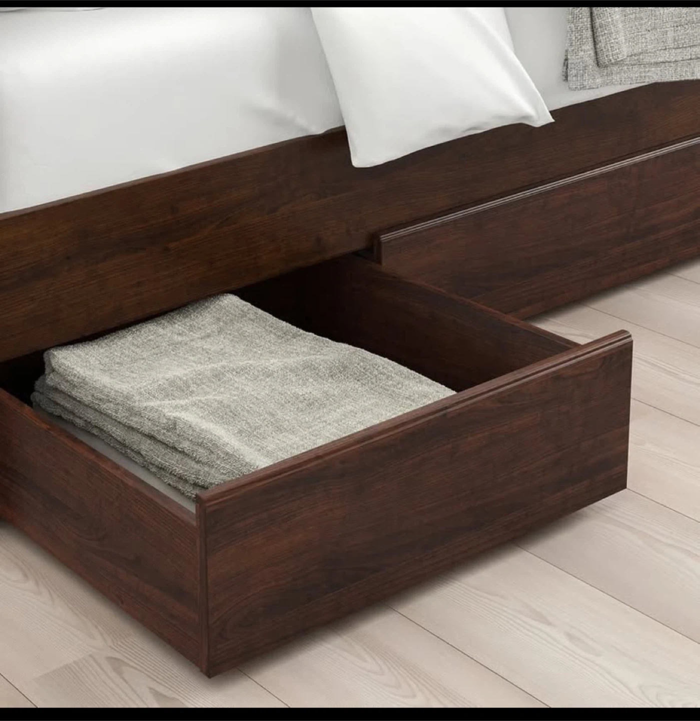 This is a dark wood bed frame featuring two built-in storage drawers. It's a practical choice for keeping your bedroom tidy. The bed frame provides ample space for storing linens or other items.