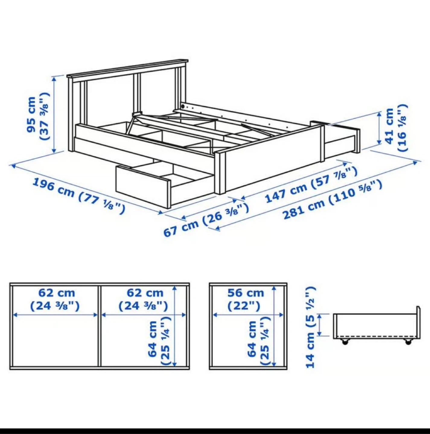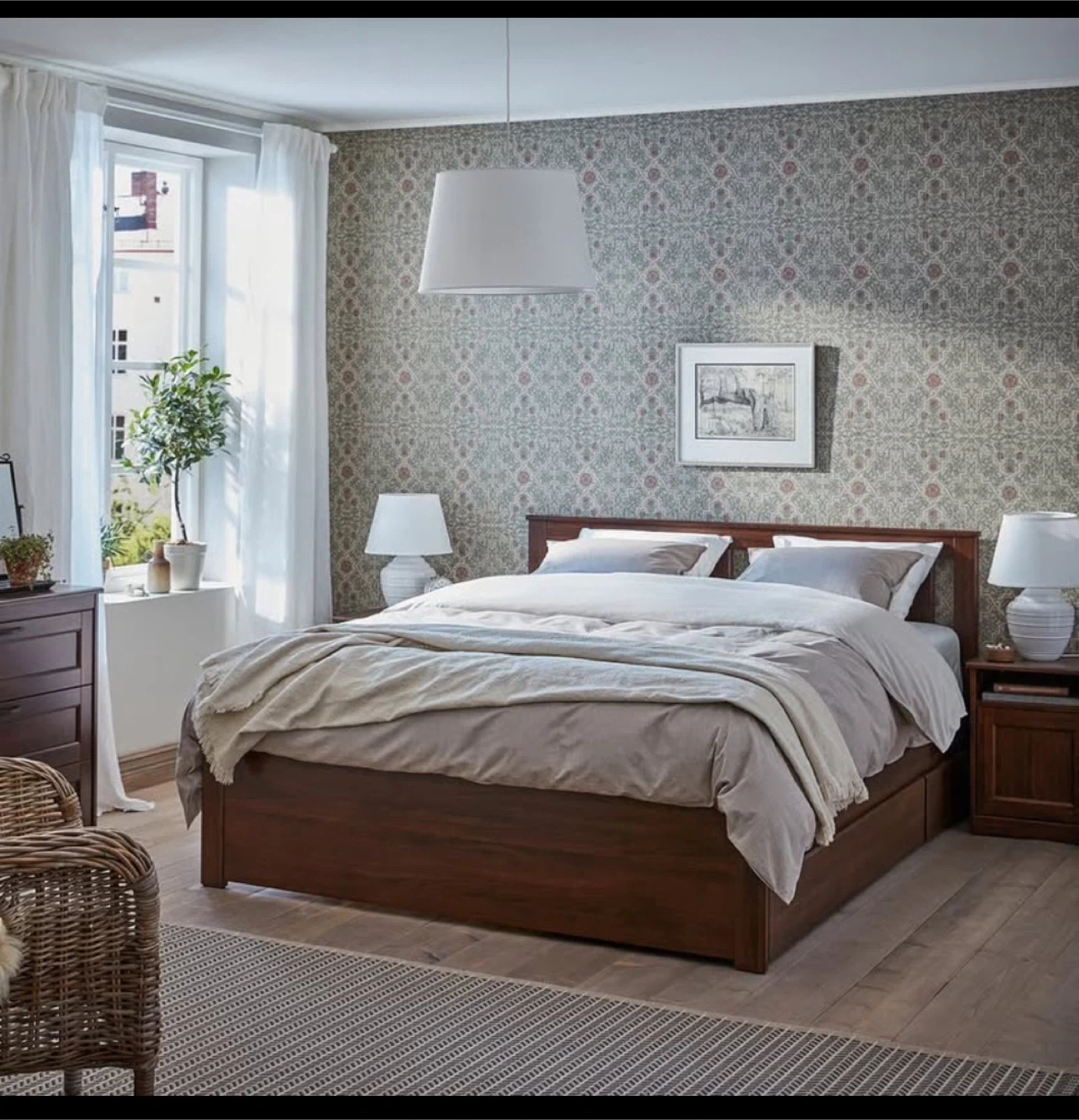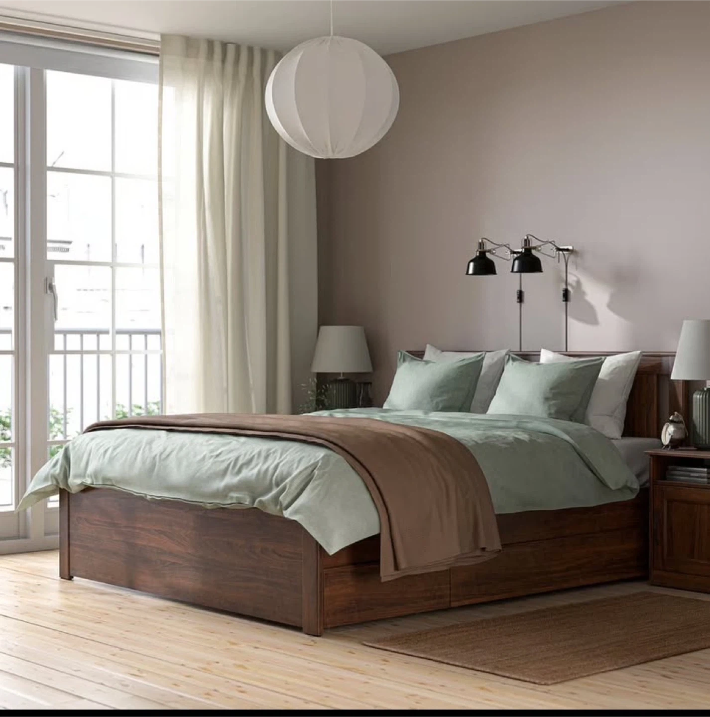 This is a dark wood bed frame featuring two built-in storage drawers. It's a practical choice for keeping your bedroom tidy. The bed frame provides ample space for storing linens or other items.