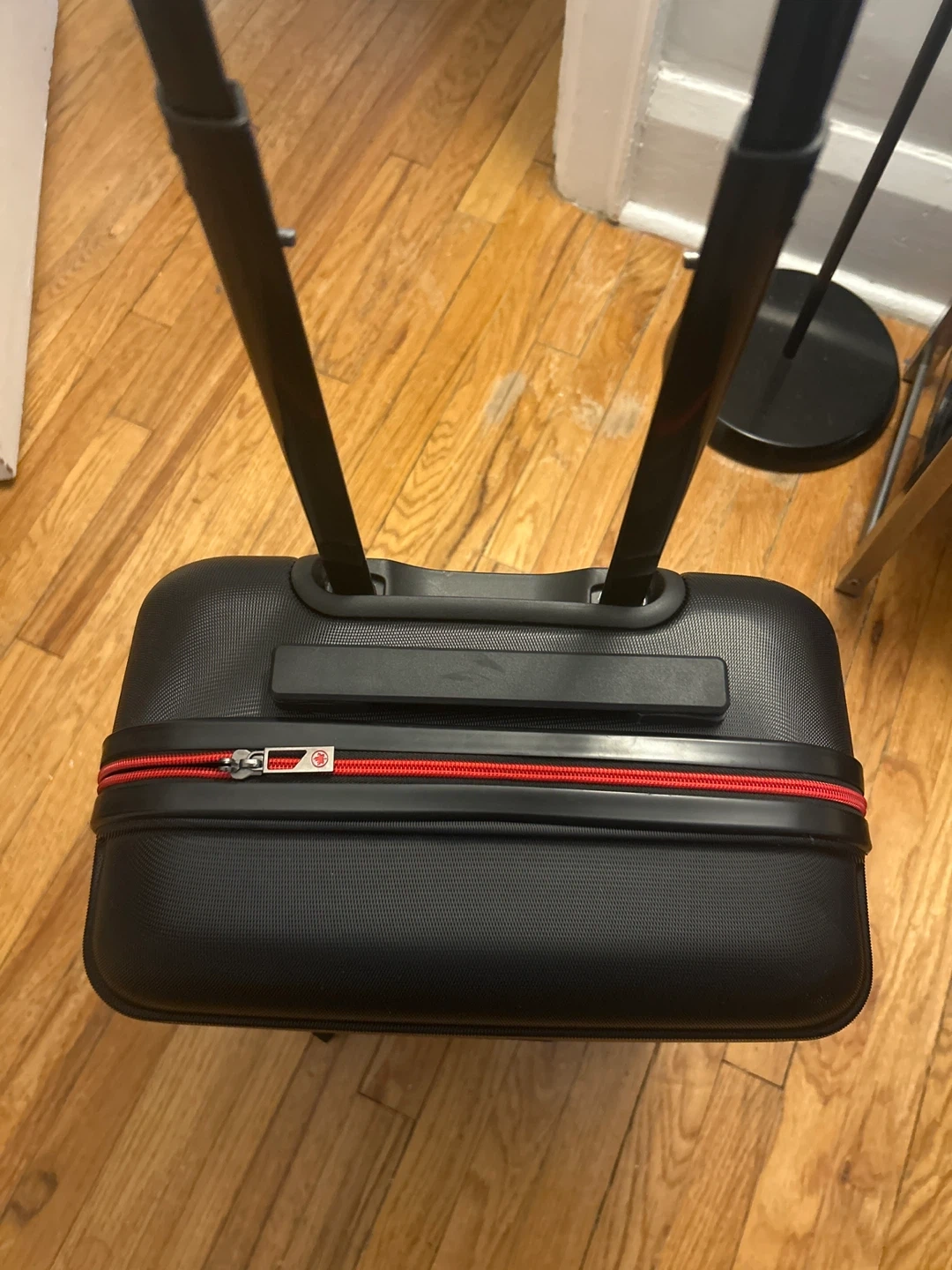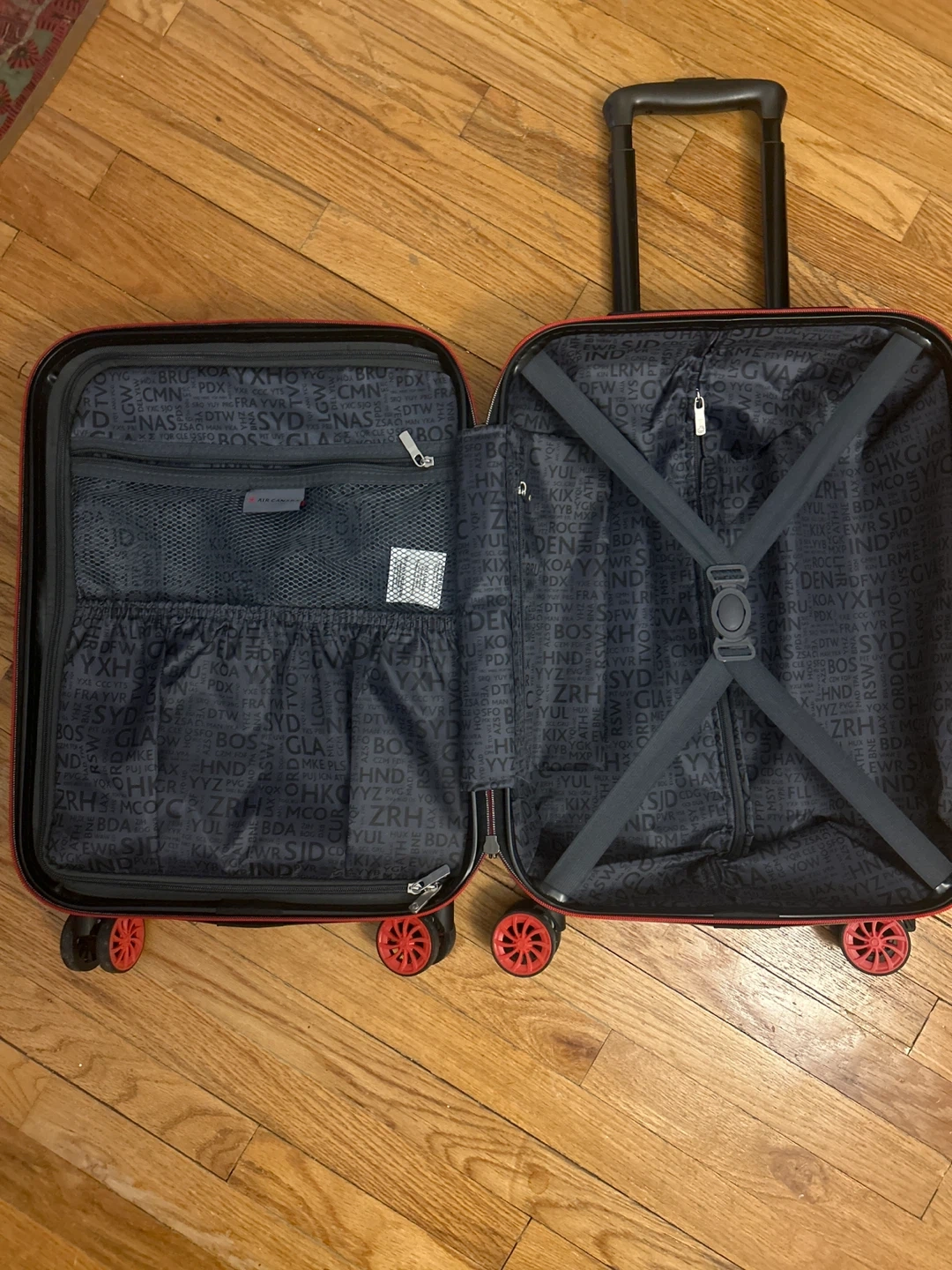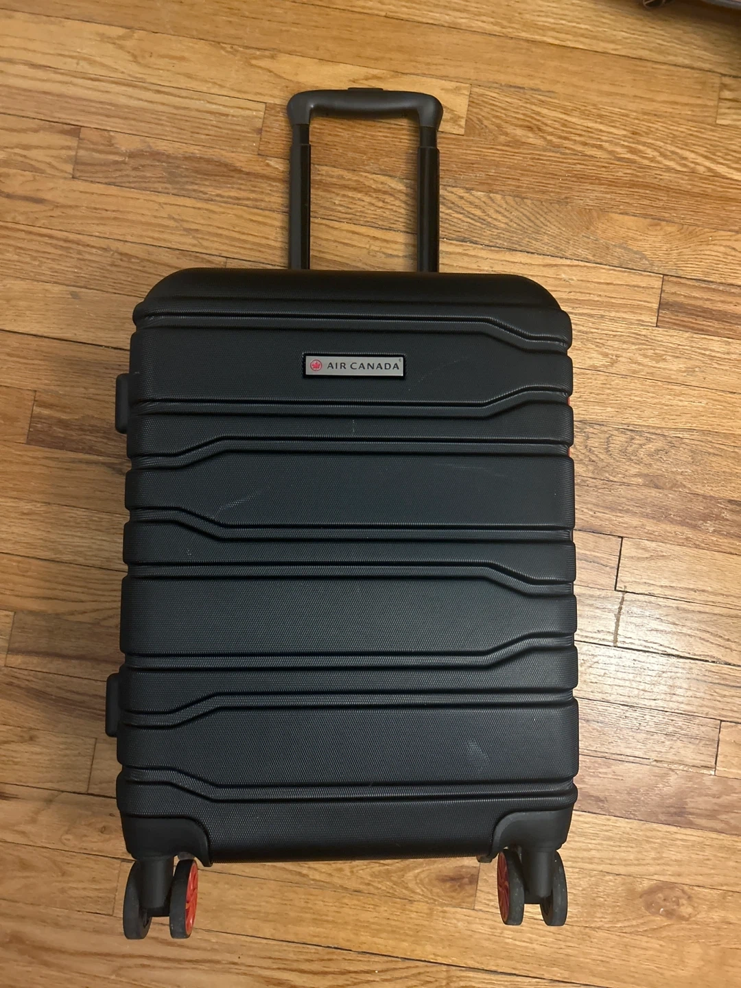 This black carry-on luggage is from Air Canada. It's a hard-shell suitcase with a retractable handle and four spinner wheels. The interior features a zippered compartment and cross-straps for organization. It's perfect for short trips or as a personal item on flights!