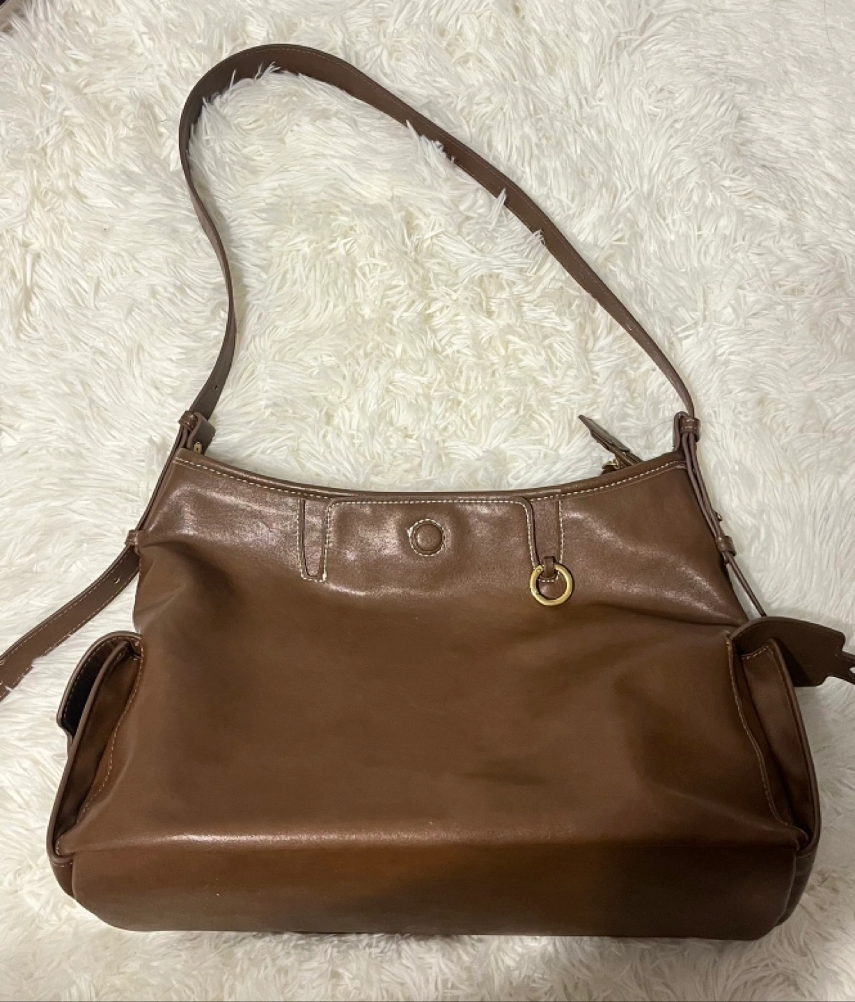 Brown leather shoulder hobo bag. Features a long and adjustable shoulder strap, multiple pockets, and a zip closure. Stylish and practical. Could be shoulder bag or crossbody bag.