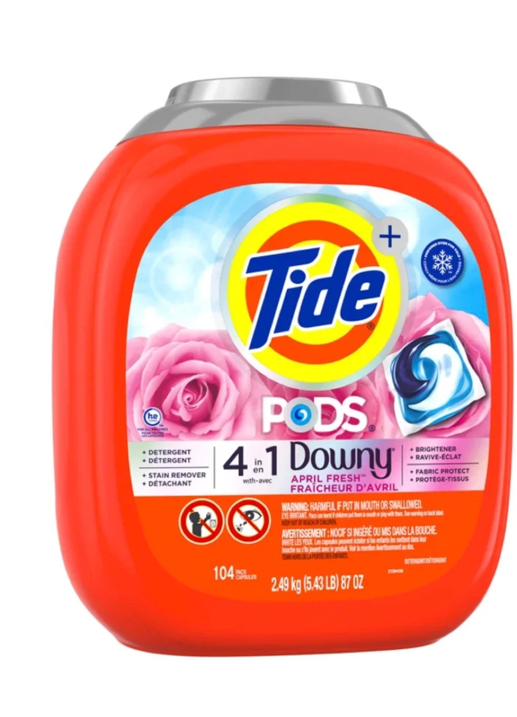 104 pods of Tide PODS 4-in-1 laundry detergent with April Fresh Downy scent. It's a detergent, stain remover, brightener, and fabric protectant. Contains 2.49 kg (5.43 lb) of detergent.