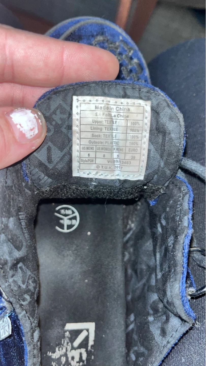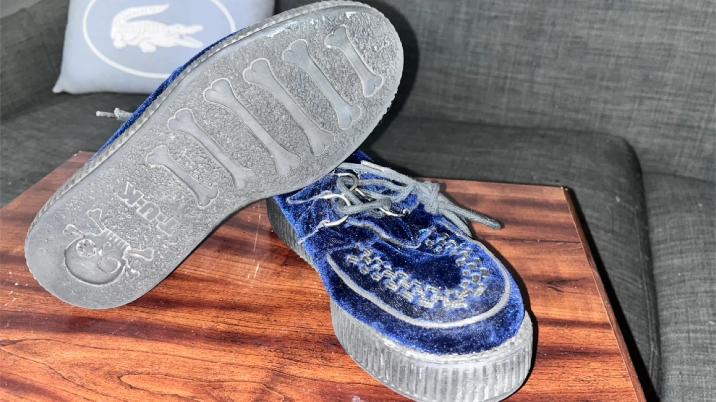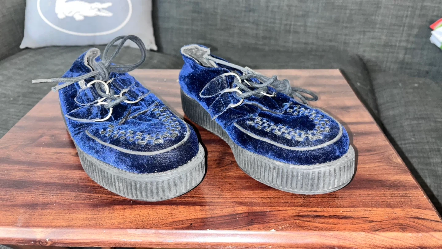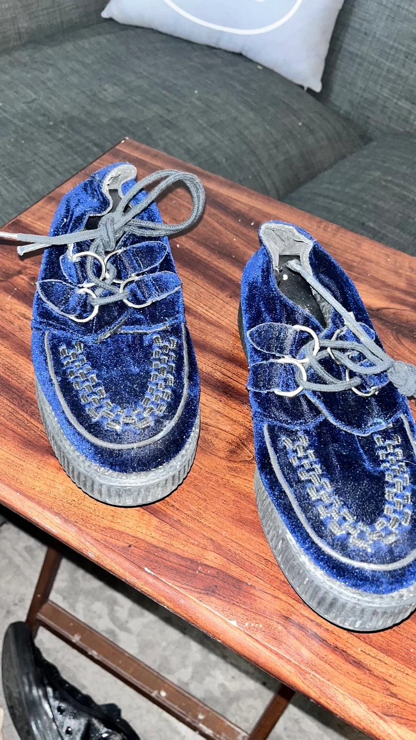 Blue velvet creepers with faux leather lining and a platform sole. The outsole is plastic and features a bone pattern. These shoes are men’s 6, which is a US women's size 8.