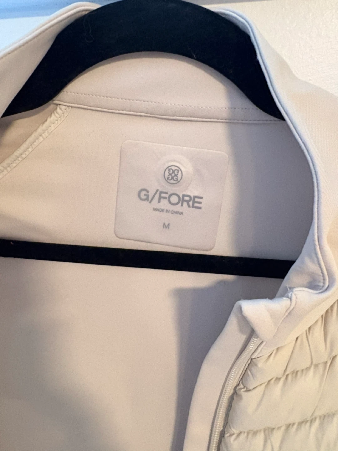 G/Fore women's quilted interlock jacket. This jacket features a cream color and a size medium fit. It's made from a blend of materials for comfort and style. Perfect for outdoor activities or casual wear!