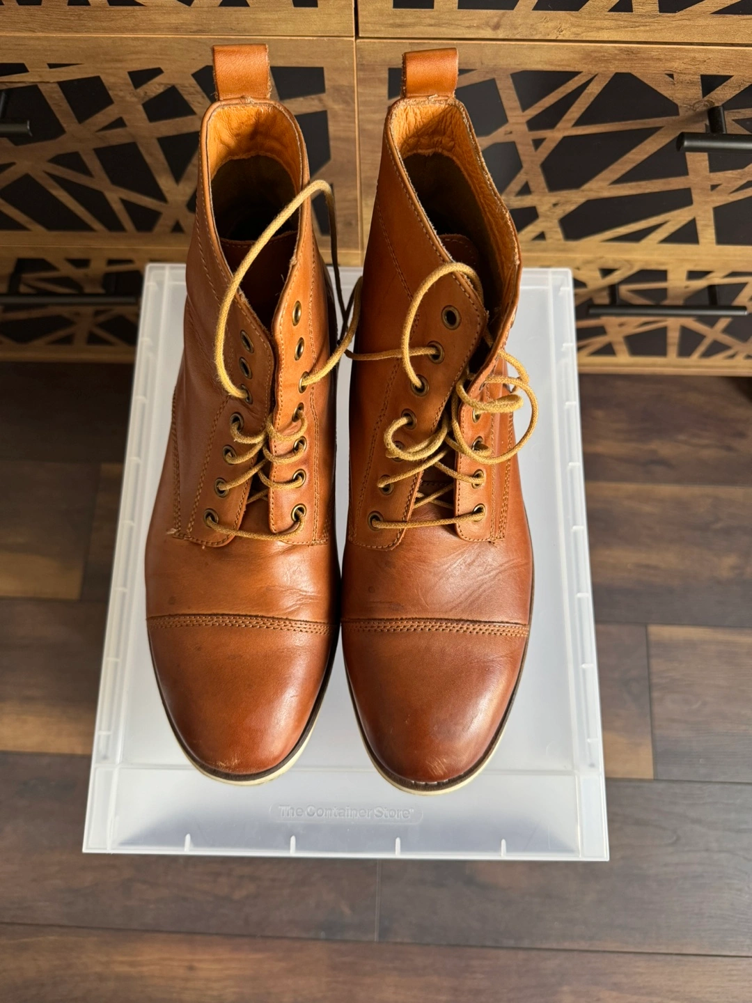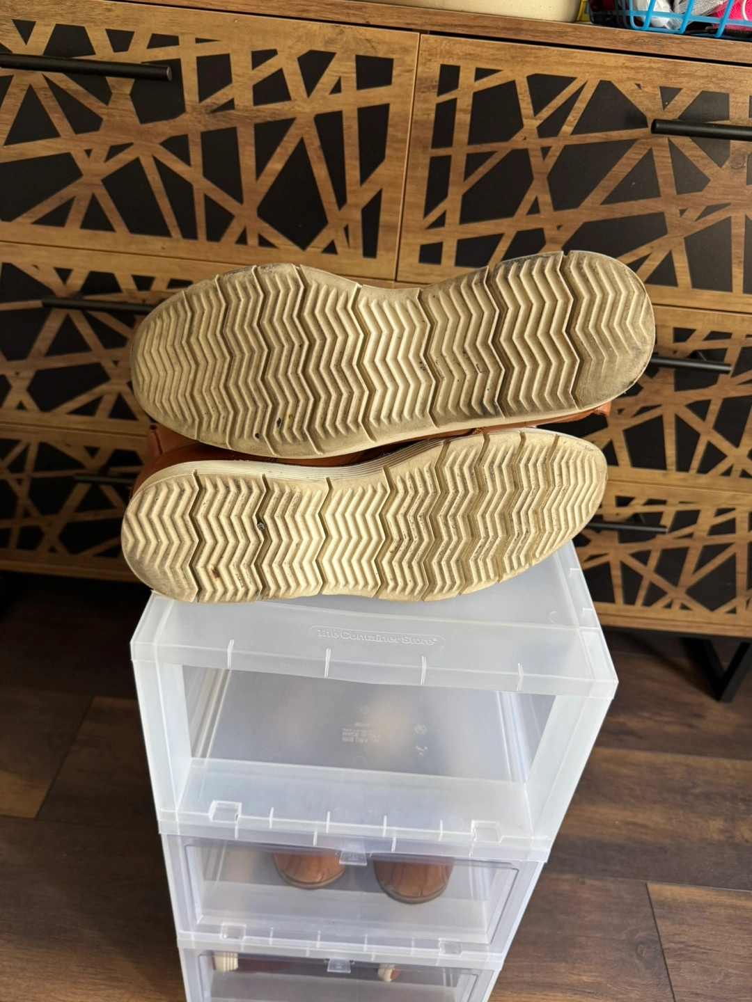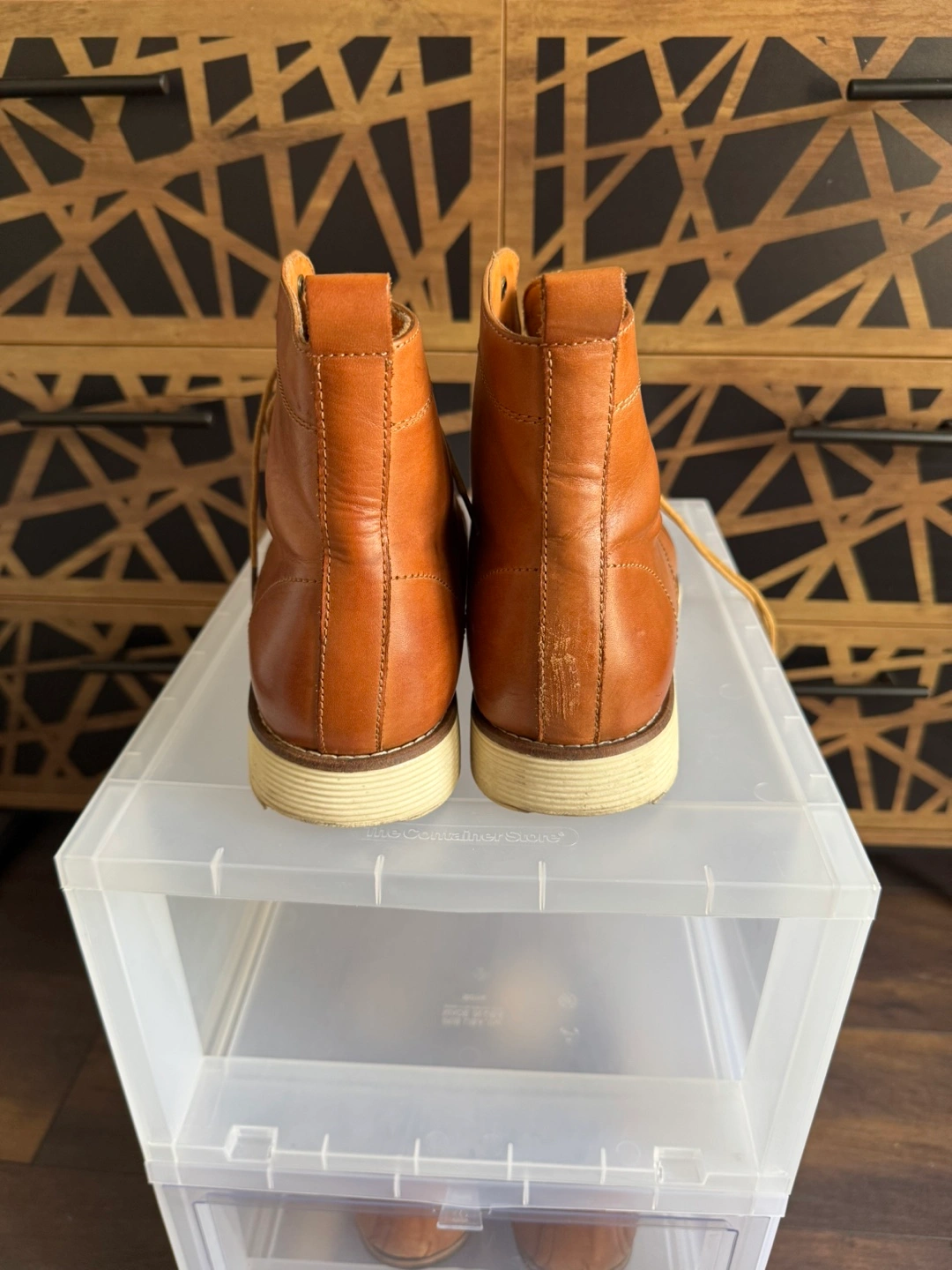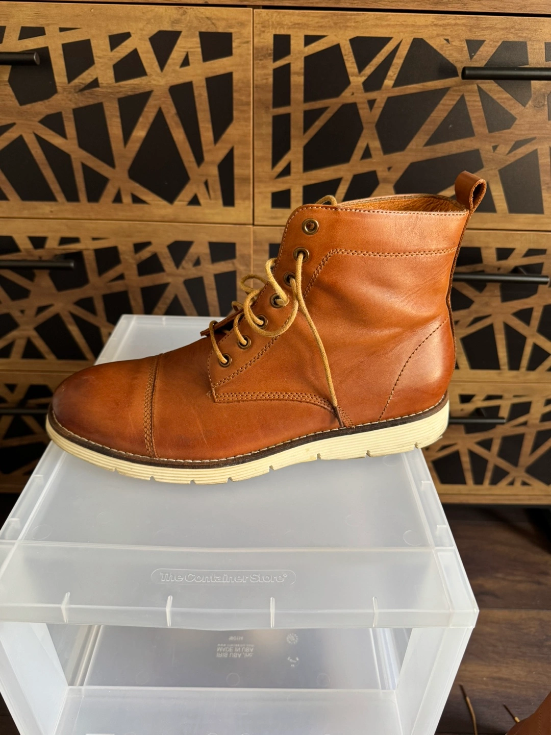 Selling a pair of brown leather ankle boots. They show some signs of wear, especially on the soles, but the leather is in good condition. These boots are perfect for adding a touch of style to your everyday look