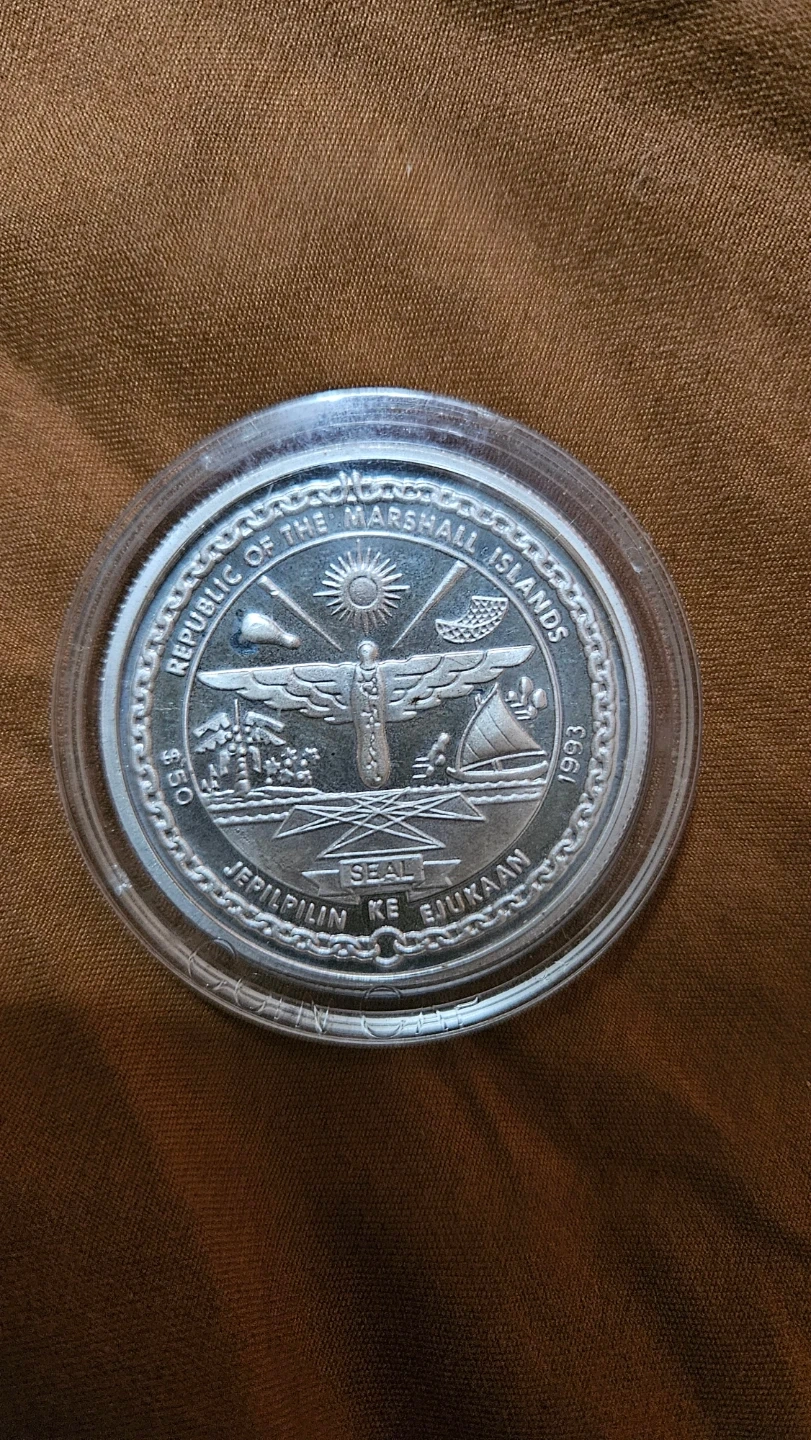 This is a 1993 coin from the Republic of the Marshall Islands featuring Elvis Presley. It has a denomination of Fifty Dollars. The coin is housed in a protective plastic case.