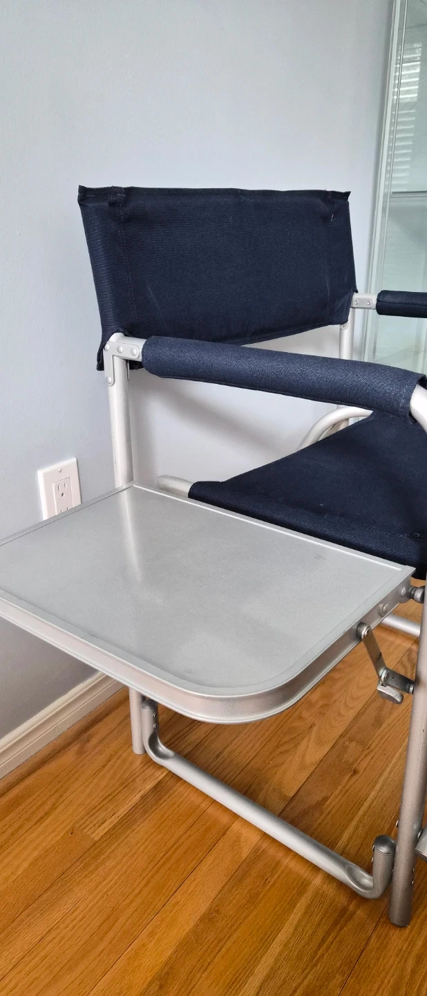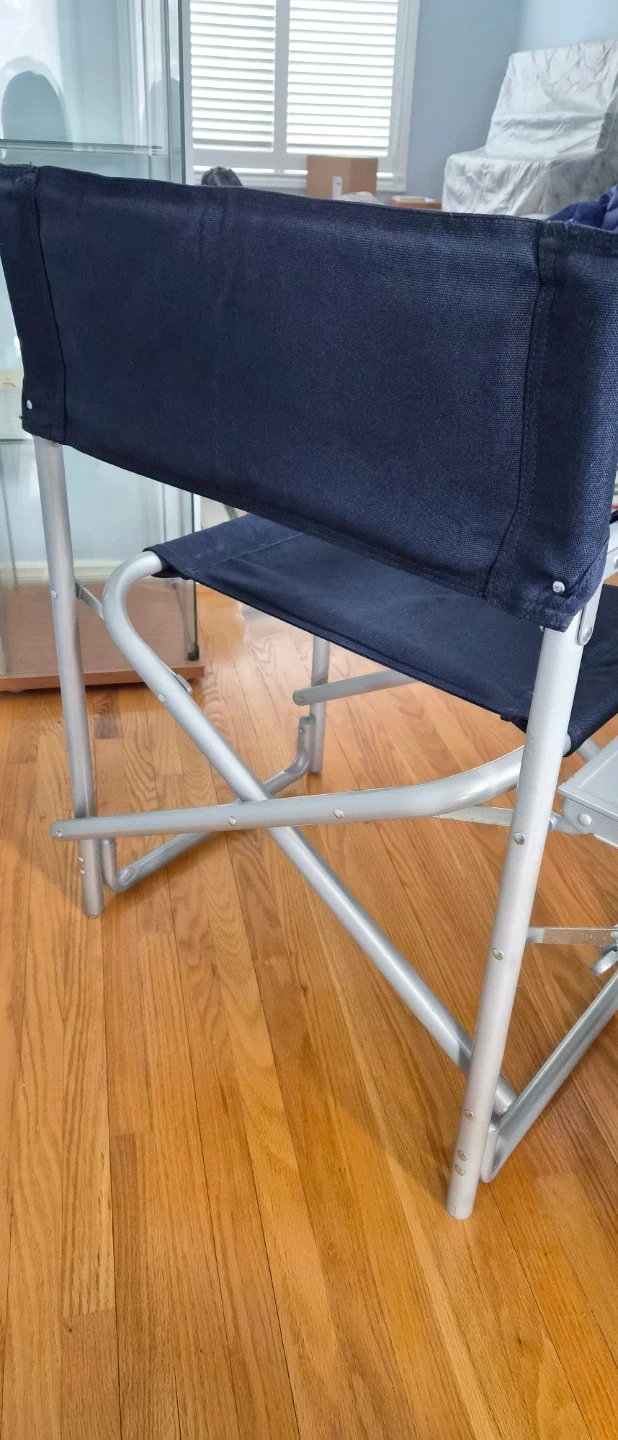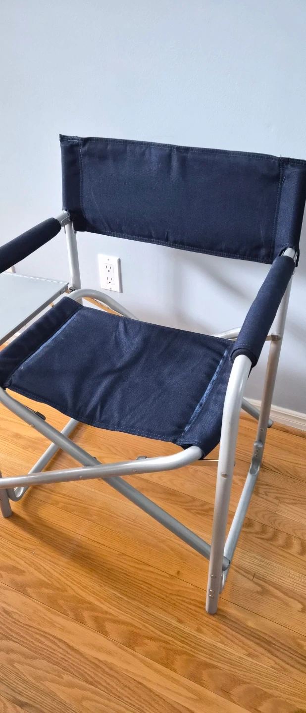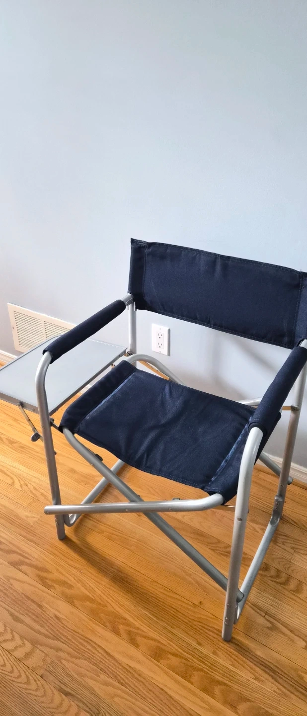 Very sturdy navy blue folding director's chair with a silver side tray. It's made with durable fabric and a metal frame. Great for camping or patio use!