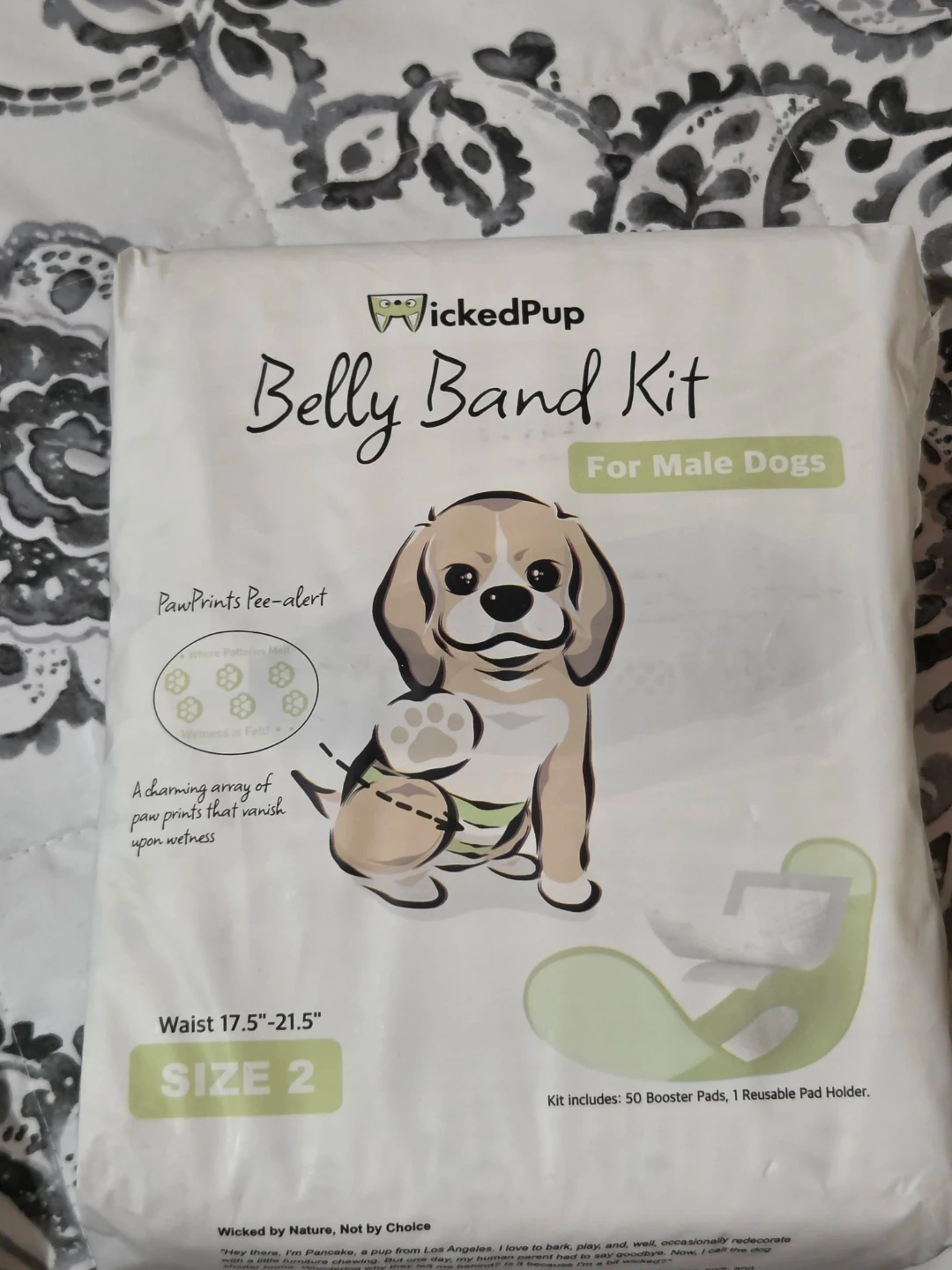 This set includes 50 disposable booster pads and 1 reusable pad holder, designed for male dogs with waist sizes between 17.5" and 21.5". The belly bands feature adorable paw prints that fade when wet, making it easy to know when itโs time for a change.