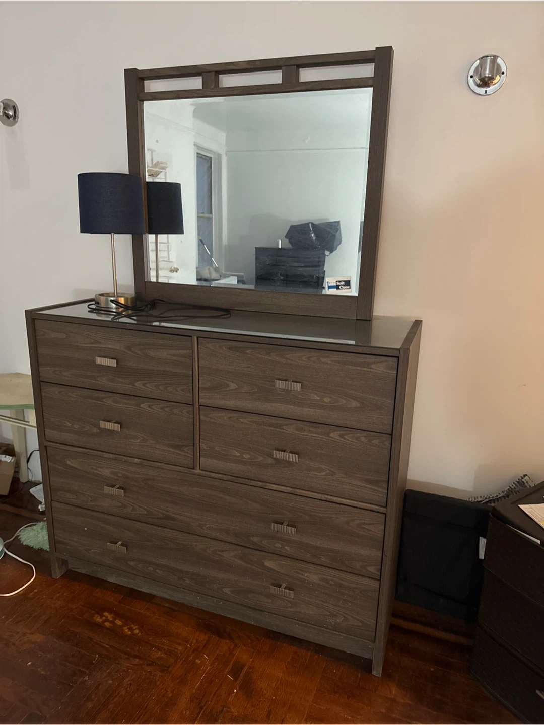 This dresser features a dark brown wood finish and a large attached mirror. Multiple drawers for storage. PICK UP ASAP - ADDRESS 239 E 242nd IN THE BRONX.