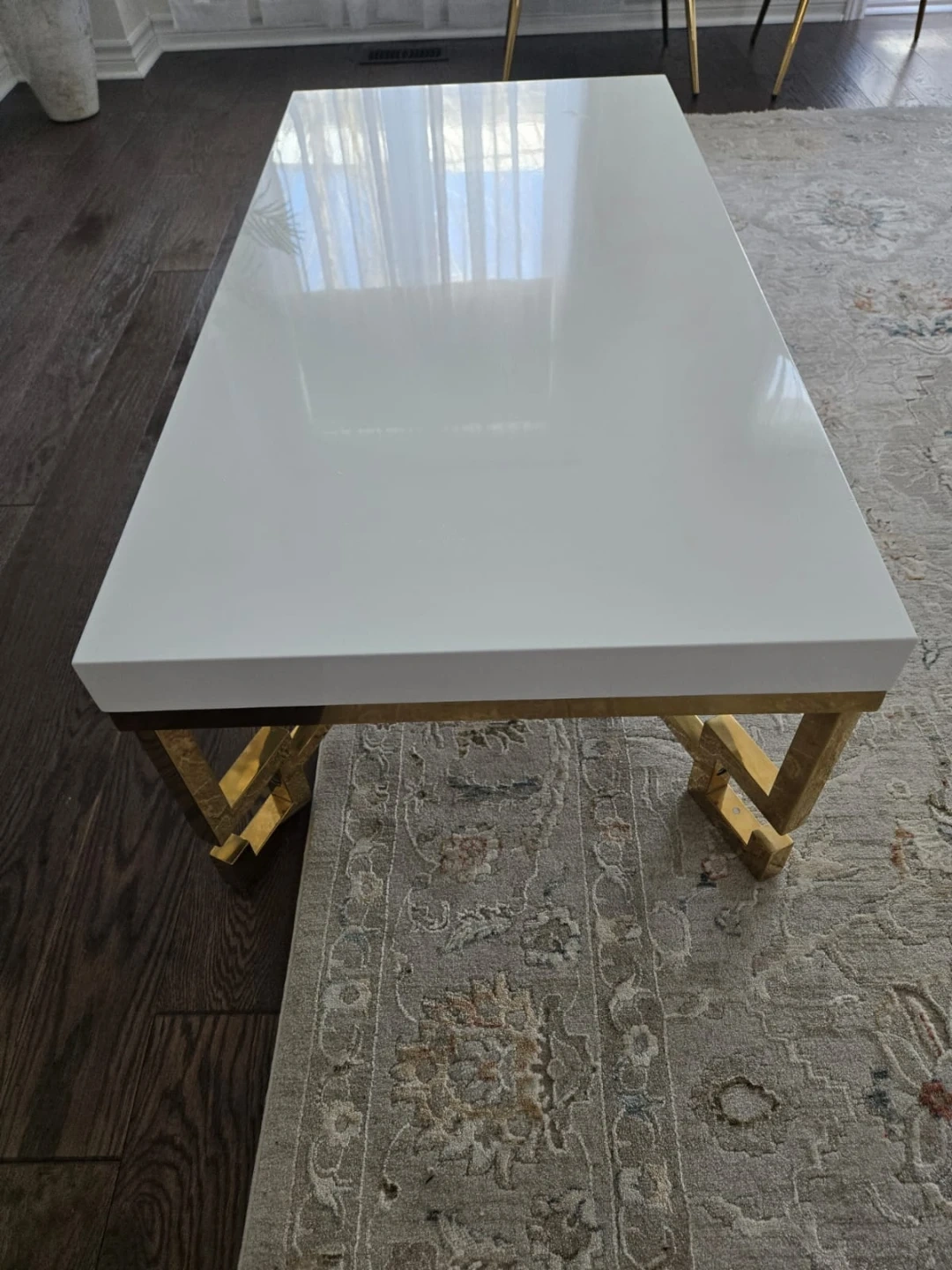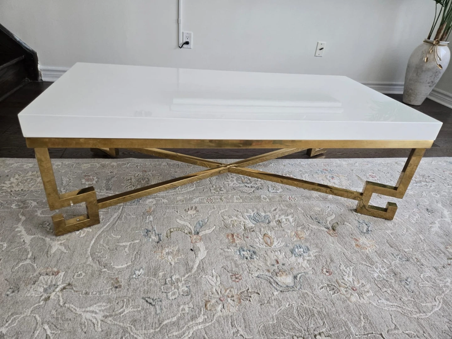 Elevate your living space with this chic and stylish coffee table! This used coffee table features a sleek white top and a striking gold base, making it a perfect centrepiece for any modern living room. Its design adds a touch of elegance and sophistication.