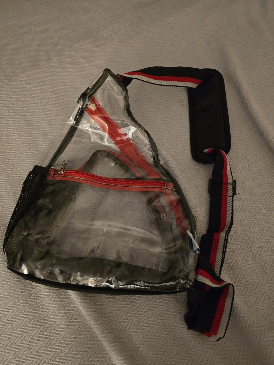 This clear sling bag features a main zippered compartment and a front zippered pocket. It has red zipper pulls and trim, with black mesh side pockets. The adjustable strap has a padded shoulder rest.