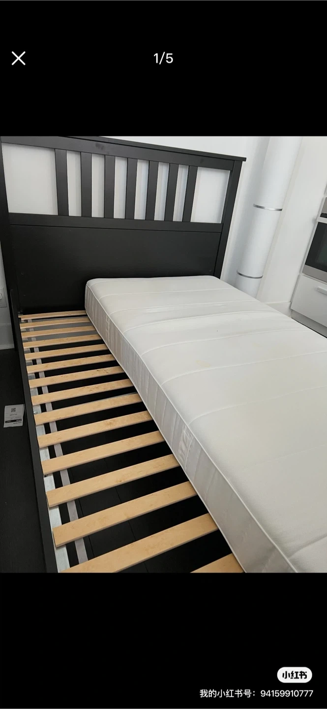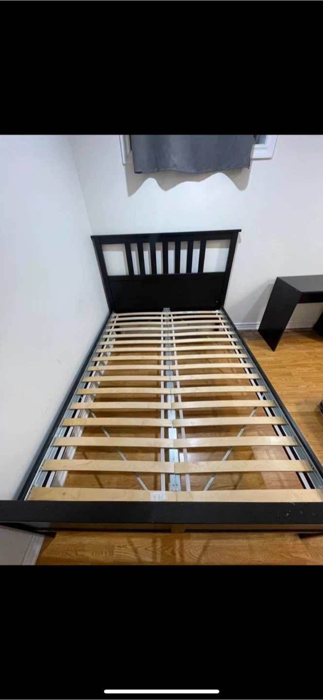 Black twin bed frame with a slatted base. Sturdy metal frame with wooden slats. Includes headboard and footboard. Mattress not included.