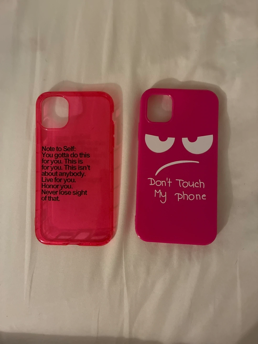 This bundle includes two pink phone cases. One case has a 'Don't Touch My phone' design. The other is clear with inspirational text inside. Cases fit a phone with a triple-lens camera cutout.