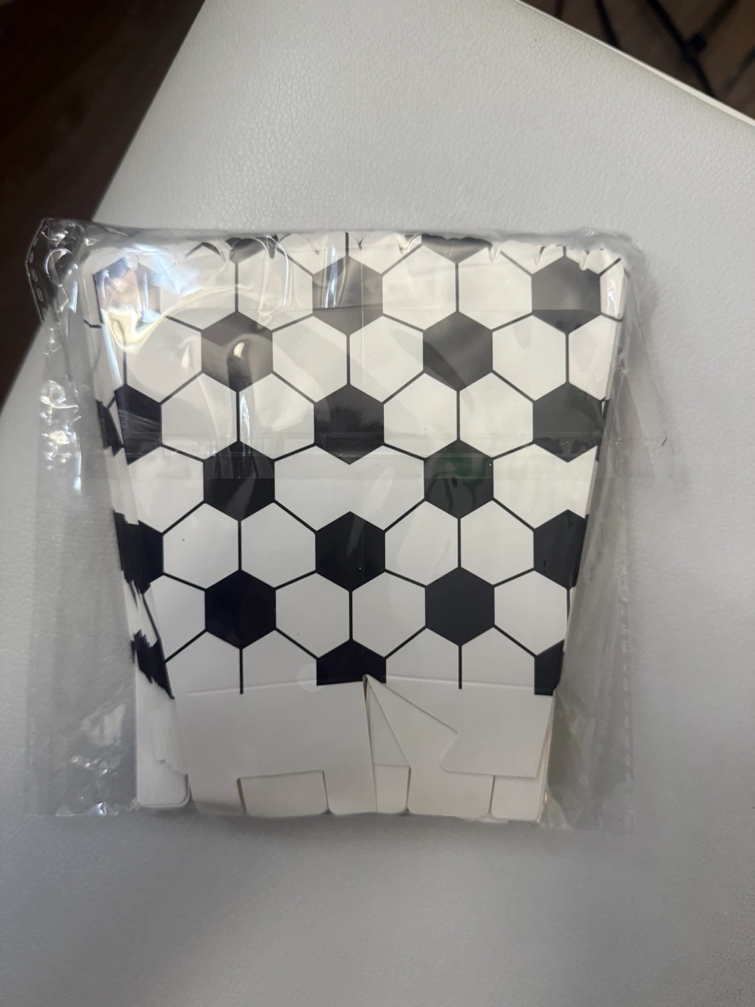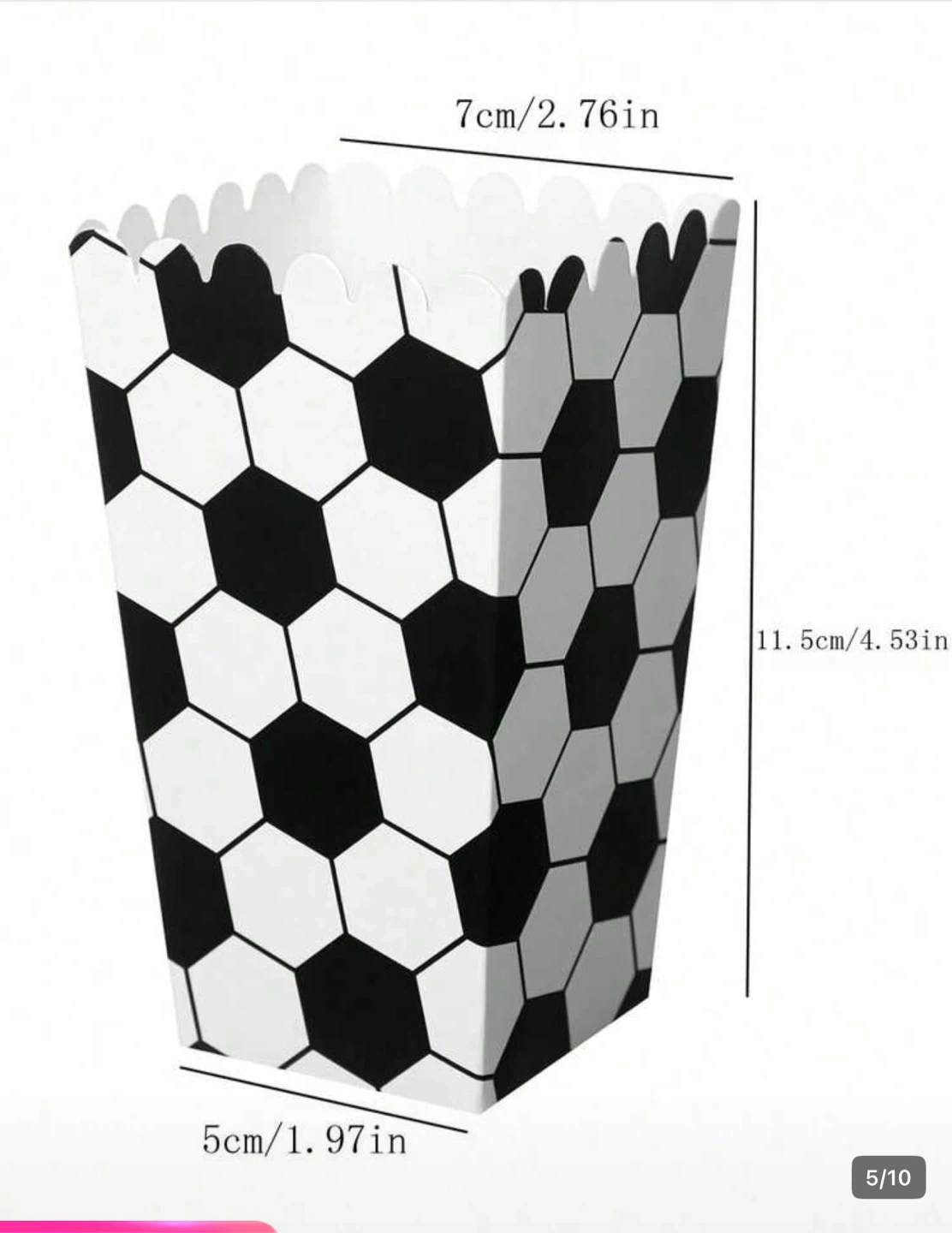 These popcorn boxes feature a fun soccer ball design. They measure 11.5cm high with a top opening of 7cm and a bottom of 5cm. Perfect for birthday parties or game day snacks!