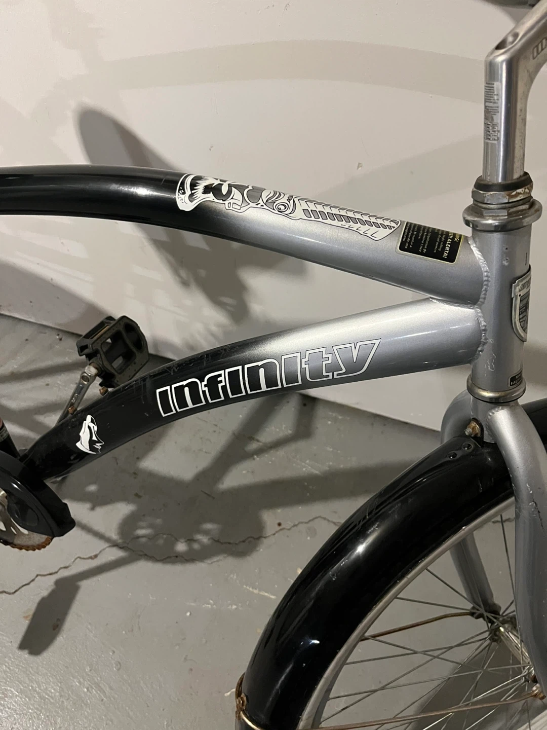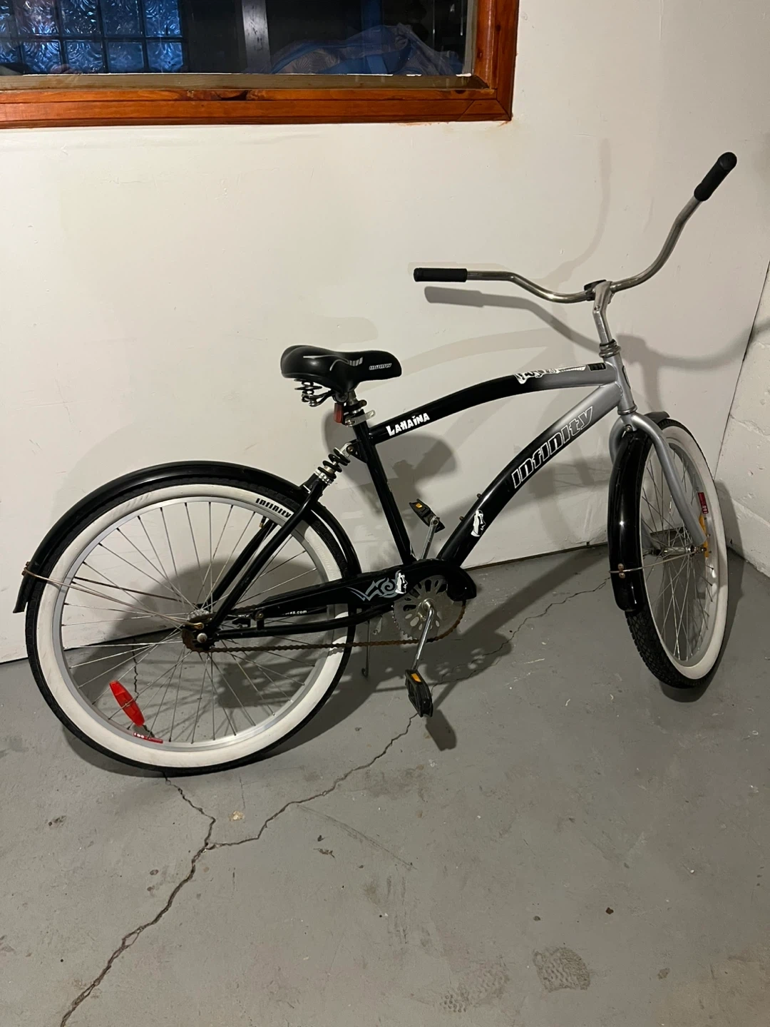 Infinity "Lanai" cruiser bicycle 26”.It's black and silver with white-wall tires and everything is working great .This bike offers a comfortable ride for cruising around town!