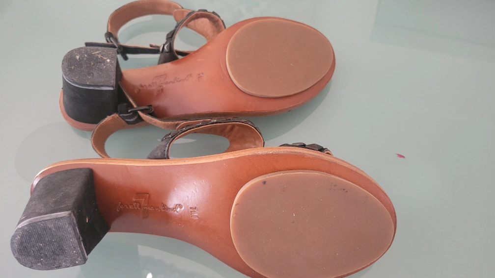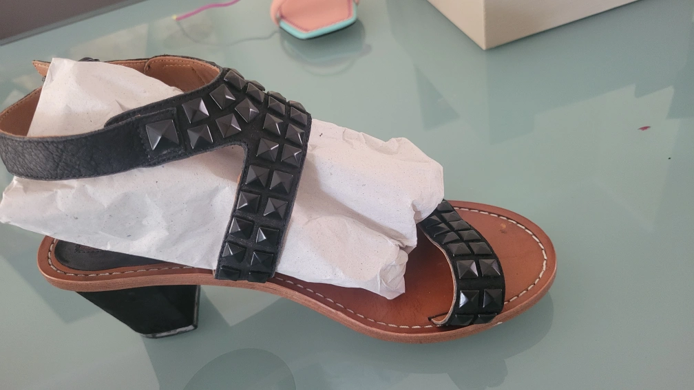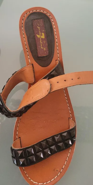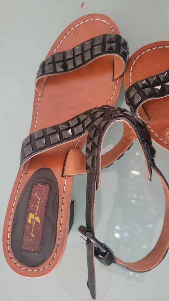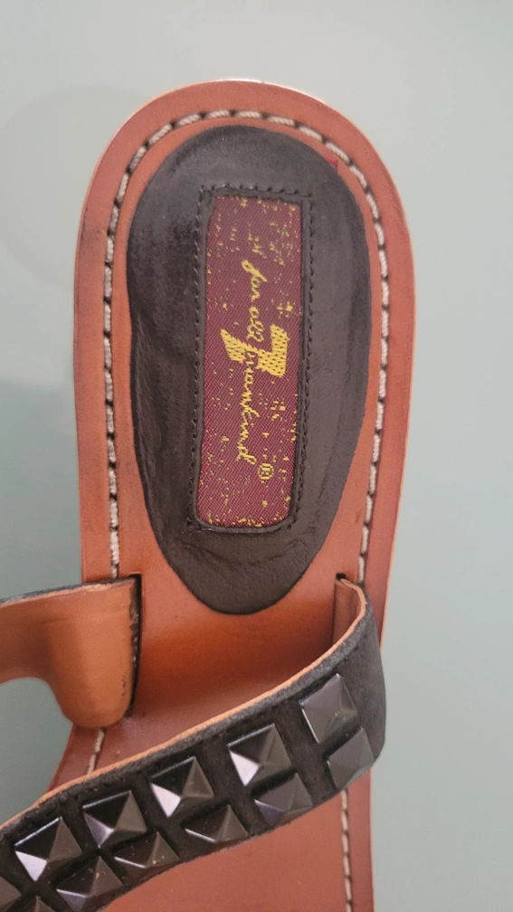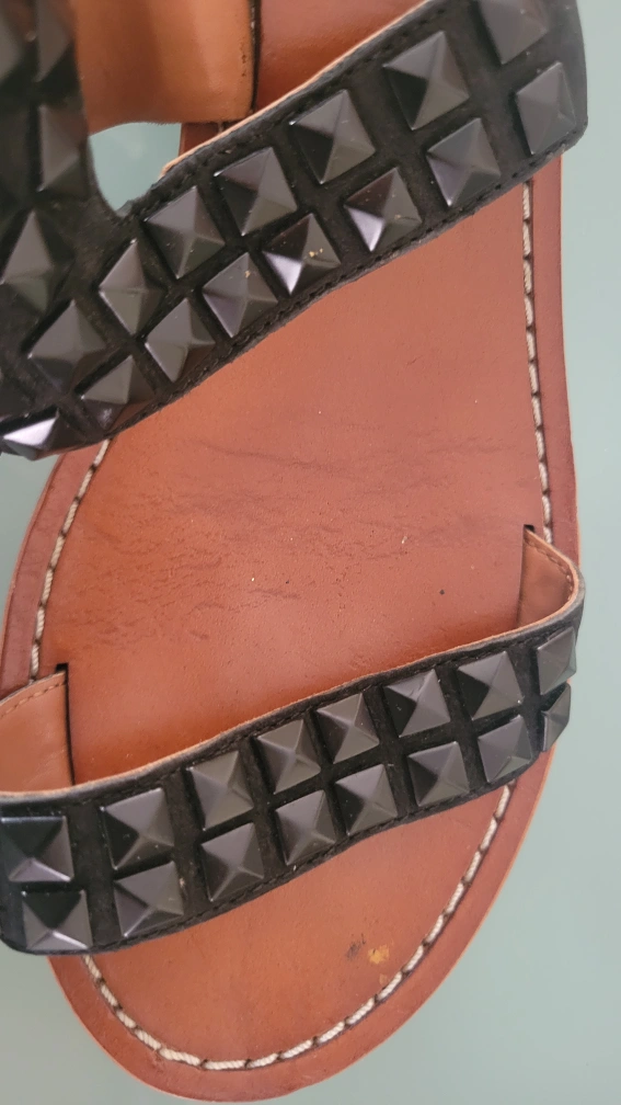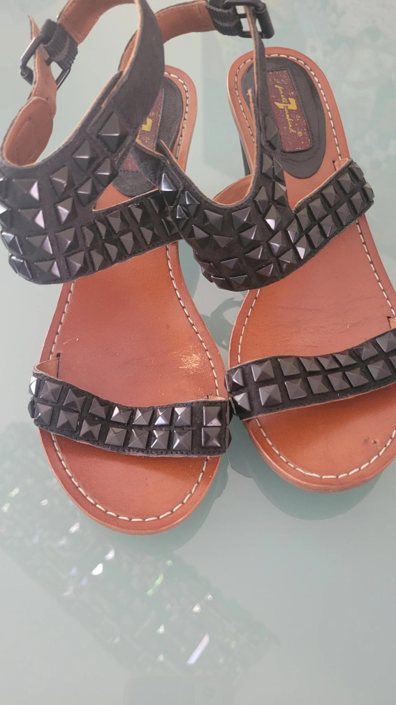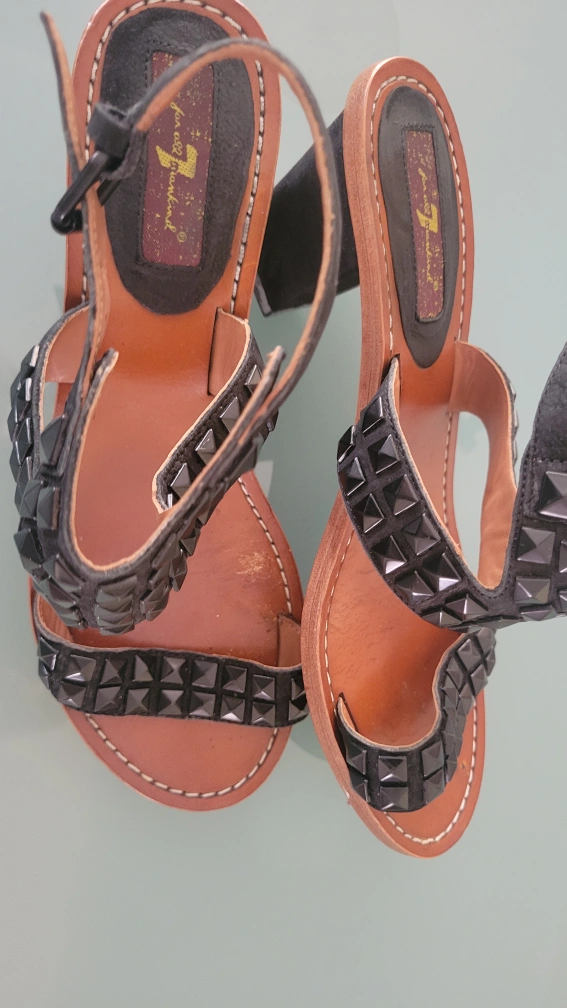 These 7 For All Mankind sandals feature black studs on the straps. They're made of leather with a brown sole and a small heel. A stylish addition for warmer weather!