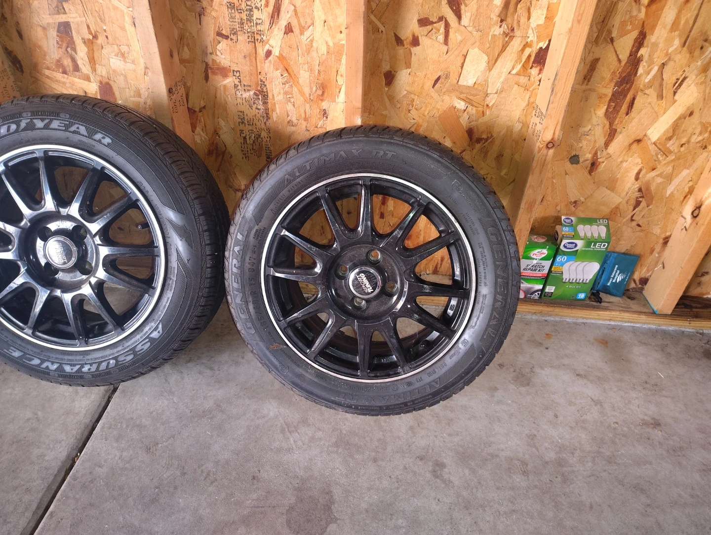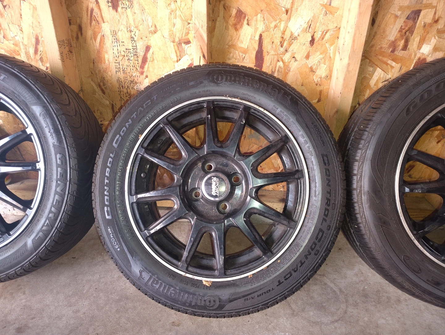 Set of four black alloy wheels. Includes Continental Control Contact Tour A/S tires. Tires are 225/60R17 99T. Wheels have a 5-spoke design. Ready for a new vehicle!